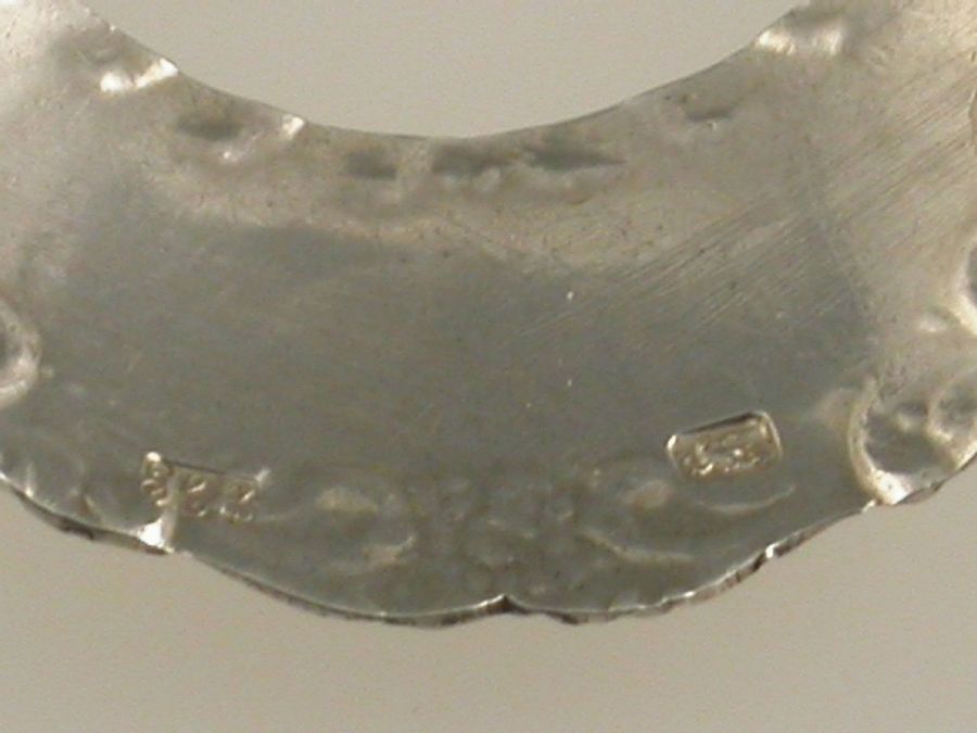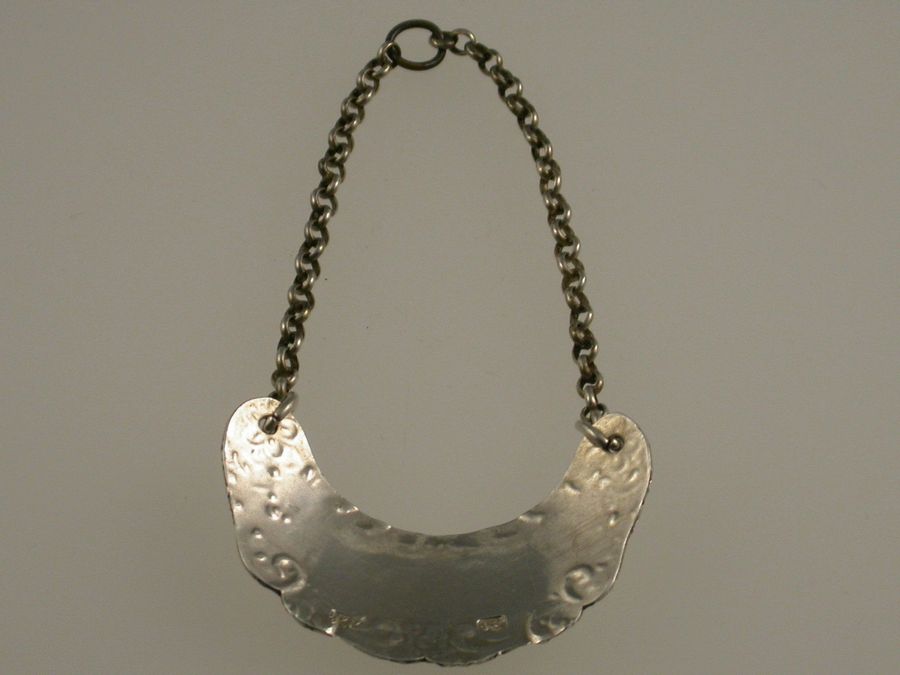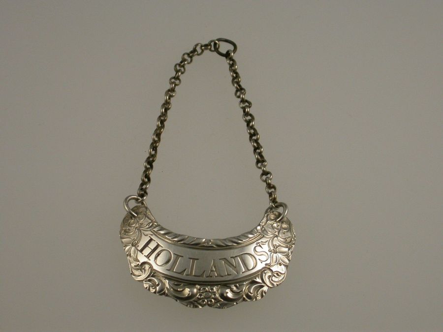 A rare George III 18th century silver Wine Label of shaped crescent form with gadrooned and foliate scroll border, the eyelets pierced through the centre of flower heads, incised for Hollands.