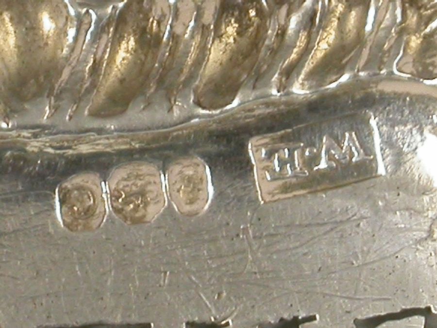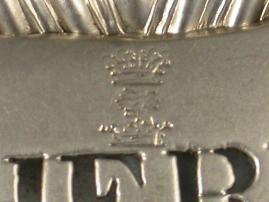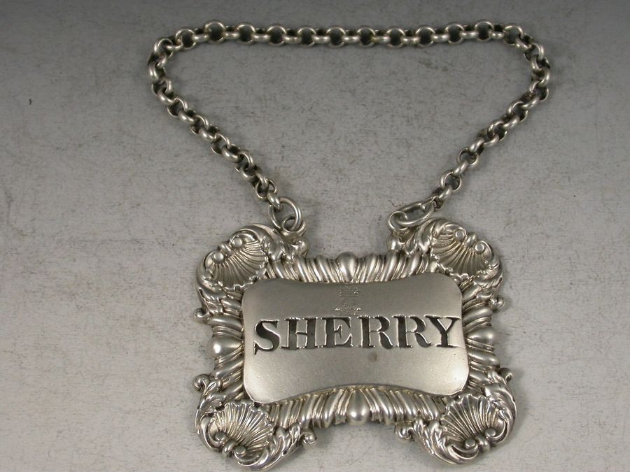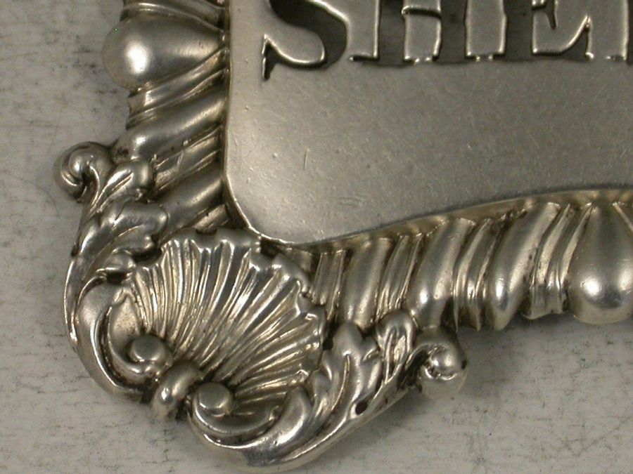 An unusual George III silver Wine Label of larger than average size, of shaped rectangular form with gadrooned border and a shell to each corner, pierced for Sherry below an engraved crest of a tree issuing out of a Ducal Coronet below an Earls Coronet.