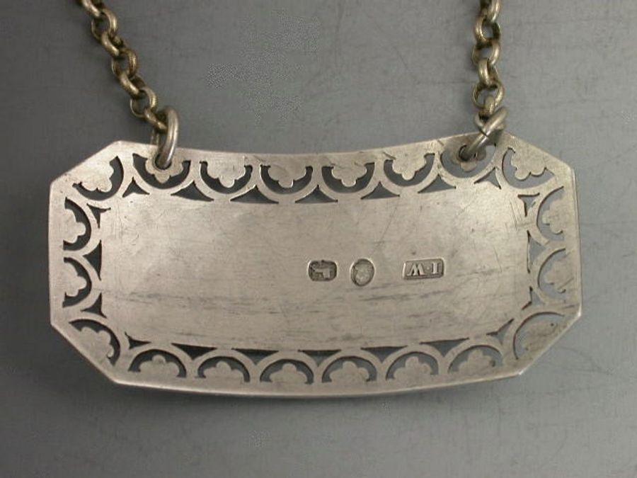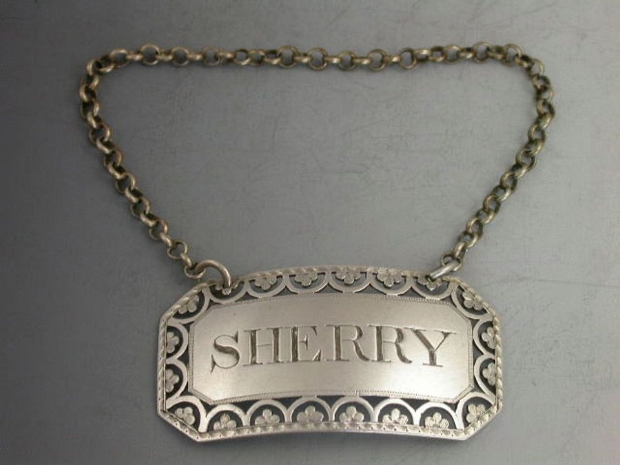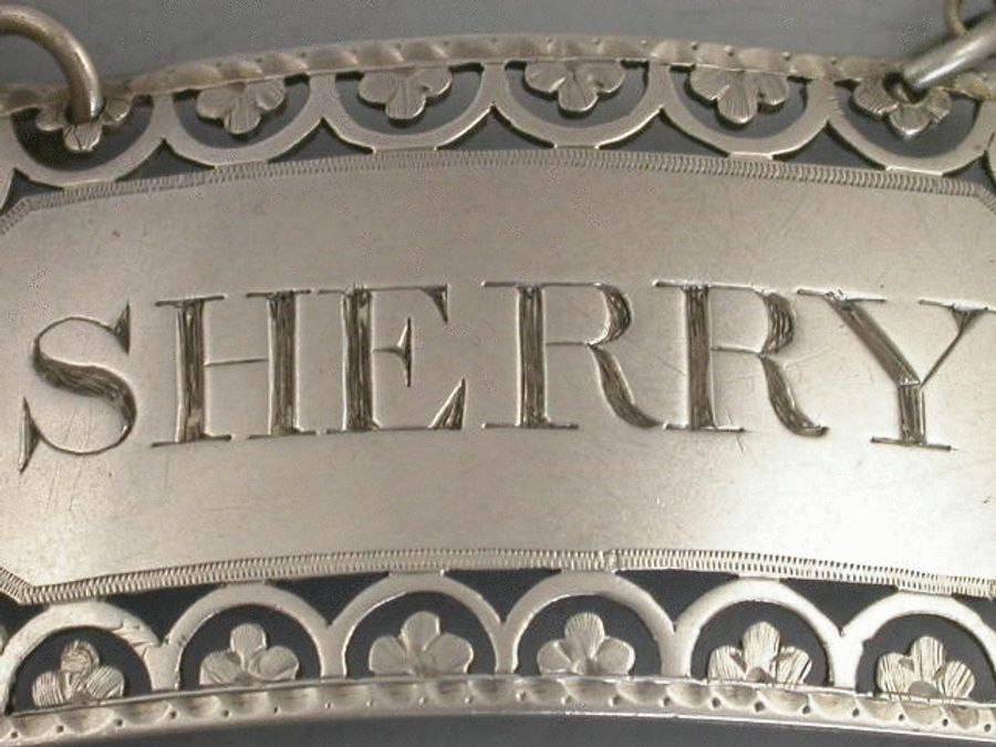 A fine George III silver Wine Label of rectangular form with cut corners, the intricately pierced border of hoops and trefoils with bright cut engraved decoration, incised for SHERRY.