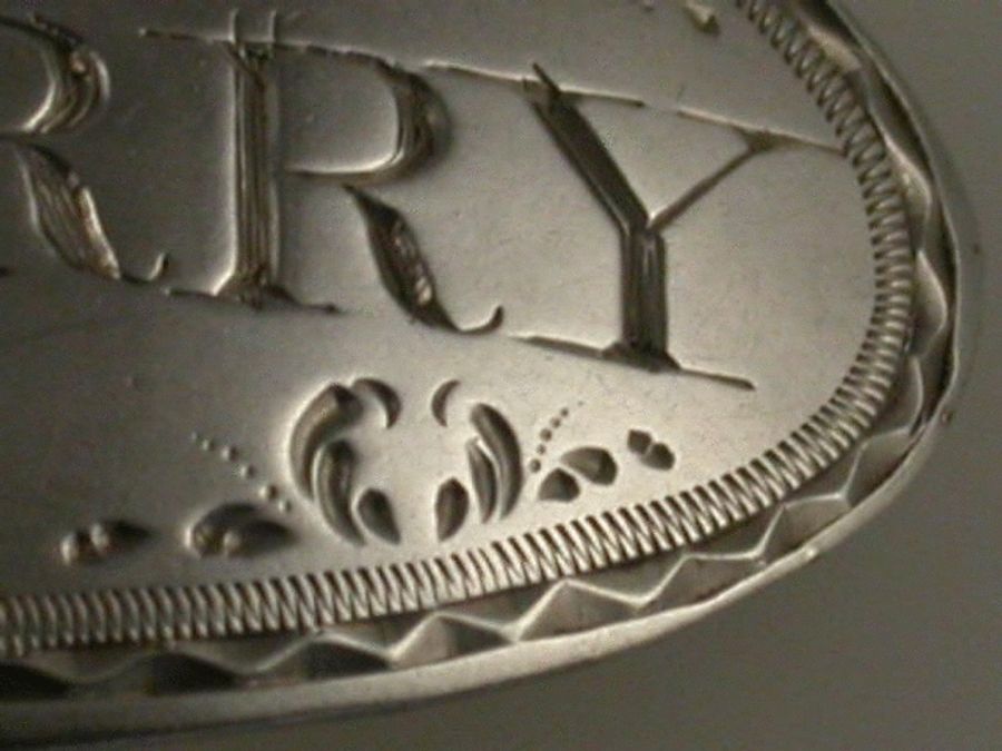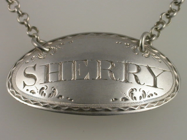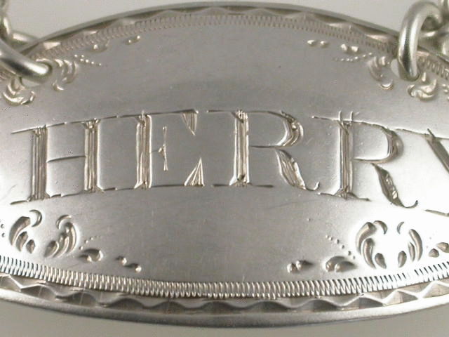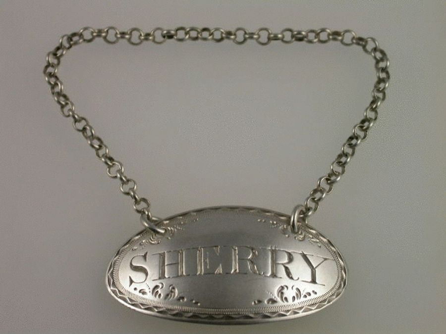 A fine George III silver Wine Label of oval form with bright cut engraved border and foliate devices, incised for SHERRY.