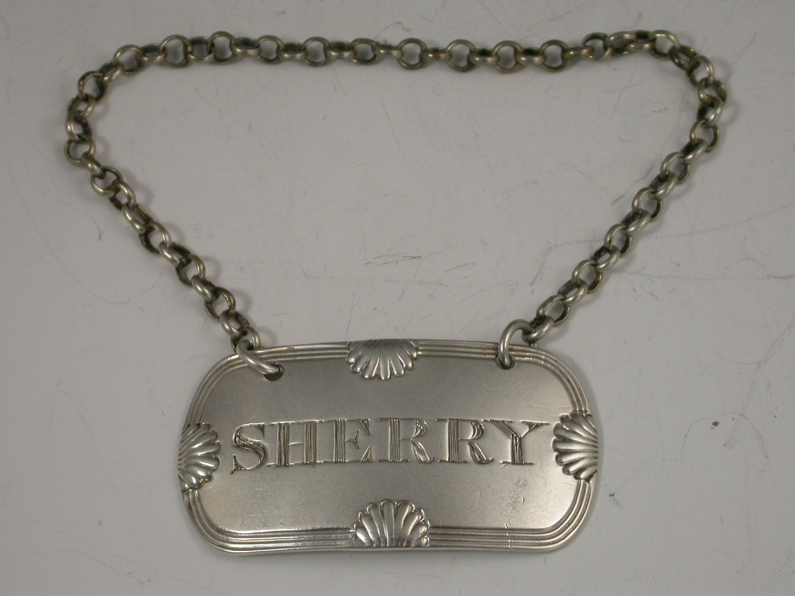 A George III silver Wine Label of rounded rectangular form with triple reeded border enhanced with four shells, incised for Sherry.