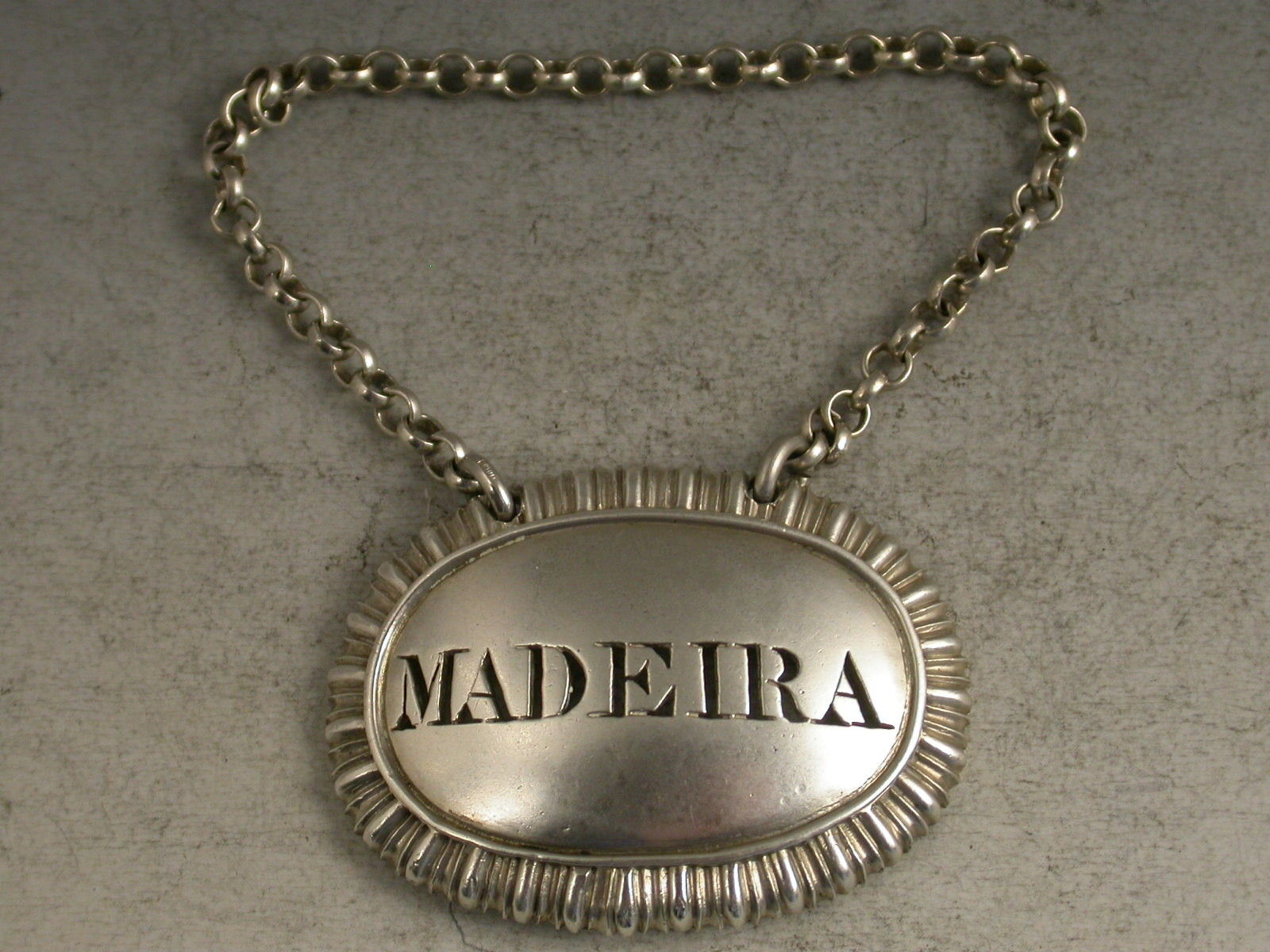A good George IV cast silver Wine Label of oval form with gadrooned border, pierced for Madeira.