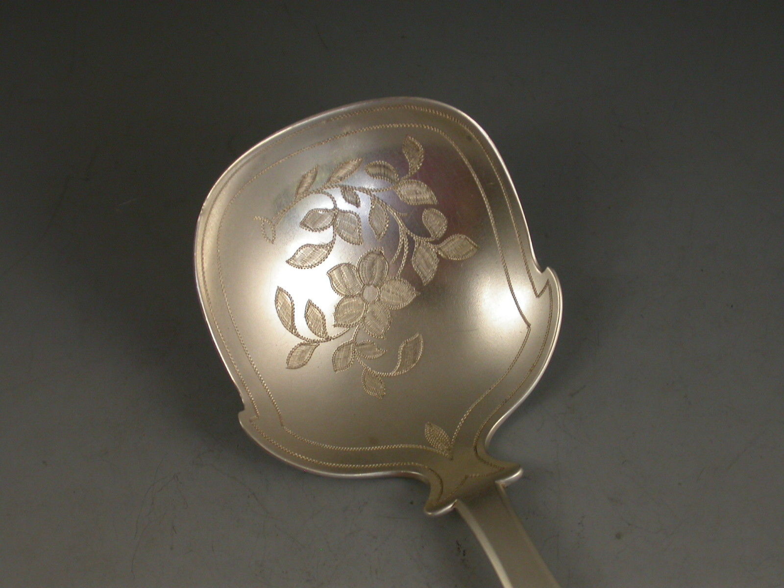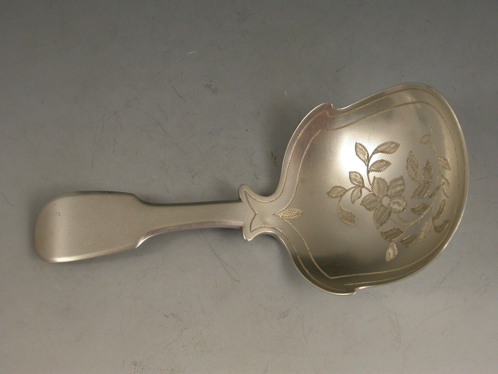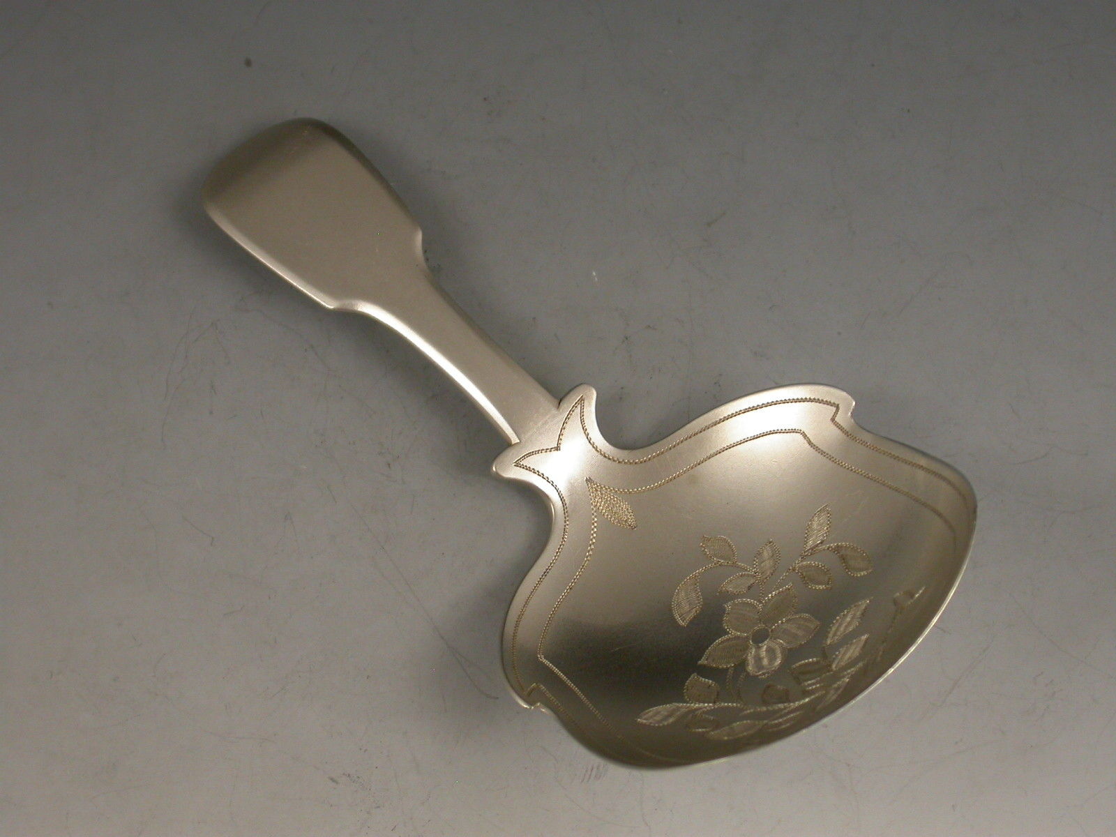 A good George IV silver Caddy Spoon with plain fiddle pattern handle and square shaped bowl with shoulders, bright cut engraved foliate spray to the bowl surrounded by prick-dot borders.