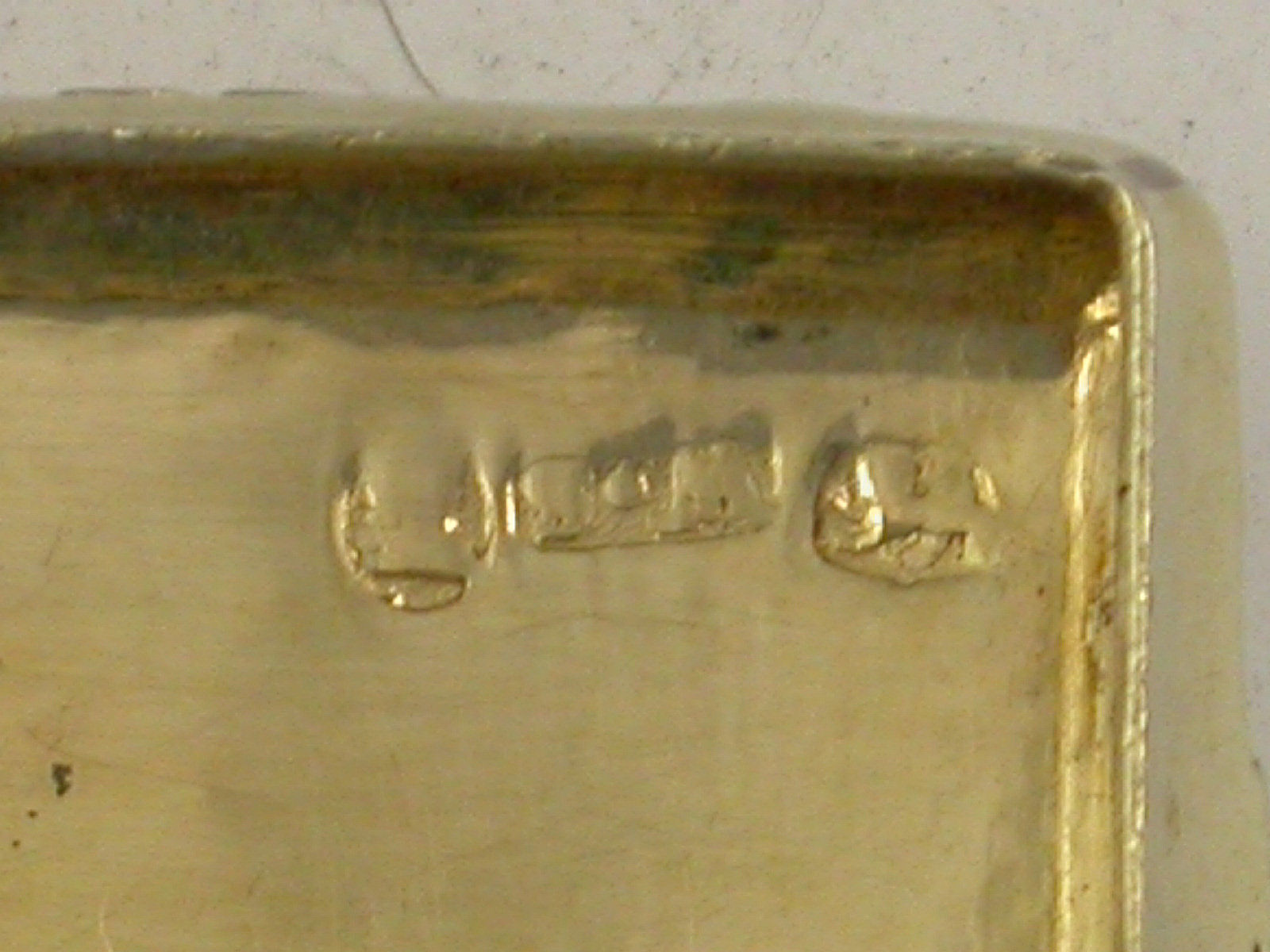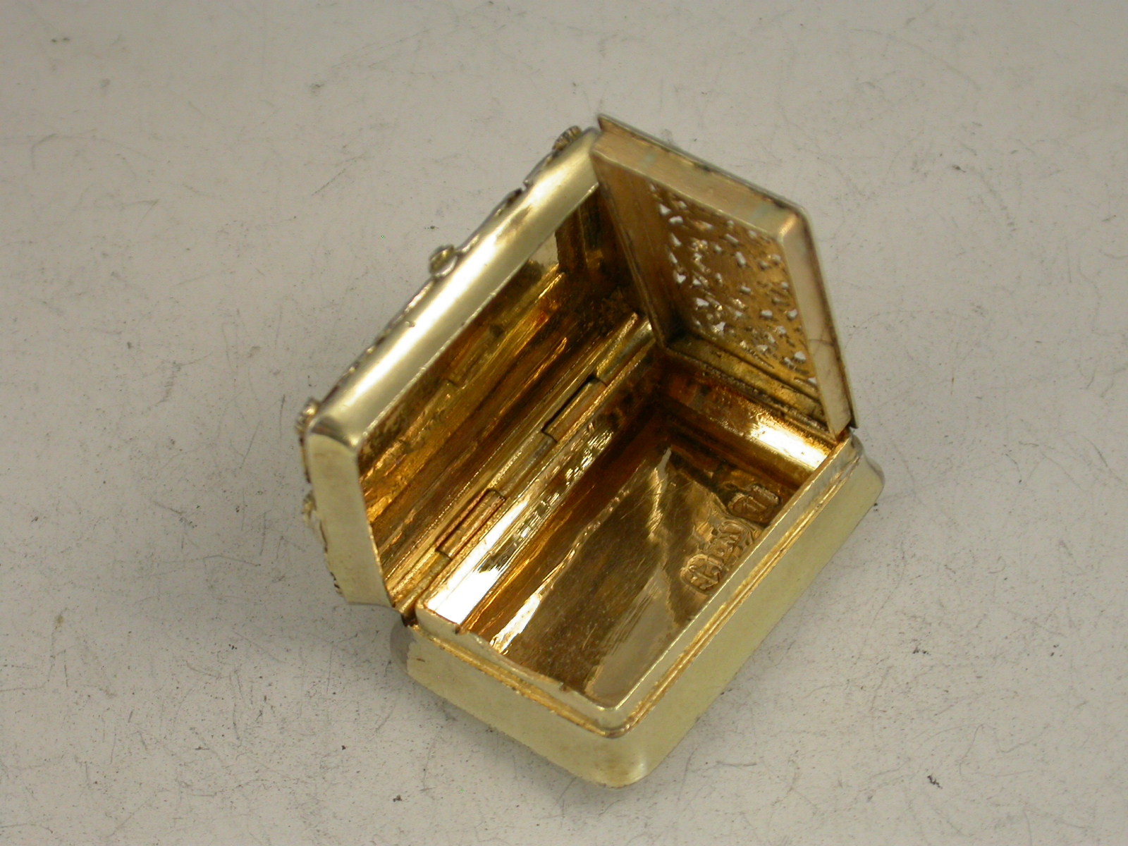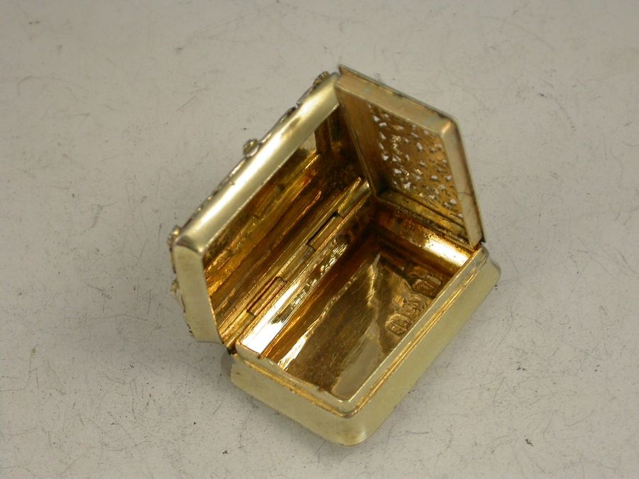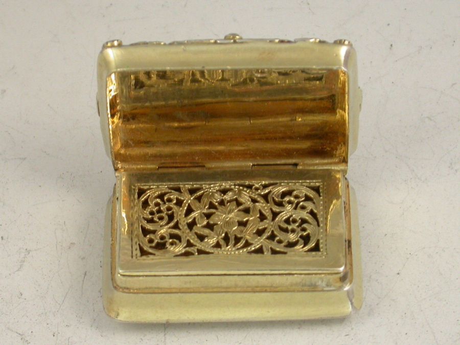 A fine and rare George IV silver gilt Vinaigrette of rectangular cushion shape, with engine turned decoration to the base and cover, a raised border of leaves and flower heads inset with a ruby at each corner, vacant rectangular cartouche to the lid, the silver gilt interior with intricately pierced grill.