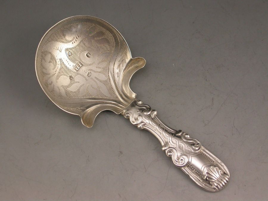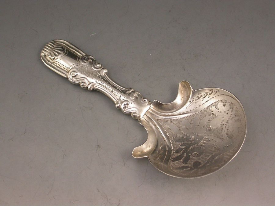 A good George IV silver Caddy Spoon, the semi-circular bowl with bright-cut engraved foliate decorations and protruding flutes at the base, the hollow handle in a variation of Kings pattern.