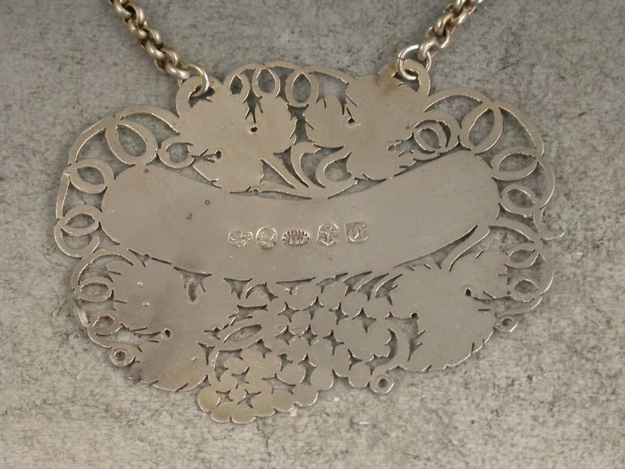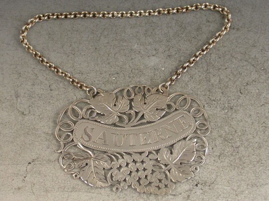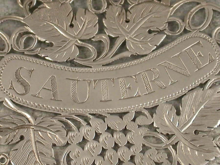 A very attractive George IV silver Wine Label, delicately pierced and engraved with vine leaves, grapes and vine tendrils surrounding the curved nameplate incised for Sauterne
