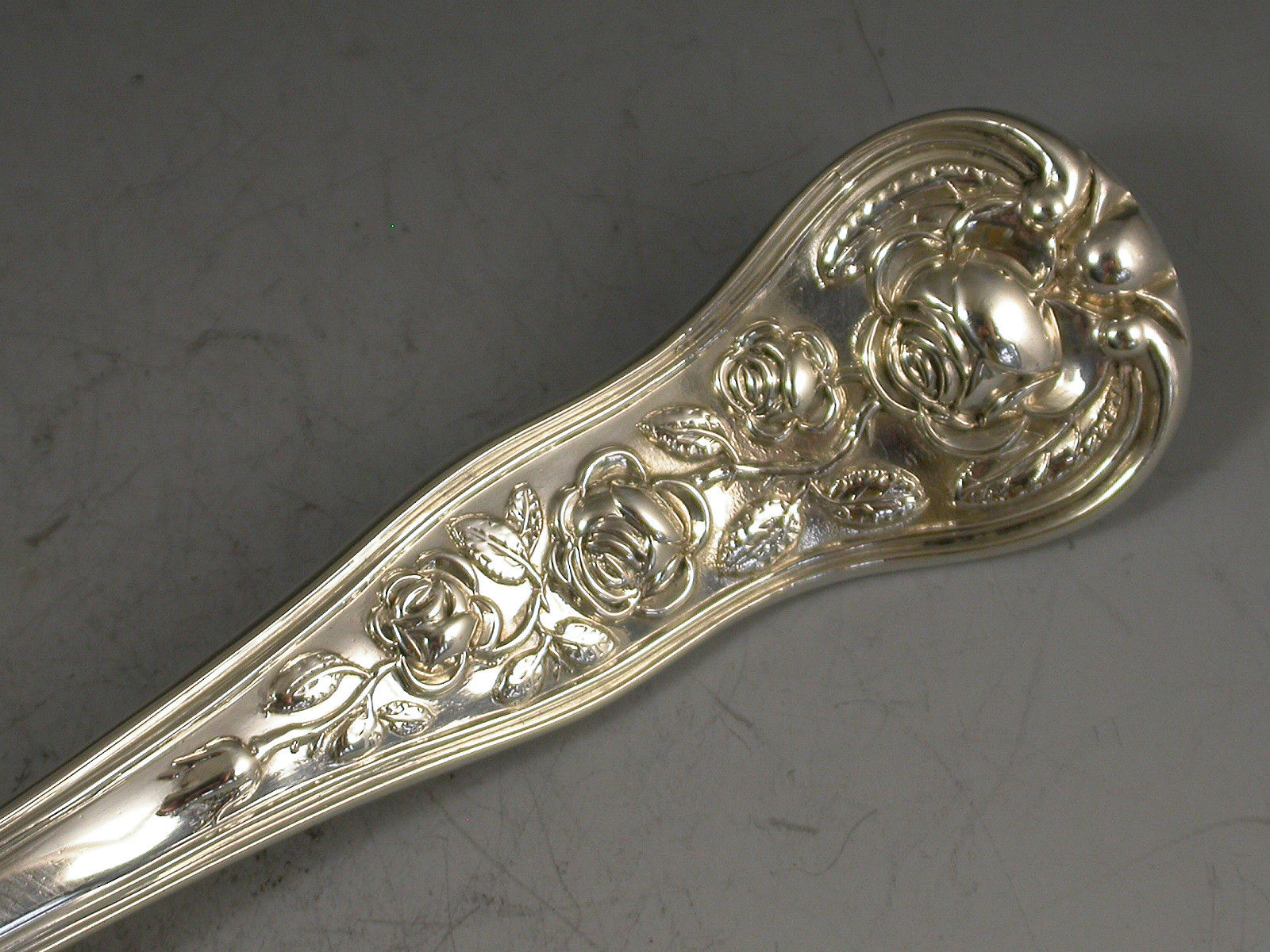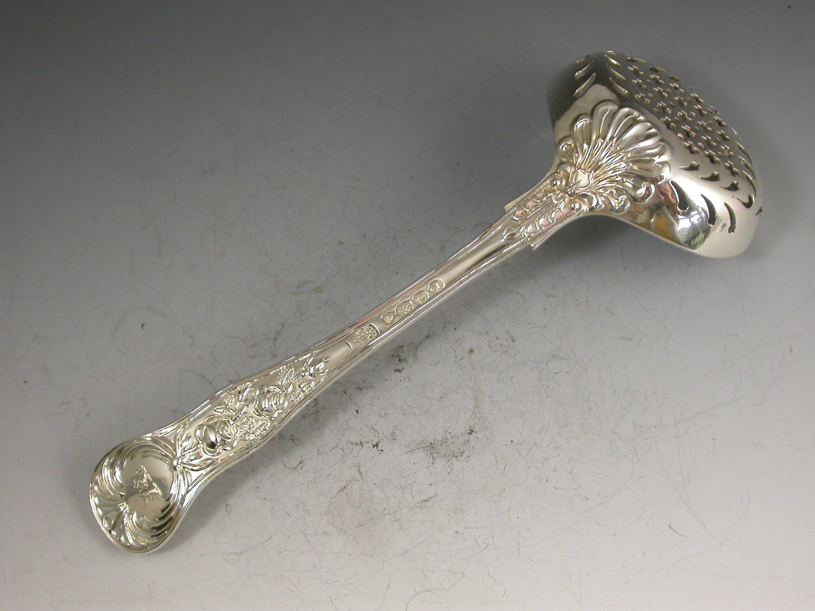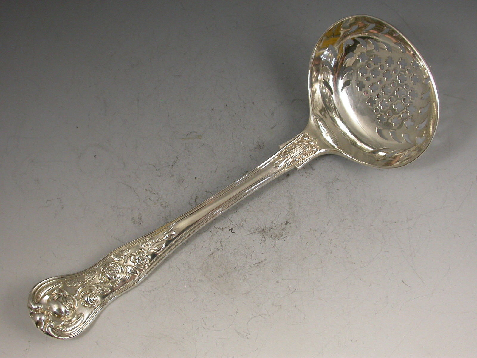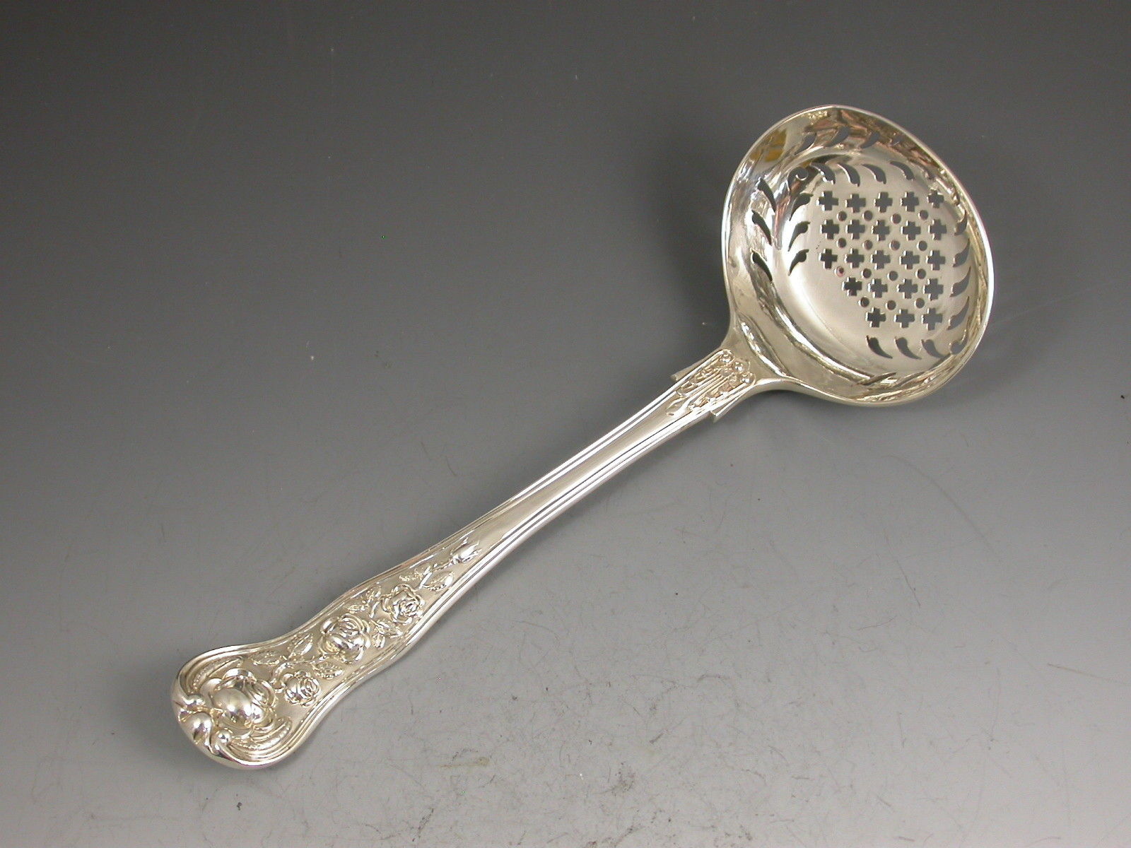 A fine quality and heavy George IV silver Sifter Spoon, the bowl pierced with crosslets and serifs, the handle chased with the scarce ""Rose pattern"". A cartouche to the reverse engraved with two crests.
