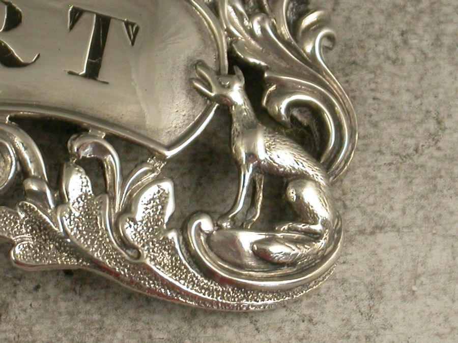 A rare George IV die-stamped silver Wine Label of pierced shaped rectangular form decorated with scrolls, vine leaves and grapes and with a seated fox at either end of the shaped name plate incised for Port.