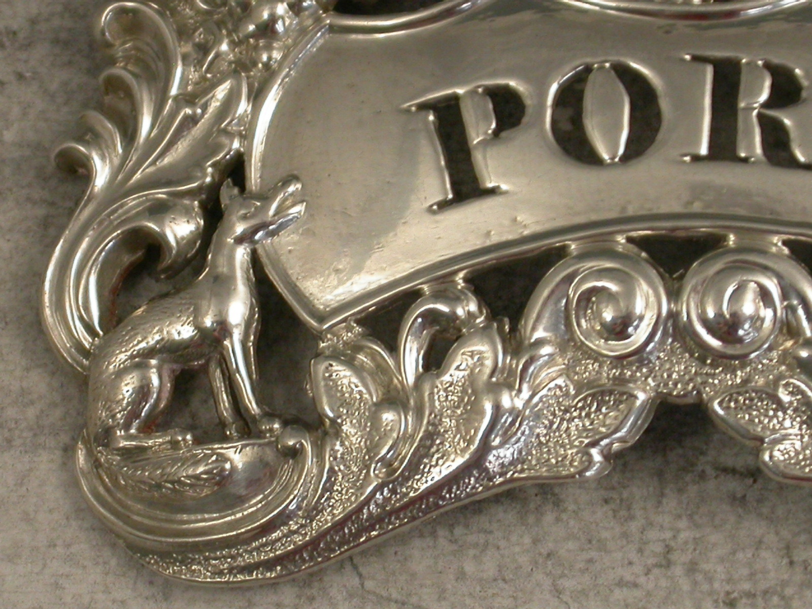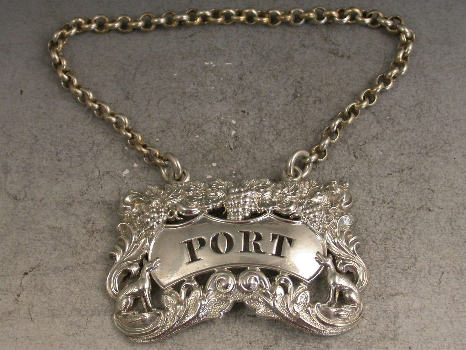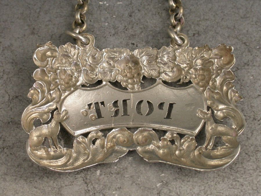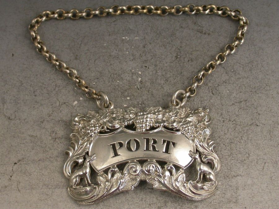 A rare George IV die-stamped silver Wine Label of pierced shaped rectangular form decorated with scrolls, vine leaves and grapes and with a seated fox at either end of the shaped name plate pierced for Port.