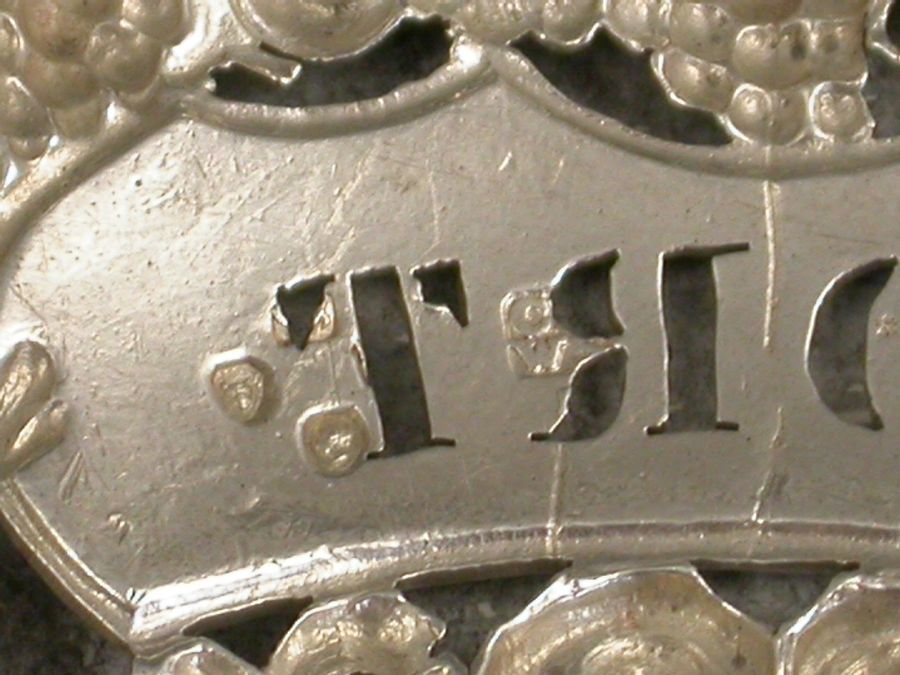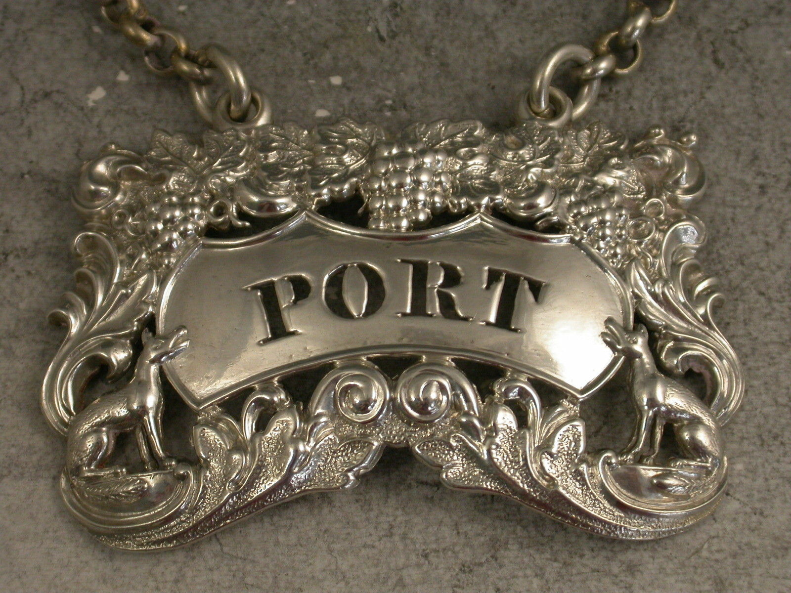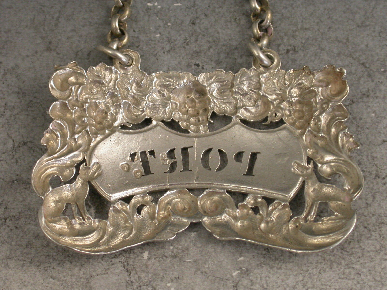 A rare George IV die-stamped silver Wine Label of pierced shaped rectangular form decorated with scrolls, vine leaves and grapes and with a seated fox at either end of the shaped name plate pierced for Port.
