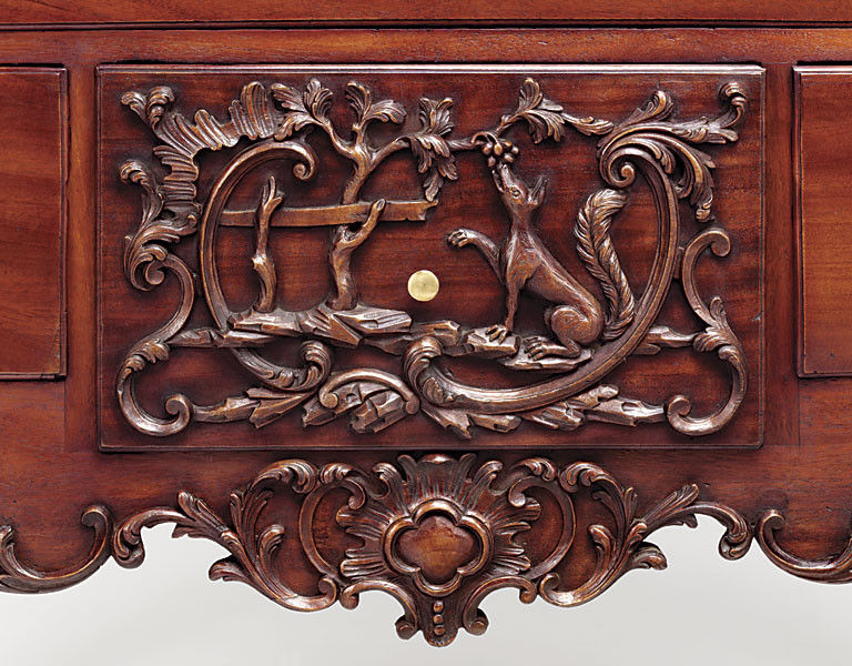 This design has become known as the ""Singing Foxes"" by Collectors, but it is more likely that the design inspiration was taken from Aesop's Fable of the Fox and the Grapes. See photograph of a wooden panel from an 18th century American chest of drawers, known as the ""Fox and Grapes Chest of Drawers"".