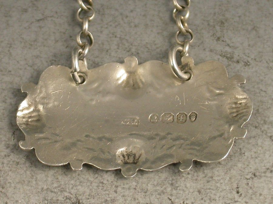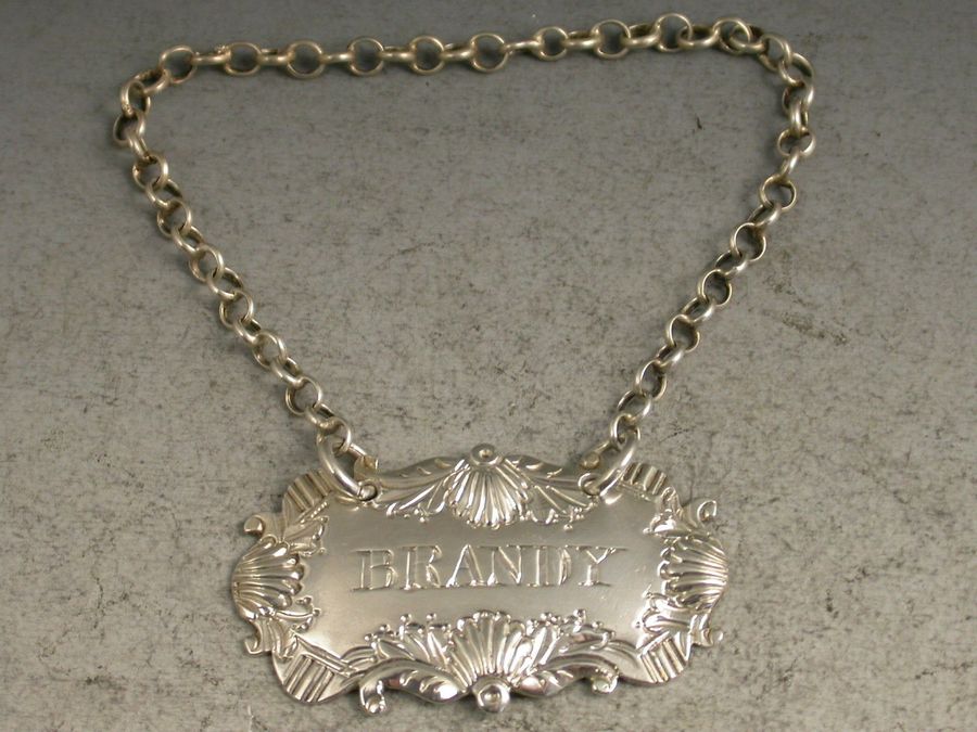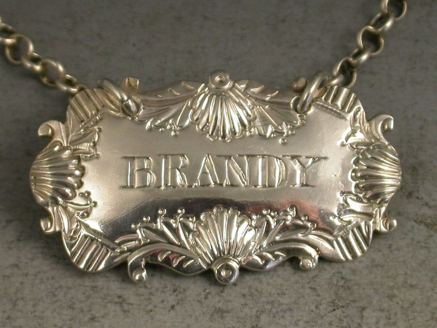 An unusual George IV cast silver Wine Label of shaped cartouche form, the scrolled border decorated with four shells, incised for Brandy.