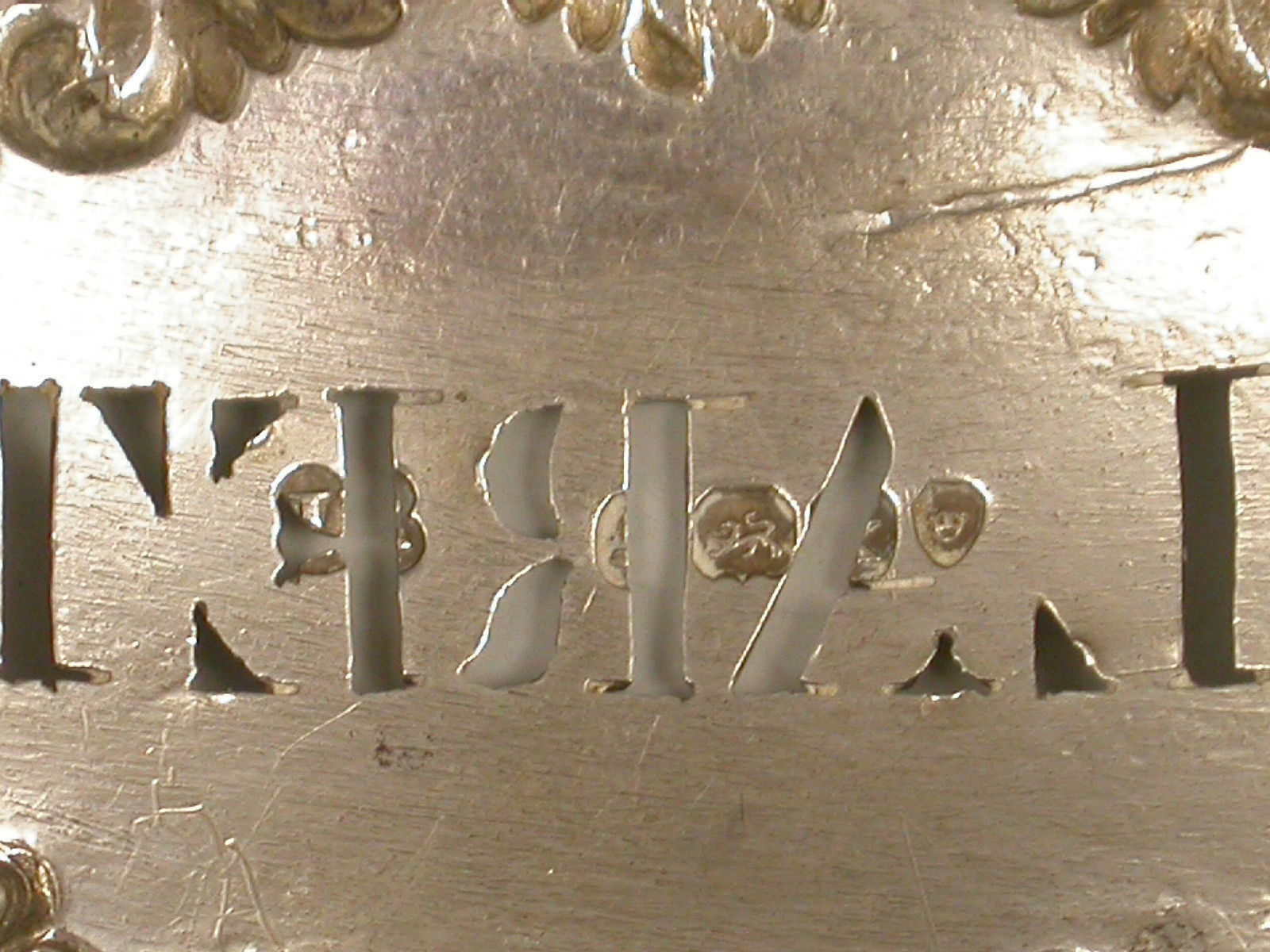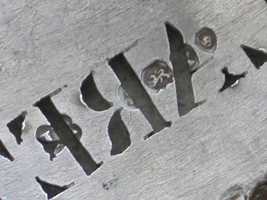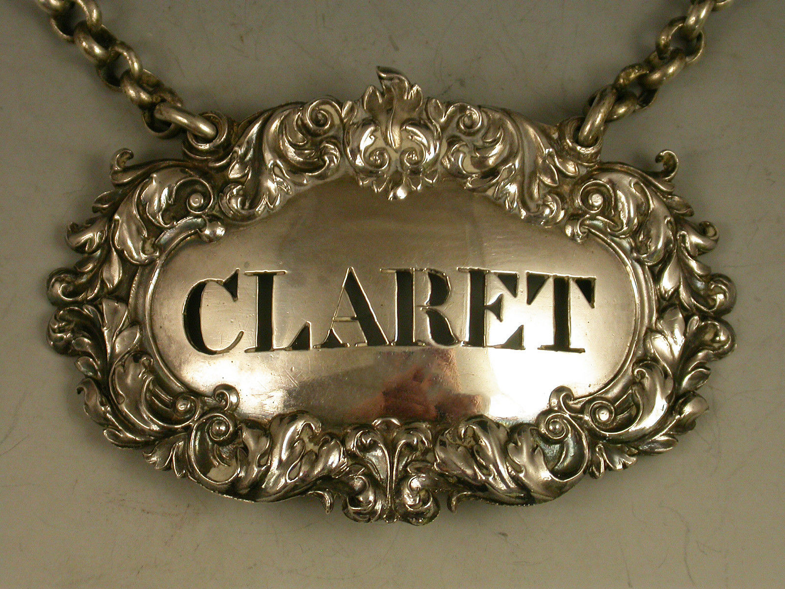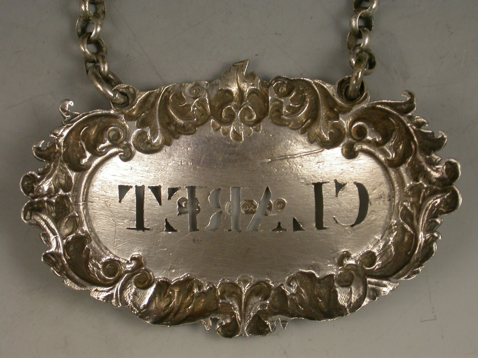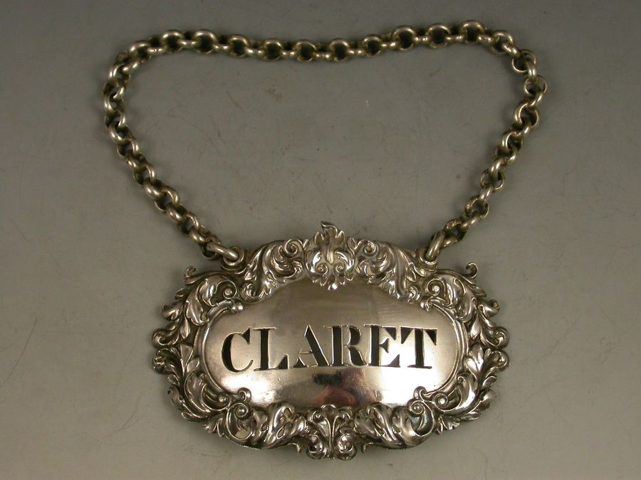 A slightly unusual George IV cast silver Wine Label of cartouche form with acanthus leaf and scroll border, pierced for Claret.