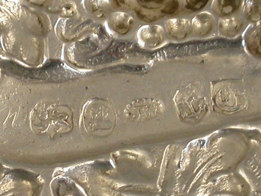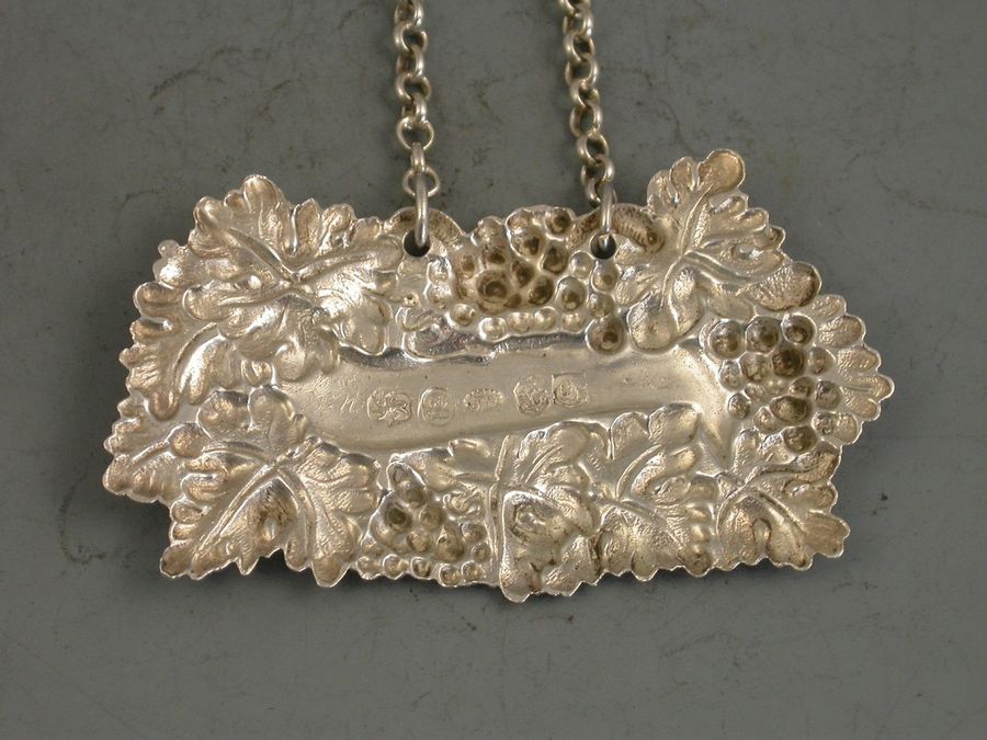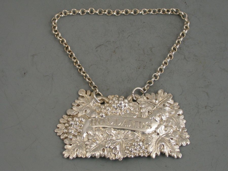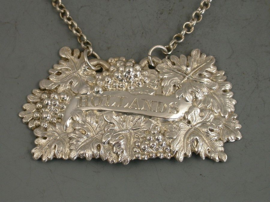 A George IV die-stamped silver Wine Label, the plain scrolled name plate incised for Hollands (Dutch Gin), surrounded by a border of entwined vine leaves and grapes.
