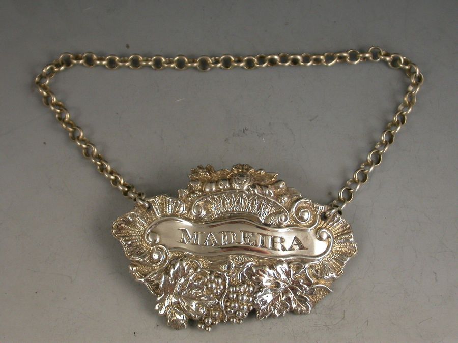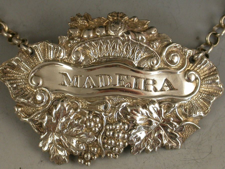 An unusual George IV die-stamped silver Wine Label of asymmetrical shape with a border of shells, vine leaves and grapes below a scrolled name plate incised for Madeira, a basket of fruit and flowers above.