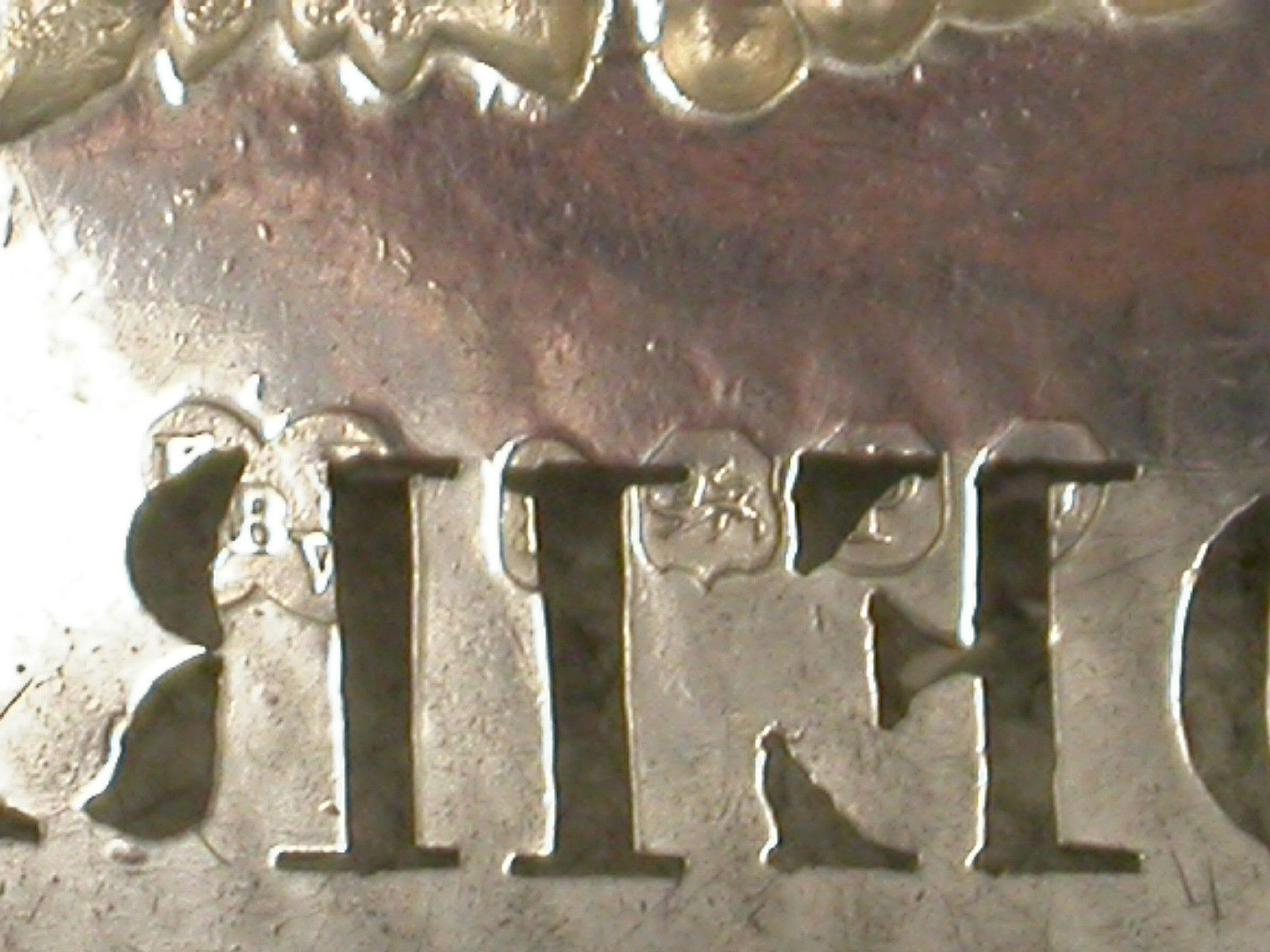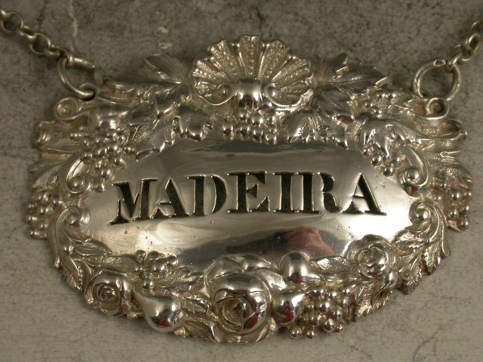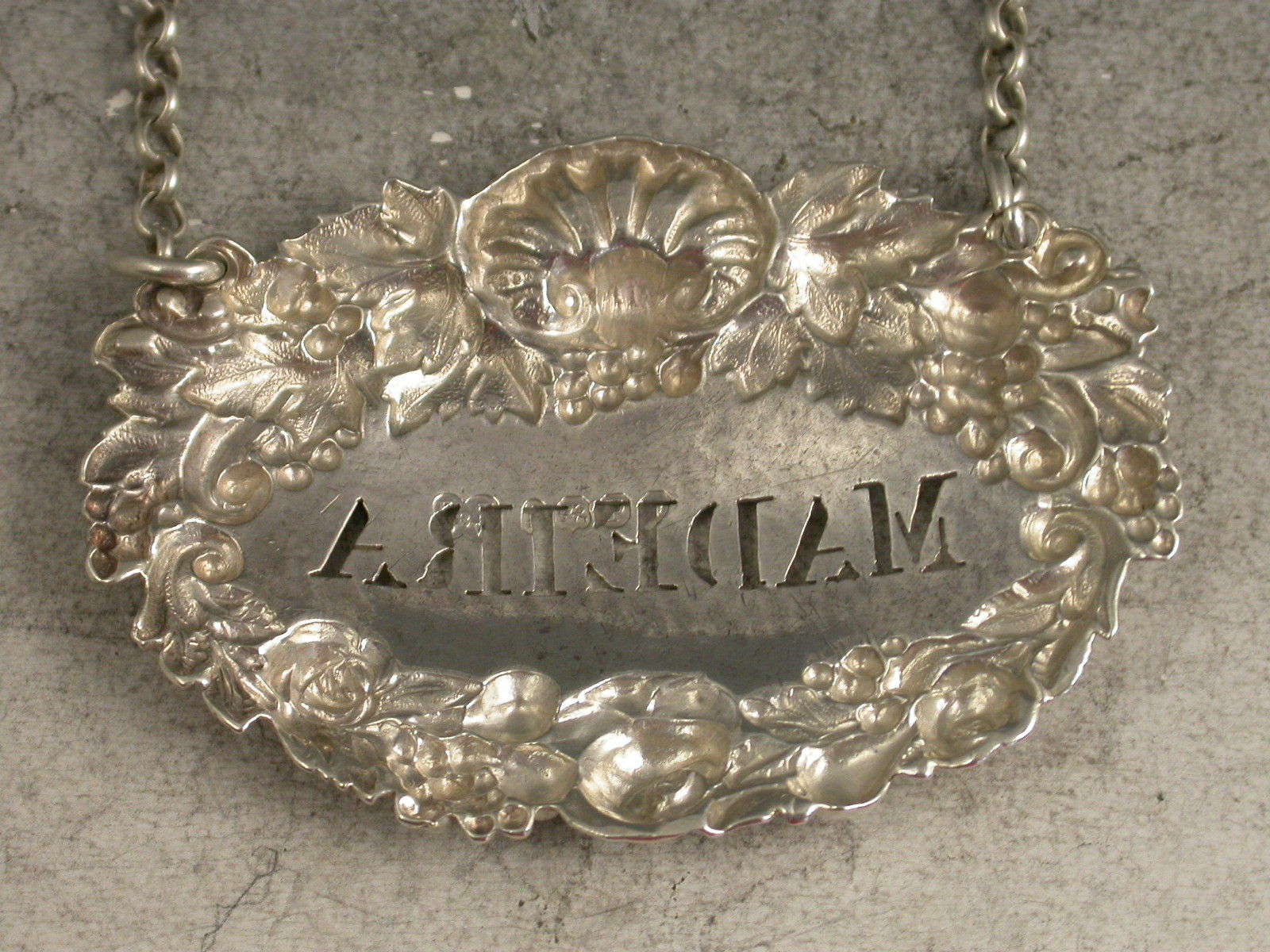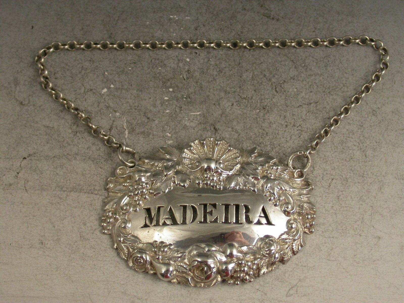 A George IV die-stamped silver Wine Label of shaped oval form the border with vine leaves, grapes, fruit and flower heads, surmounted by a shell, pierced for Madeira.