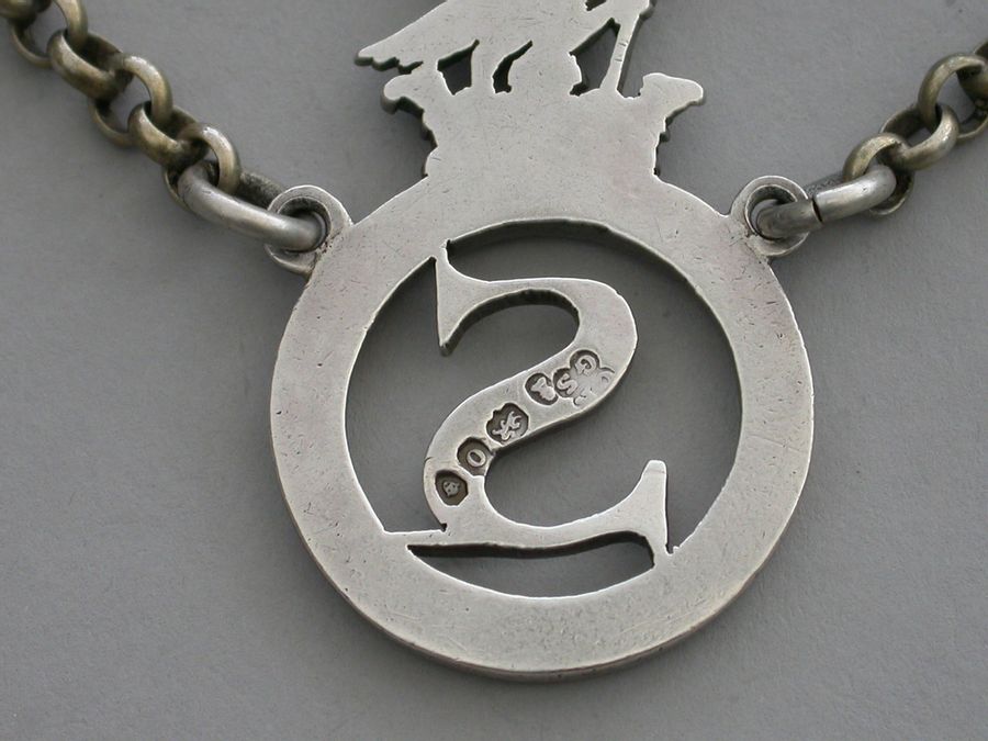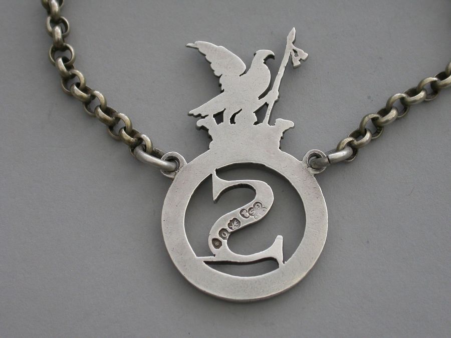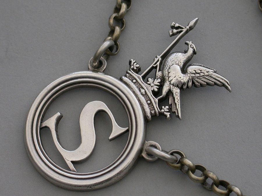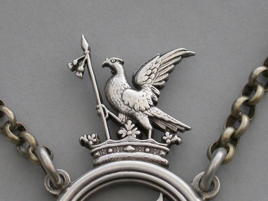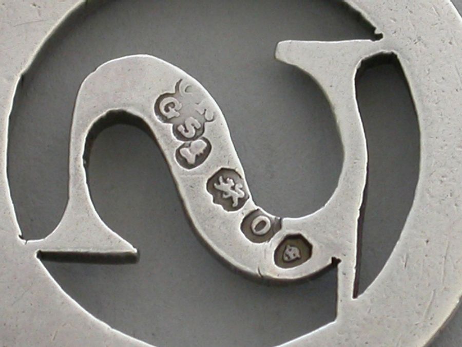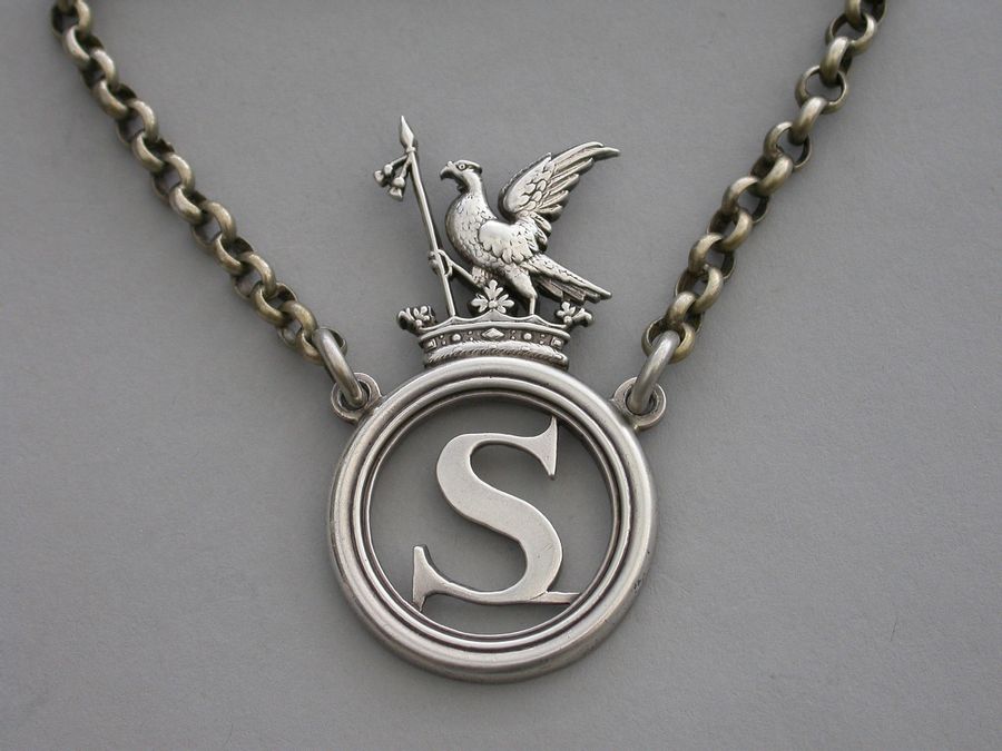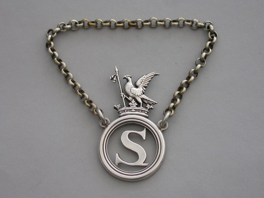 A fine and rare George IV cast silver Armorial Wine Label made in the form of a capital letter 'S' within a circle and with a crest above. The circle formed from three concentric rings of various depths. The Crest of:- ""on a ducal coronet, an eagle rising holding in the dexter claw a staff thereupon a pennon"", is probably that of Davey of Redruth in Cornwall.