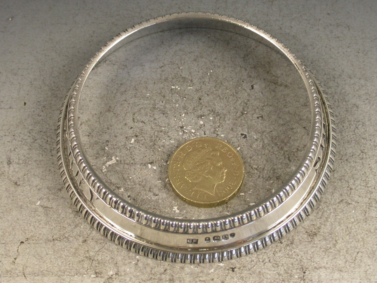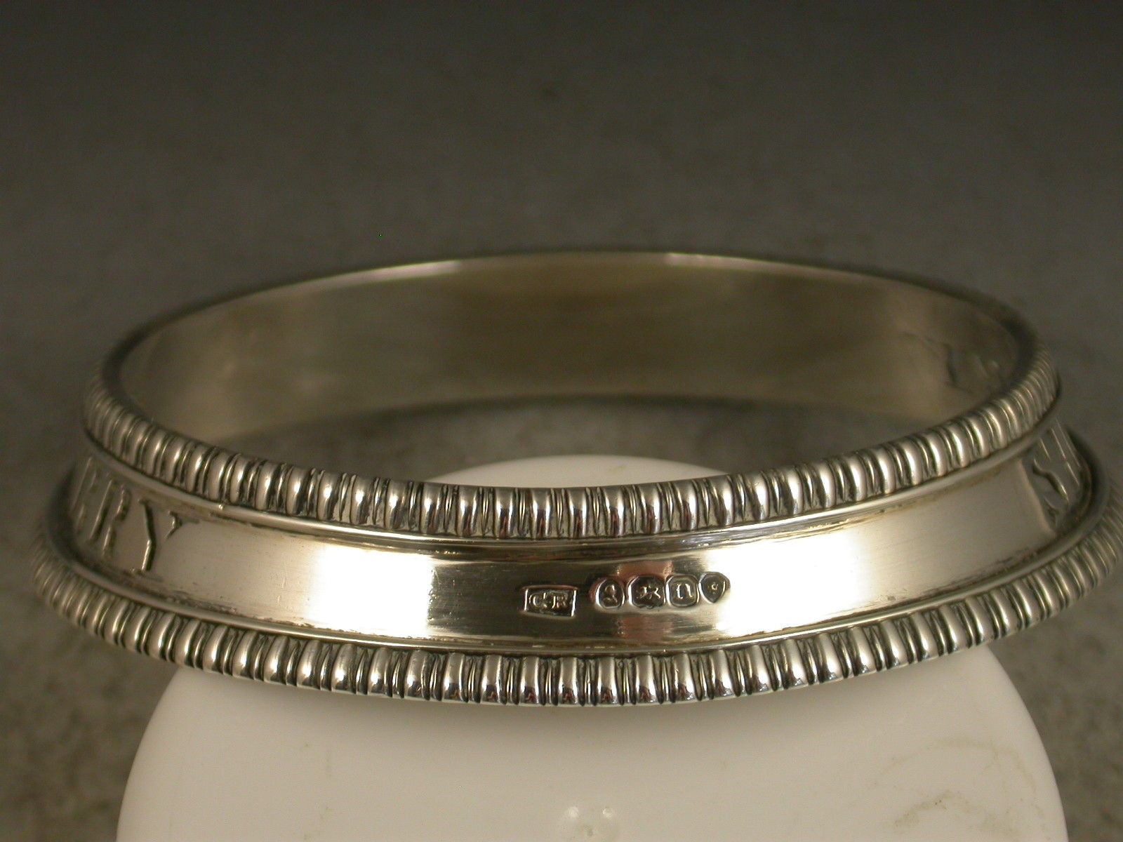 A very fine quality George IV heavy cast silver Wine Label of bottle collar form, the circular collar with sloping sides and gadrooned rims, pierced for Sherry.