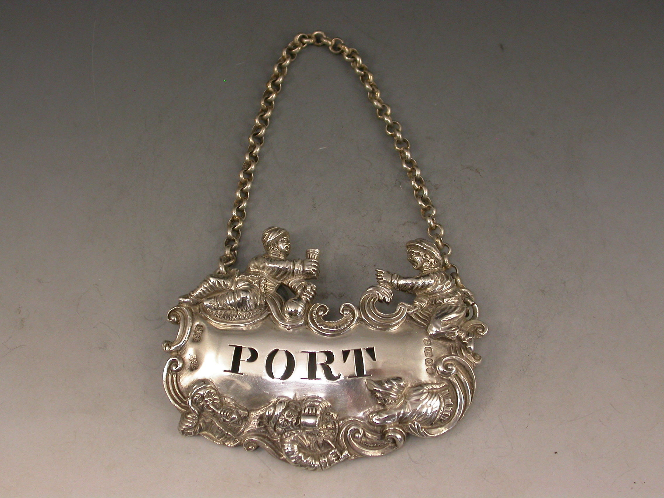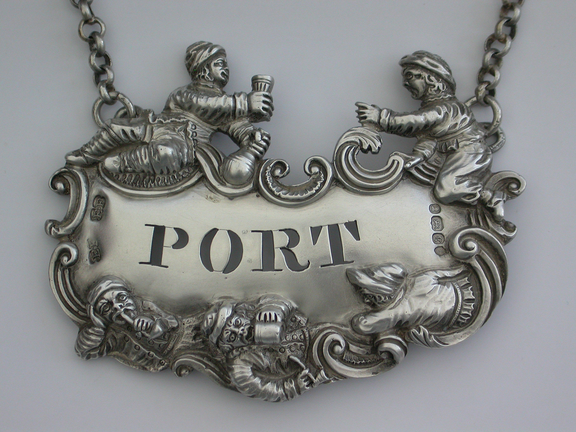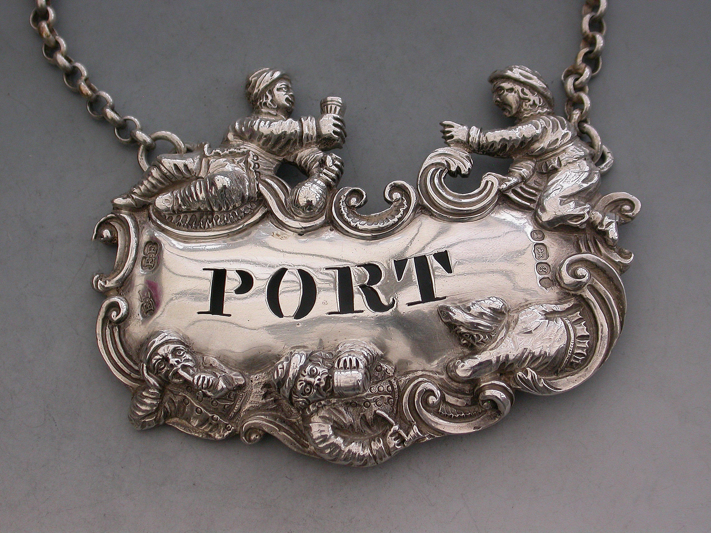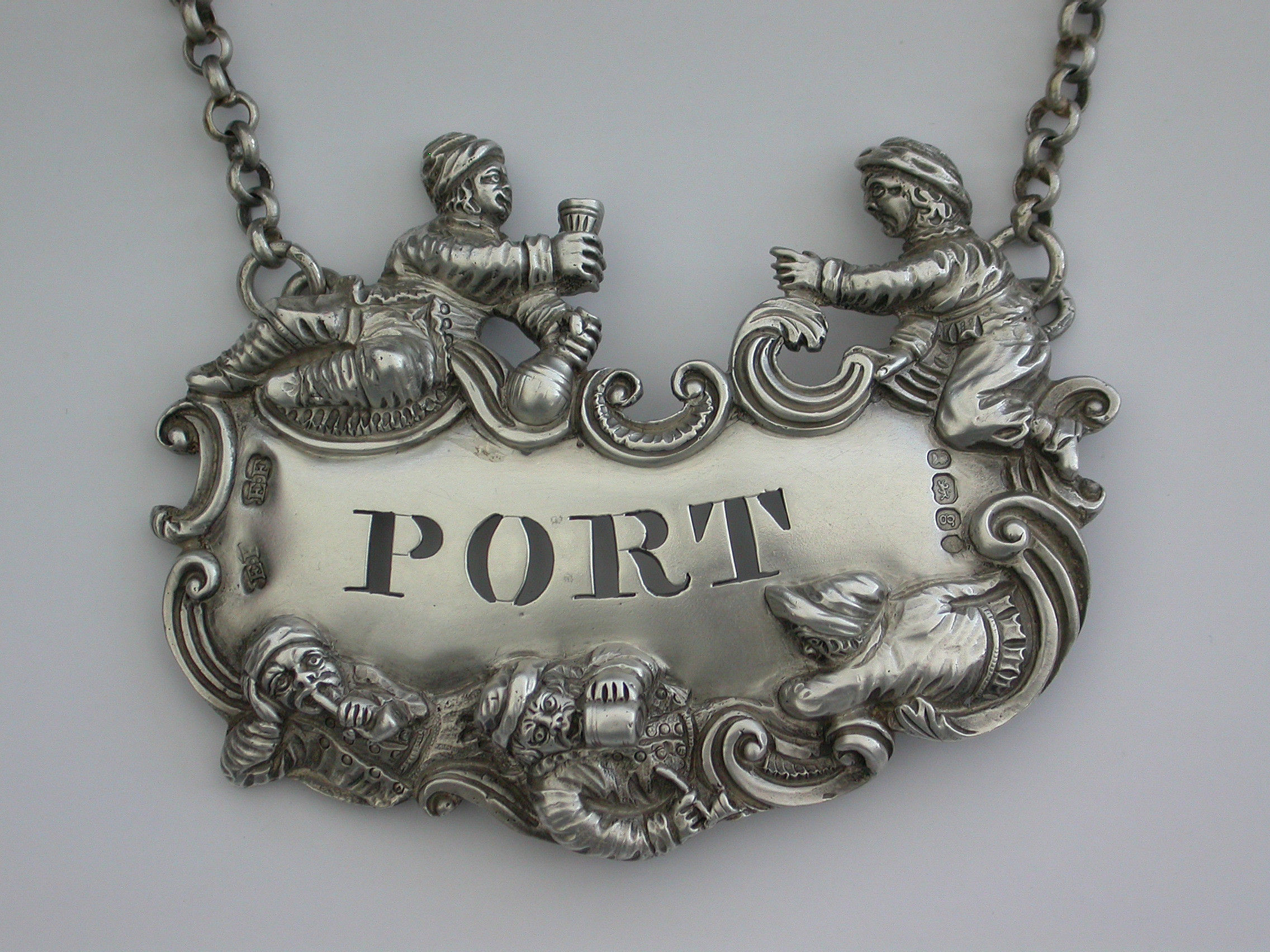 A fine and rare George IV large heavy cast silver Wine Label pierced for Port, the design known as the ""Five Topers"" depicts five Dutchman in various attitudes surrounding the cartouche shaped label, drinking, smoking, and generally enjoying themselves - possibly after a painting by the Dutch artist W.Teniers.