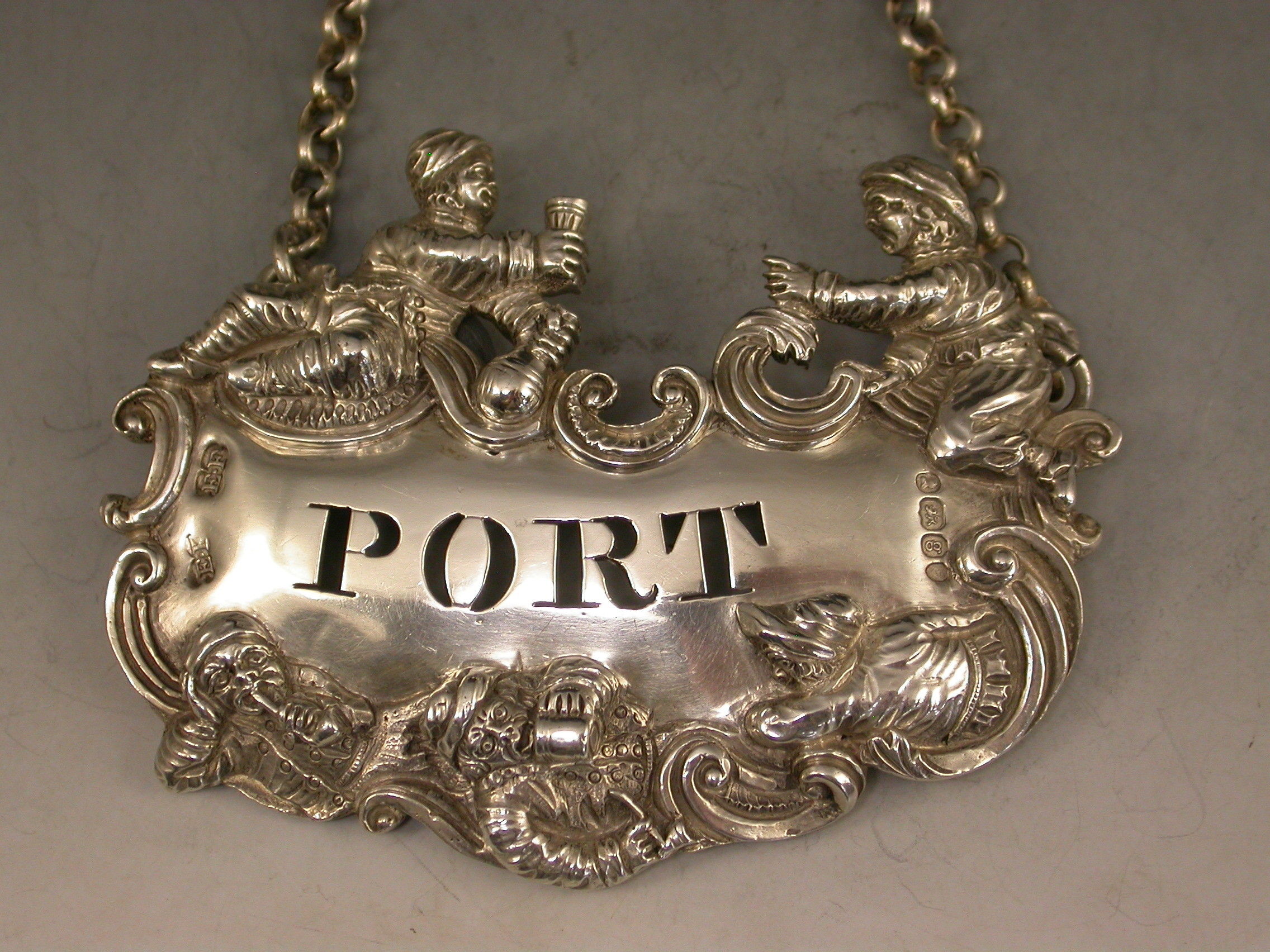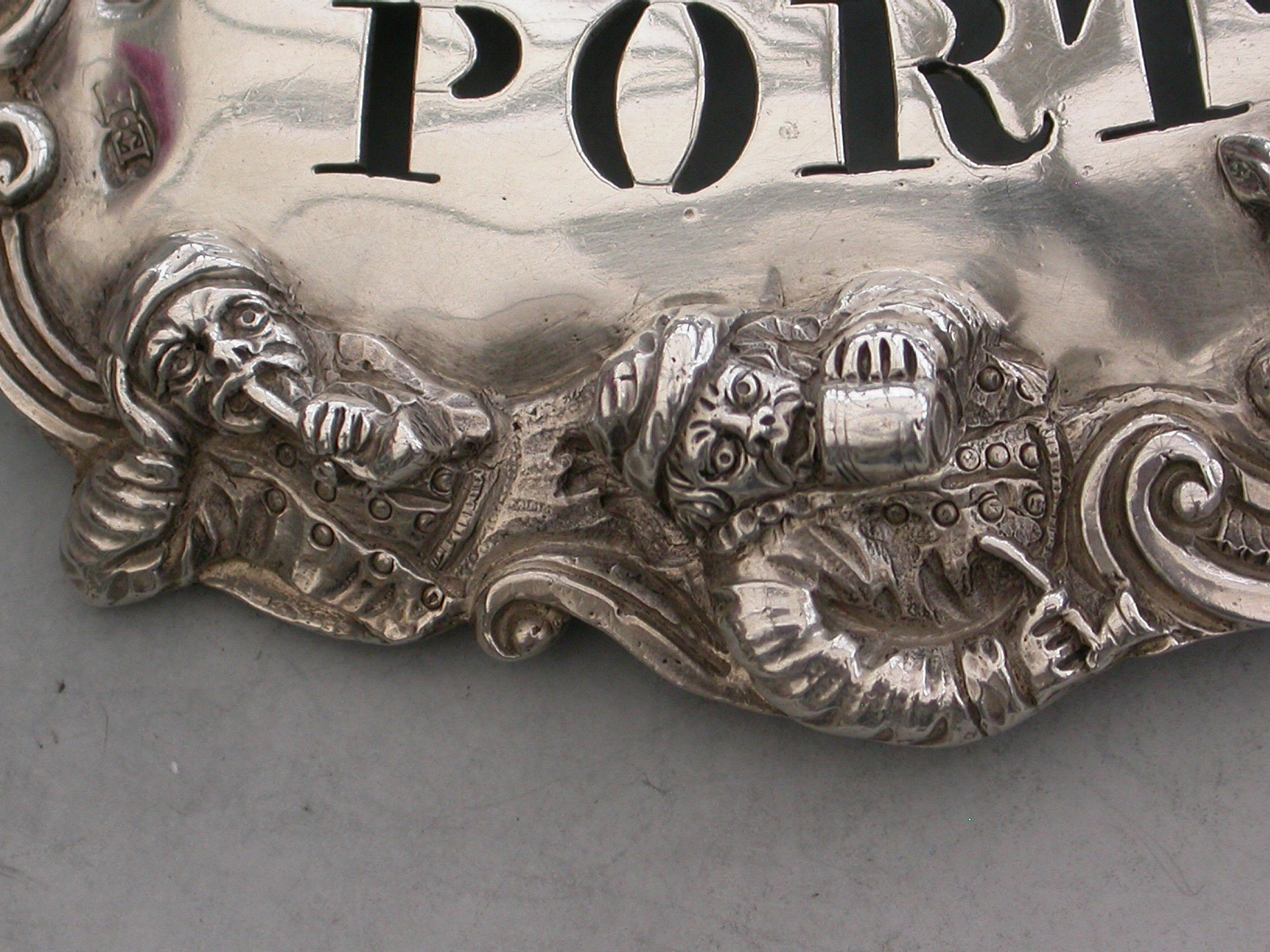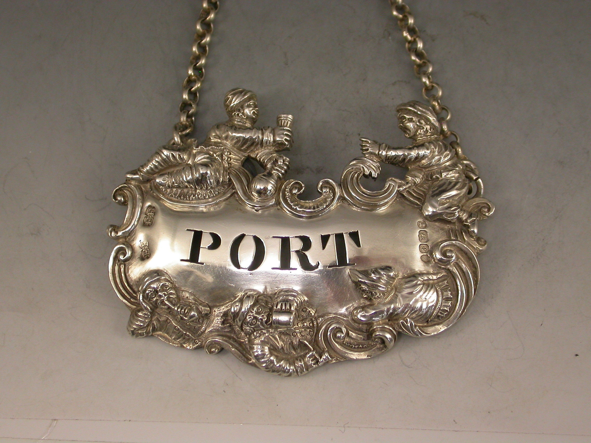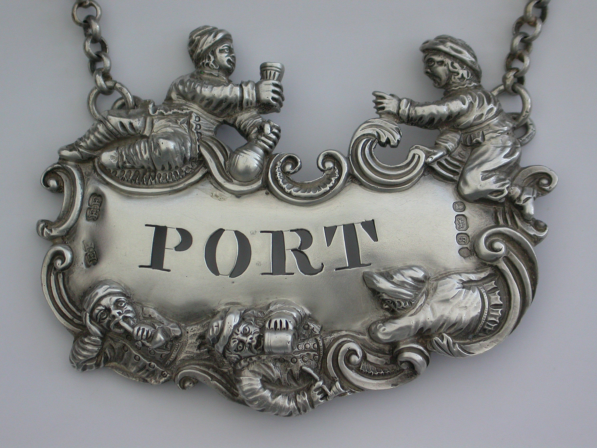 A fine and rare George IV large heavy cast silver Wine Label pierced for Port, the design known as the ""Five Topers"" depicts five Dutchman in various attitudes surrounding the cartouche shaped label, drinking, smoking, and generally enjoying themselves - possibly after a painting by the Dutch artist W.Teniers.