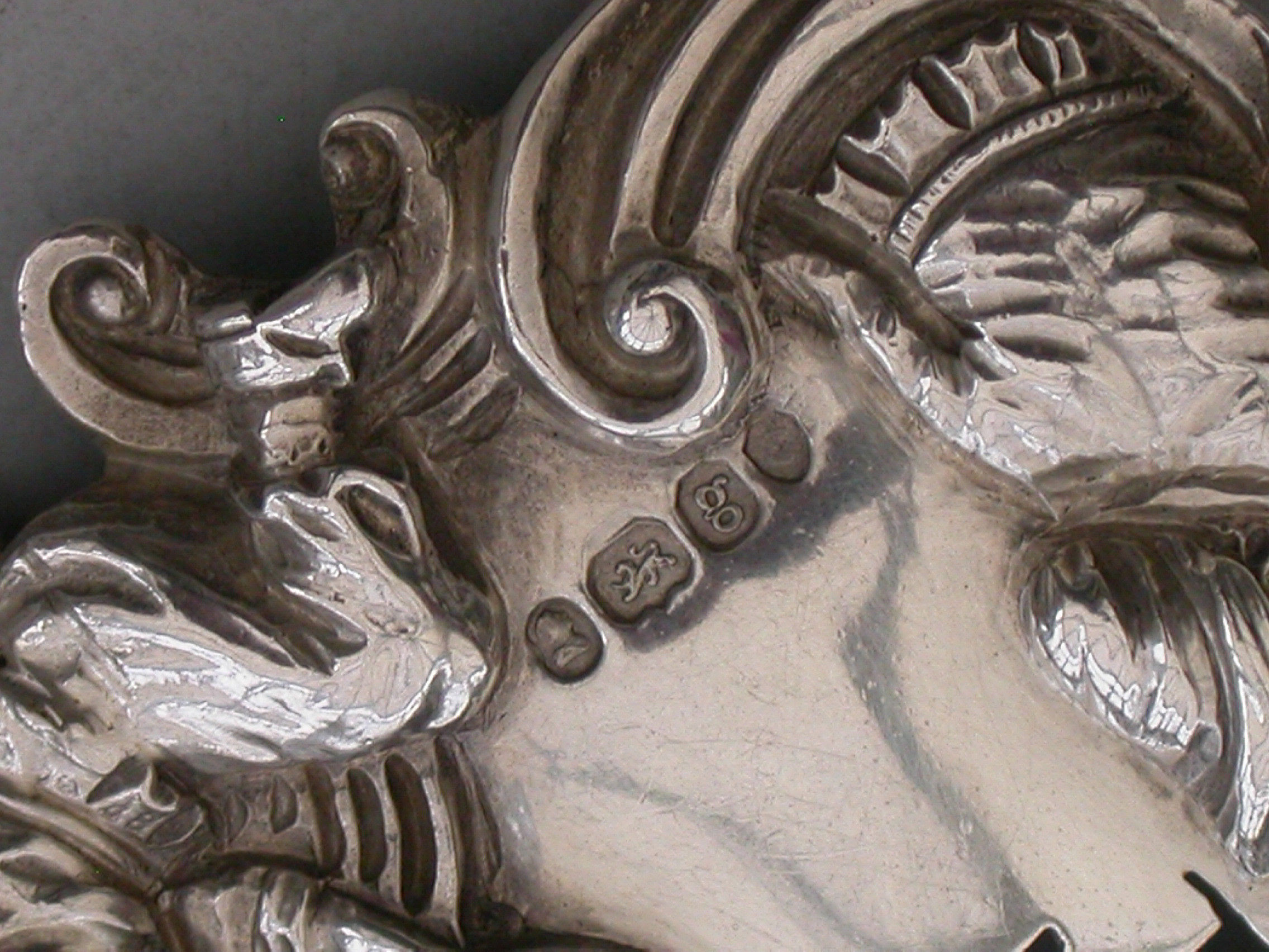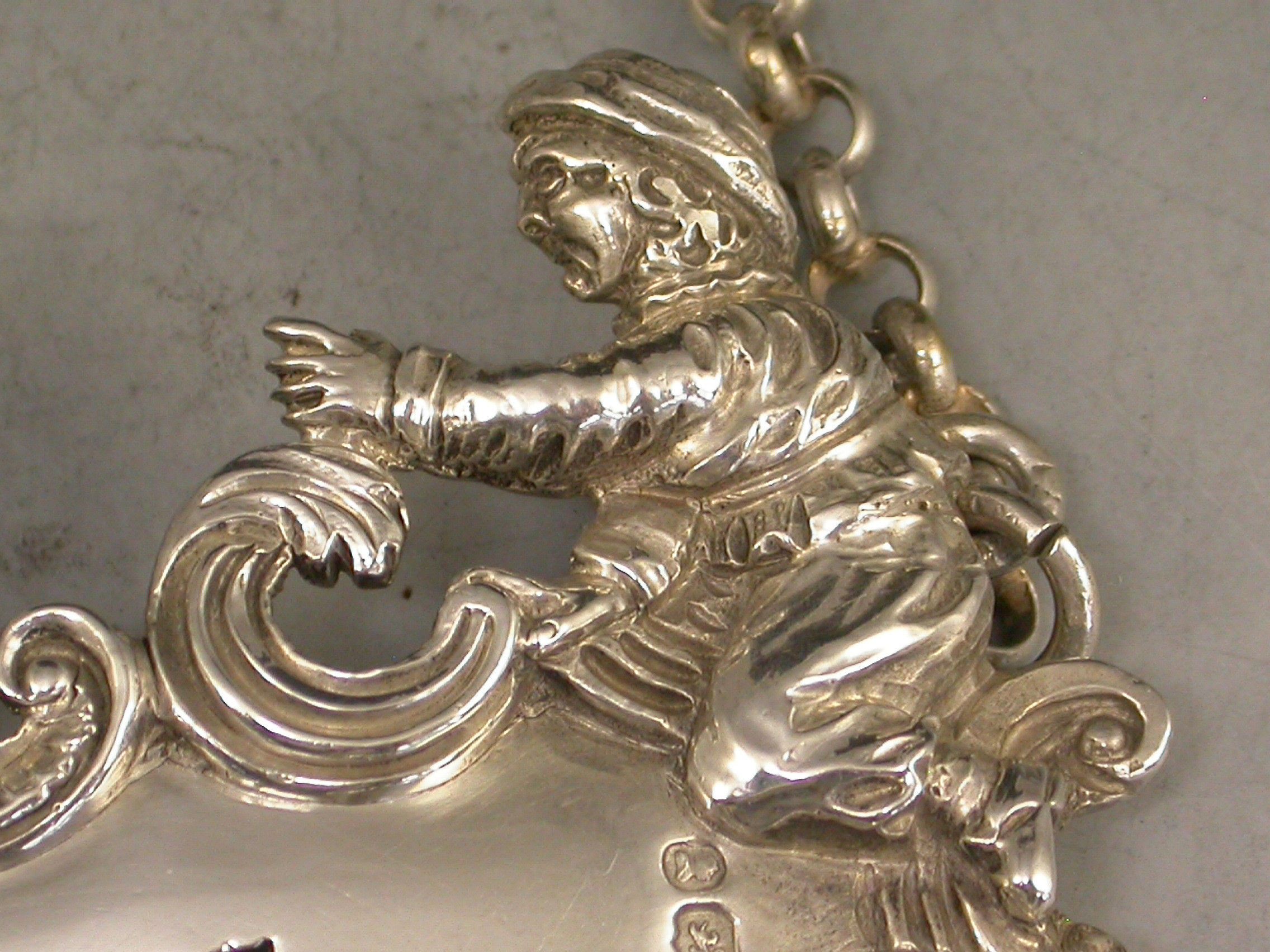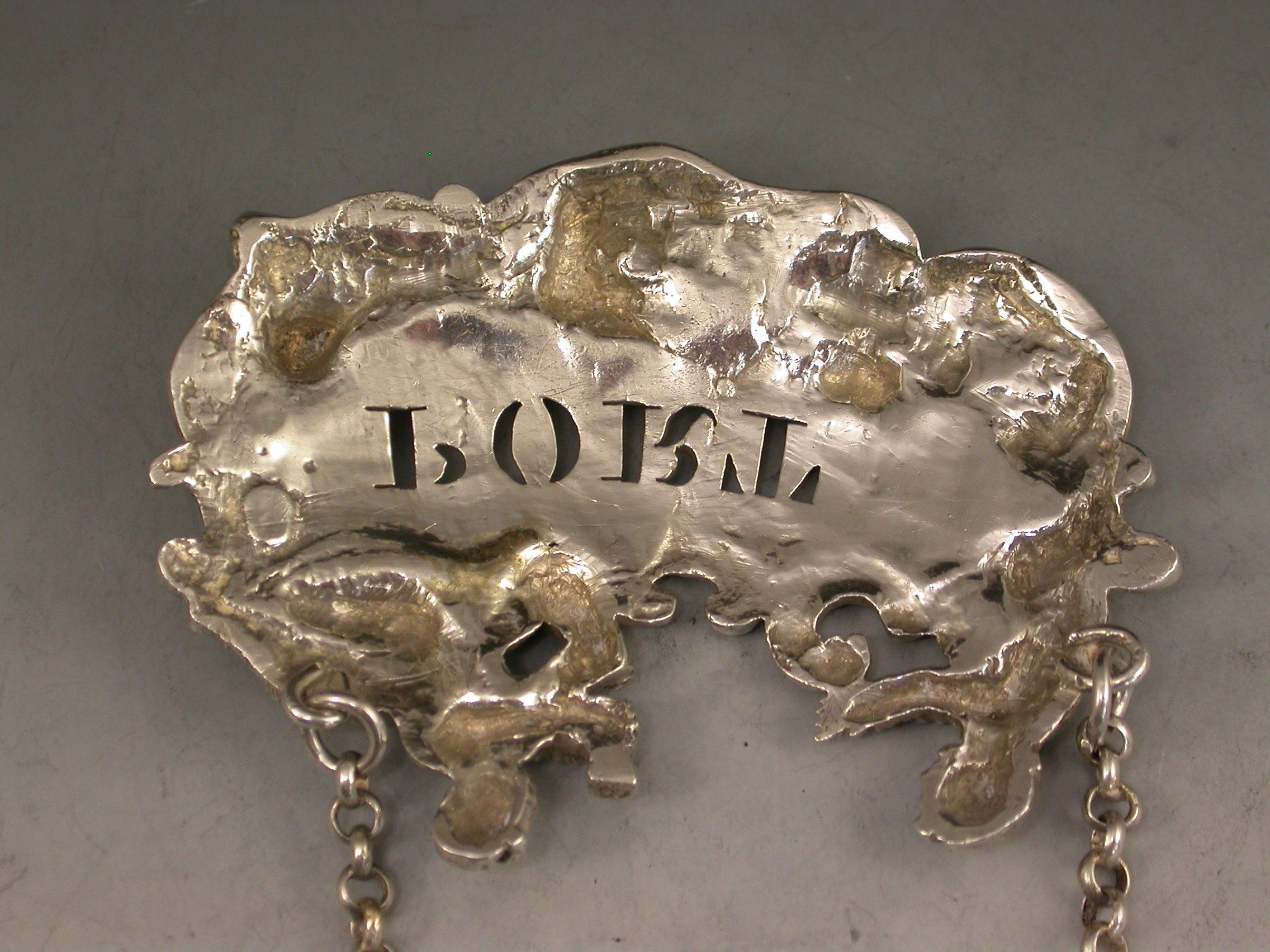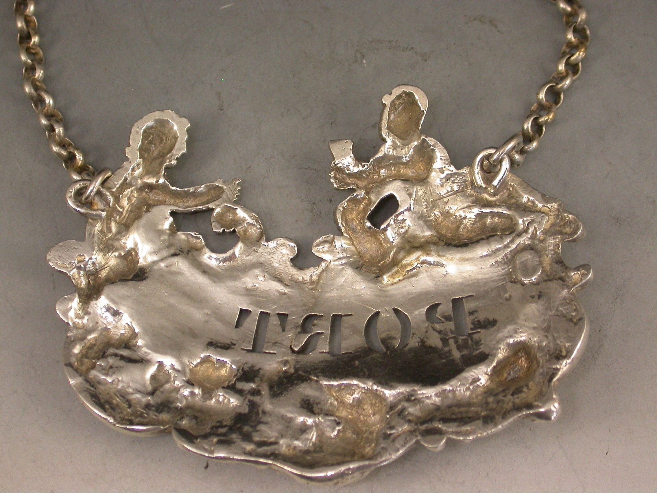 A fine and rare George IV large heavy cast silver Wine Label pierced for Port, the design known as the ""Five Topers"" depicts five Dutchman in various attitudes surrounding the cartouche shaped label, drinking, smoking, and generally enjoying themselves - possibly after a painting by the Dutch artist W.Teniers.