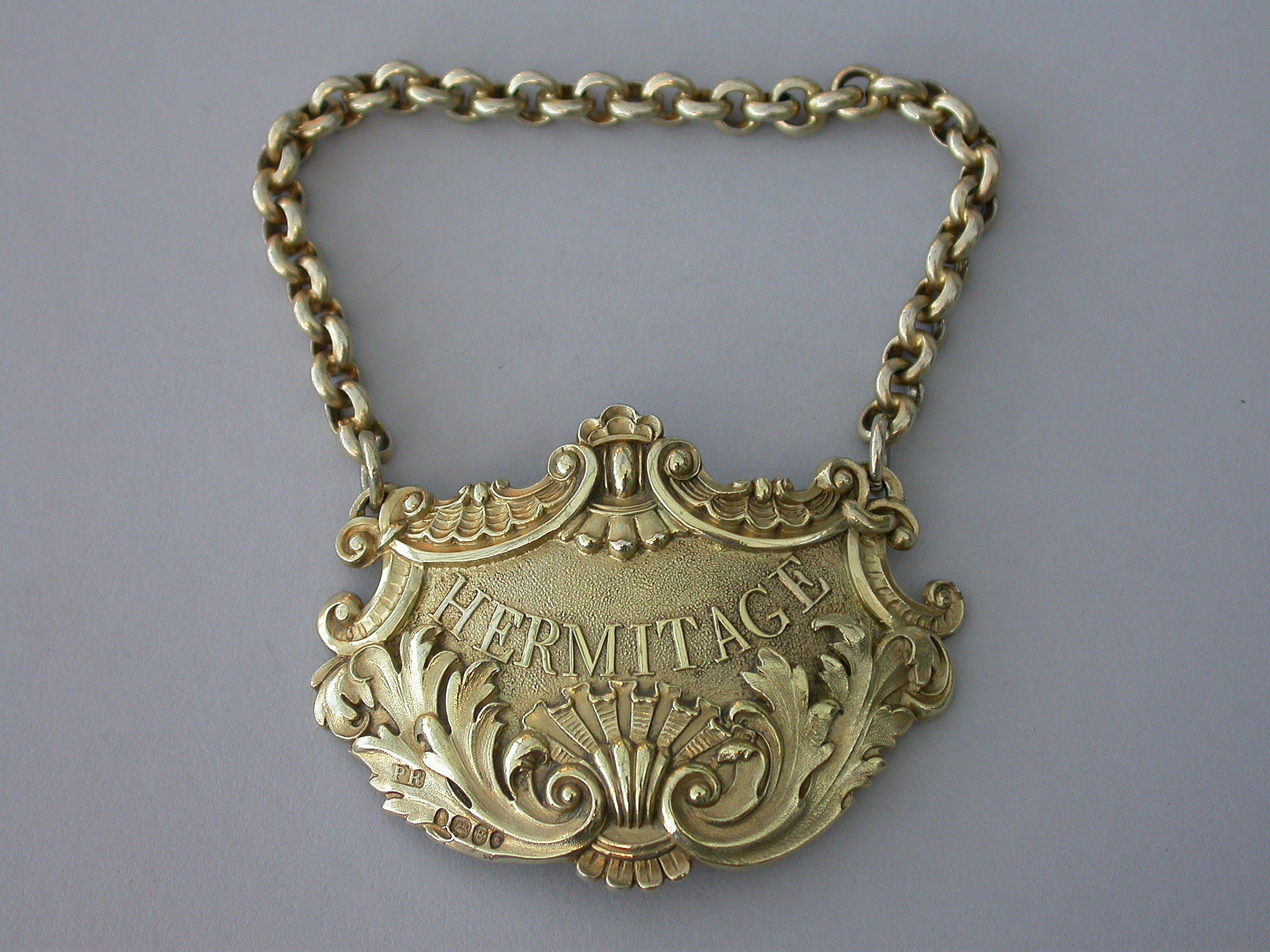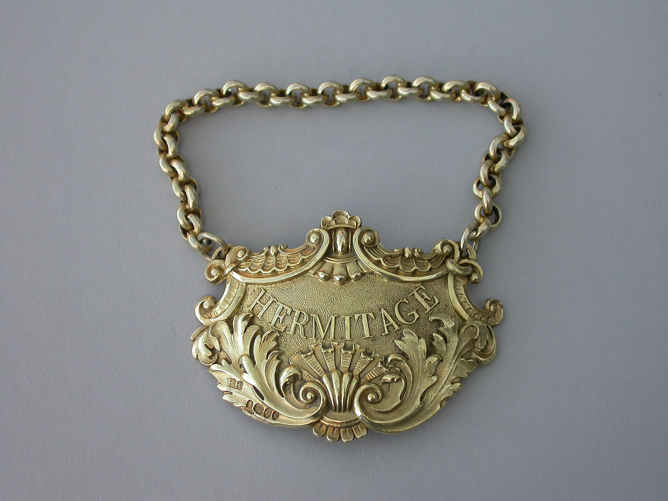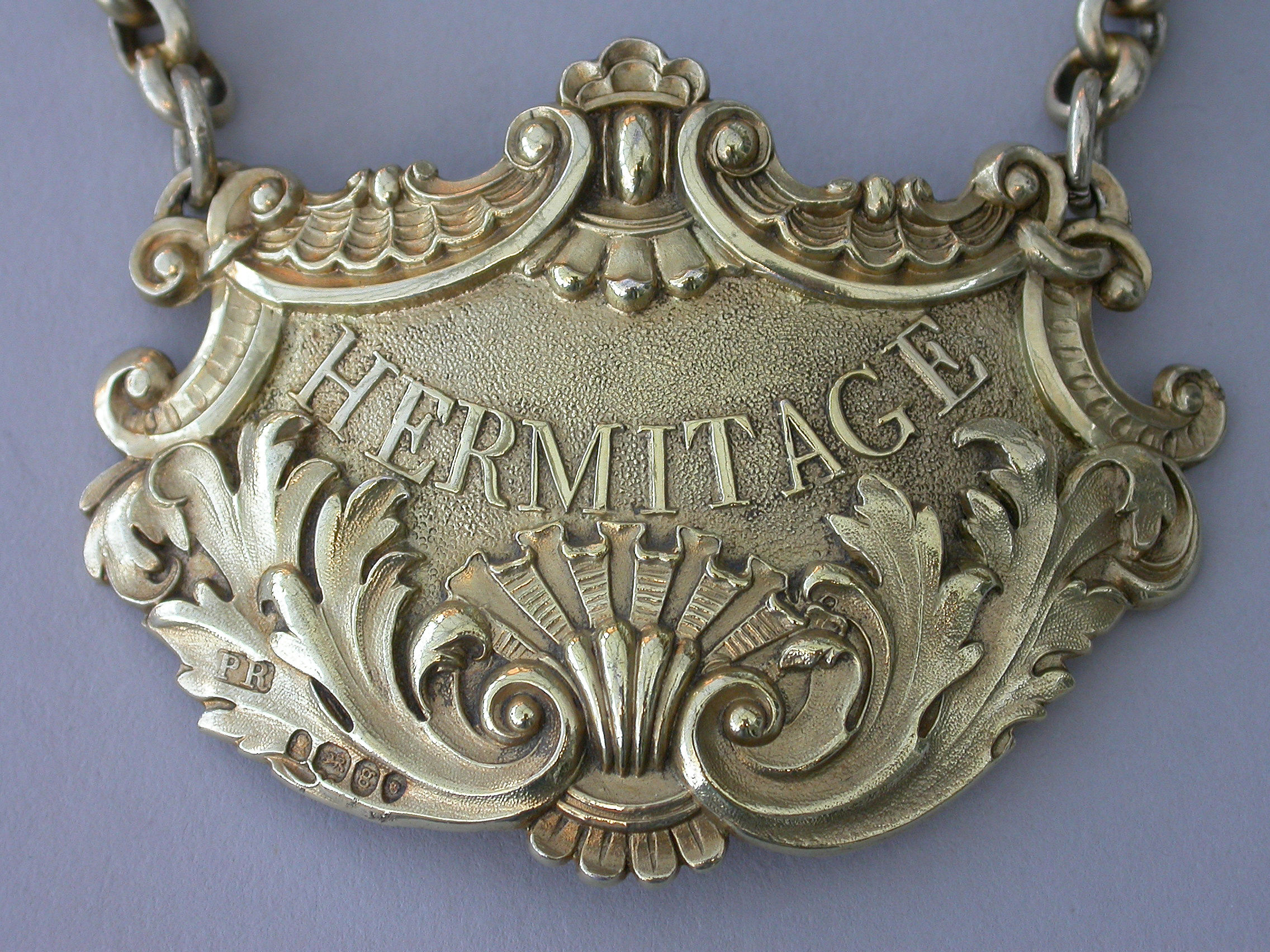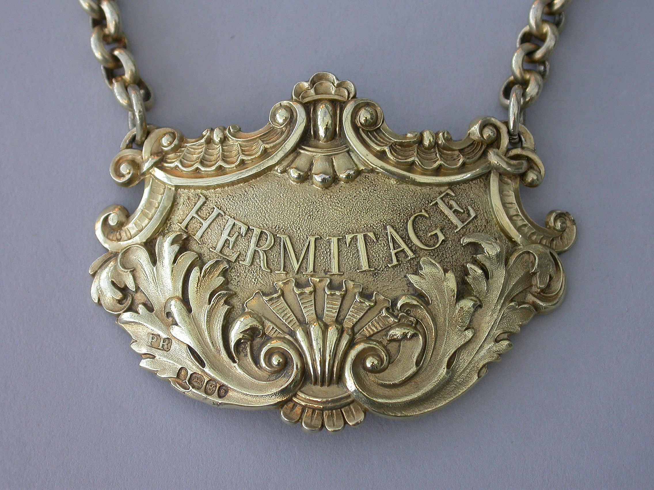 A fine quality large heavy cast silver gilt Wine Label of cartouche form with shell and acanthus leaf scrolled borders, with raised letters for Hermitage on a stippled ground.
