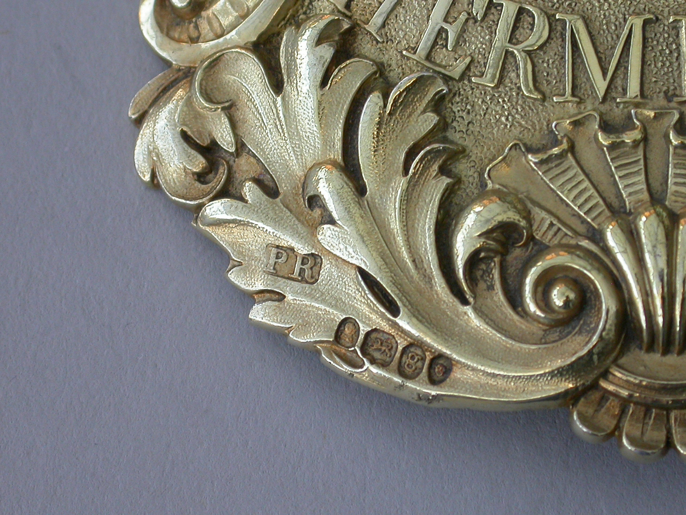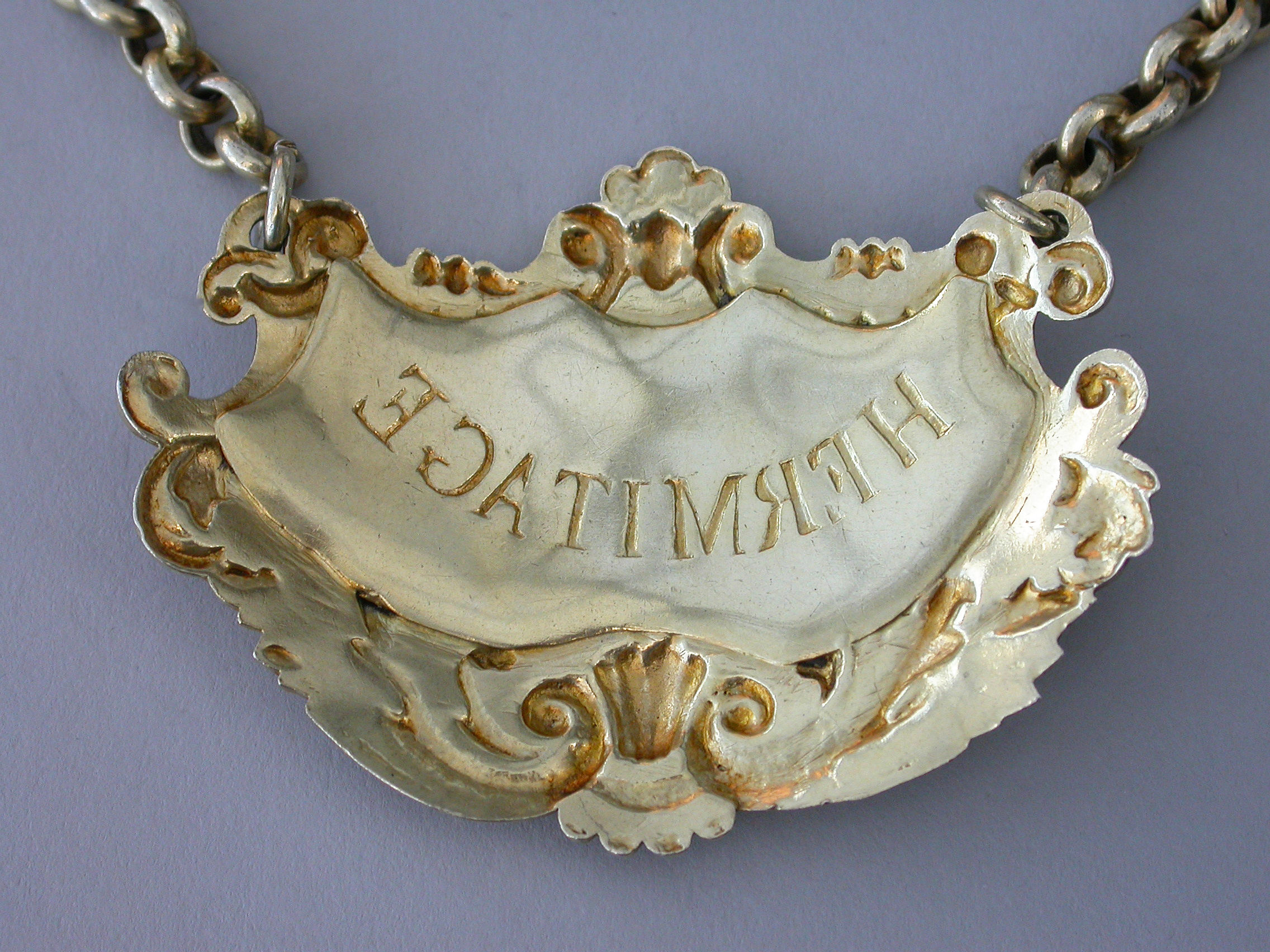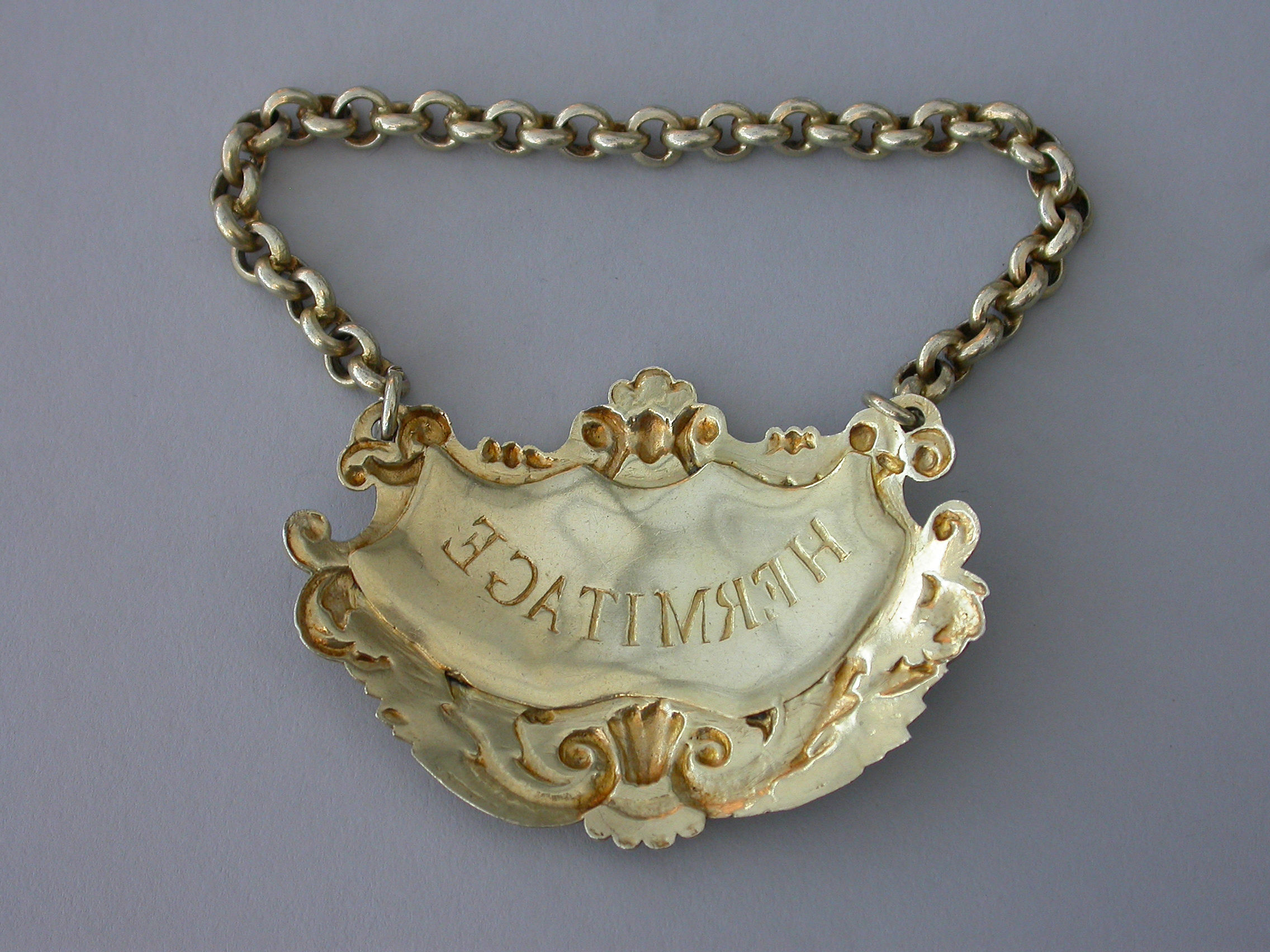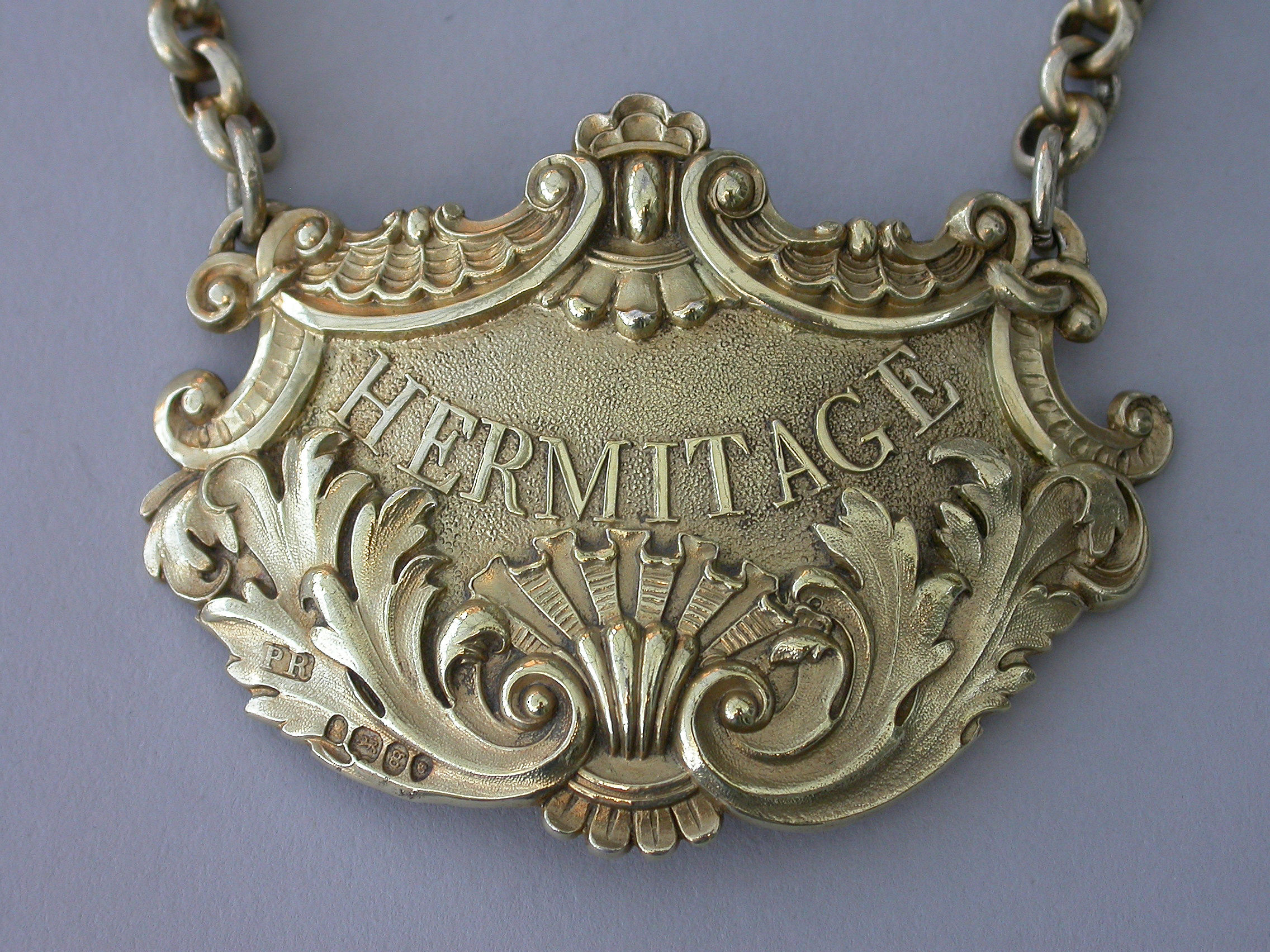 A fine quality large heavy cast silver gilt Wine Label of cartouche form with shell and acanthus leaf scrolled borders, with raised letters for Hermitage on a stippled ground.