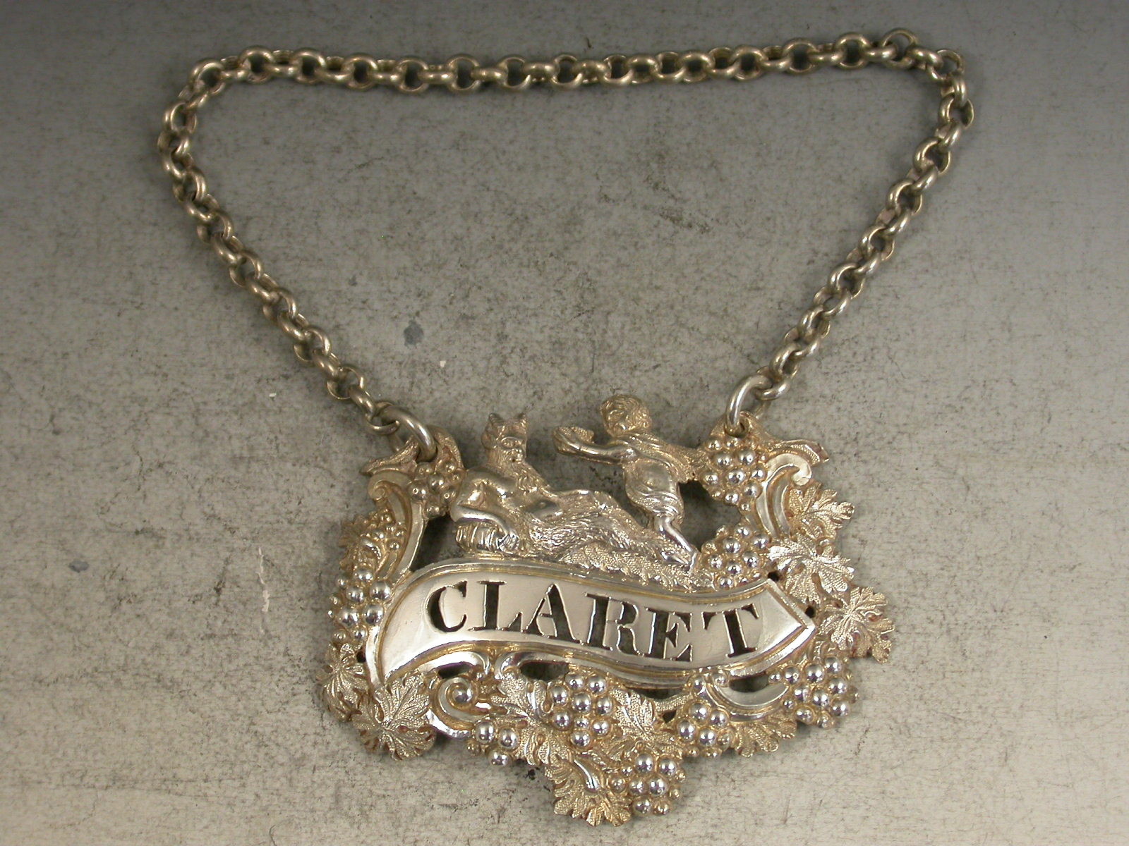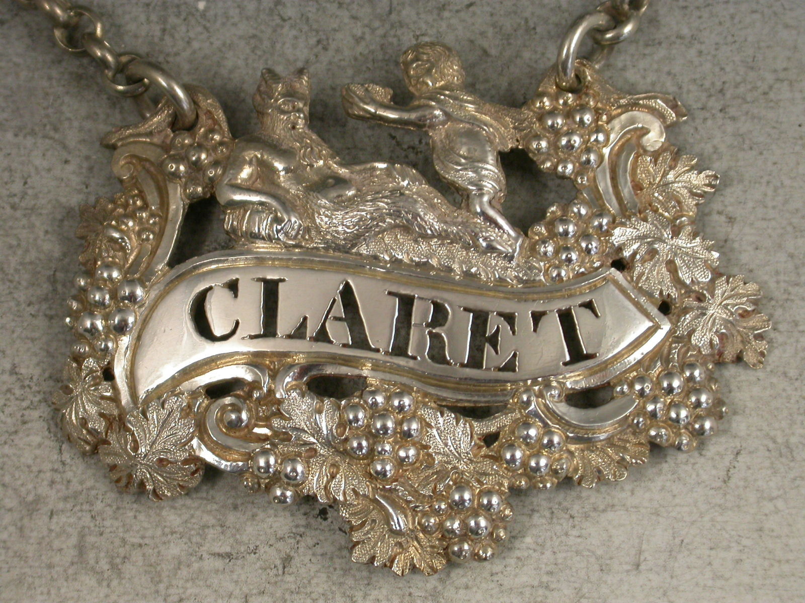 A fine George IV heavy cast and pierced silver Wine Label depicting a reclining Dionysus being offered a cup of wine by a cloaked Putto, a fruiting vine border surrounding the scrolled name plate pierced for Claret.
