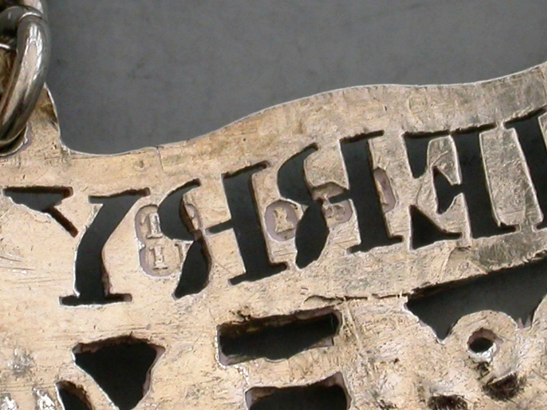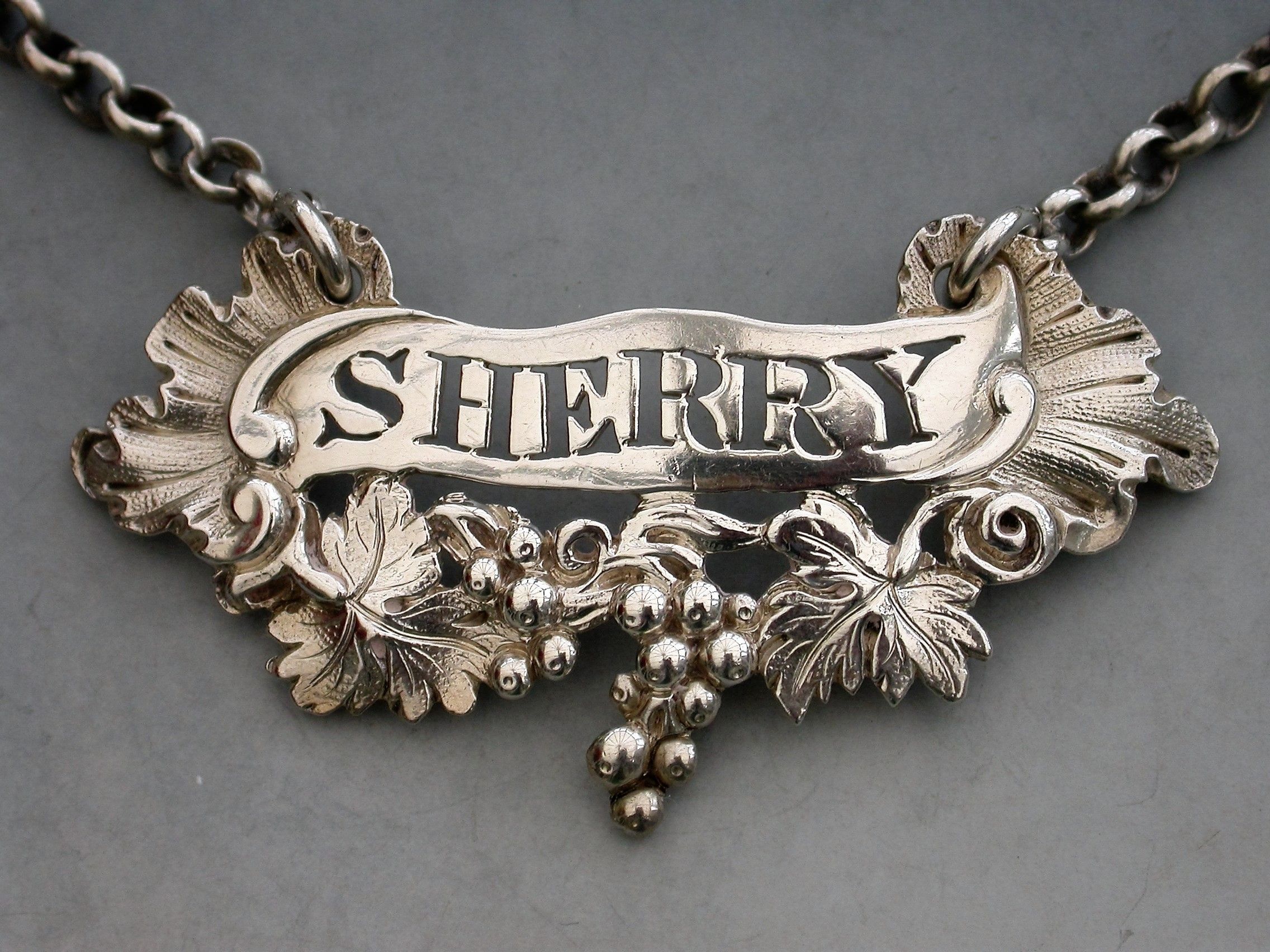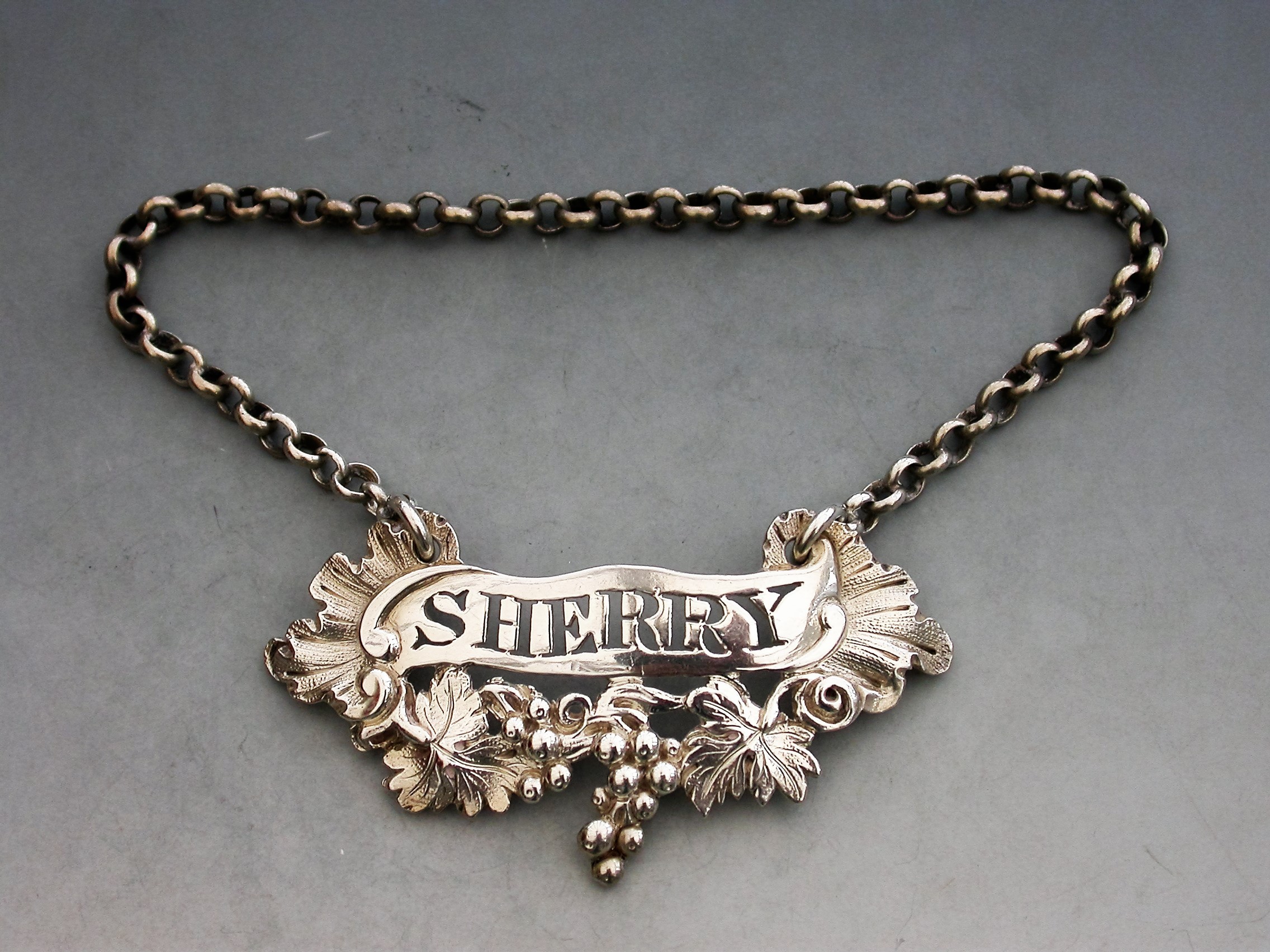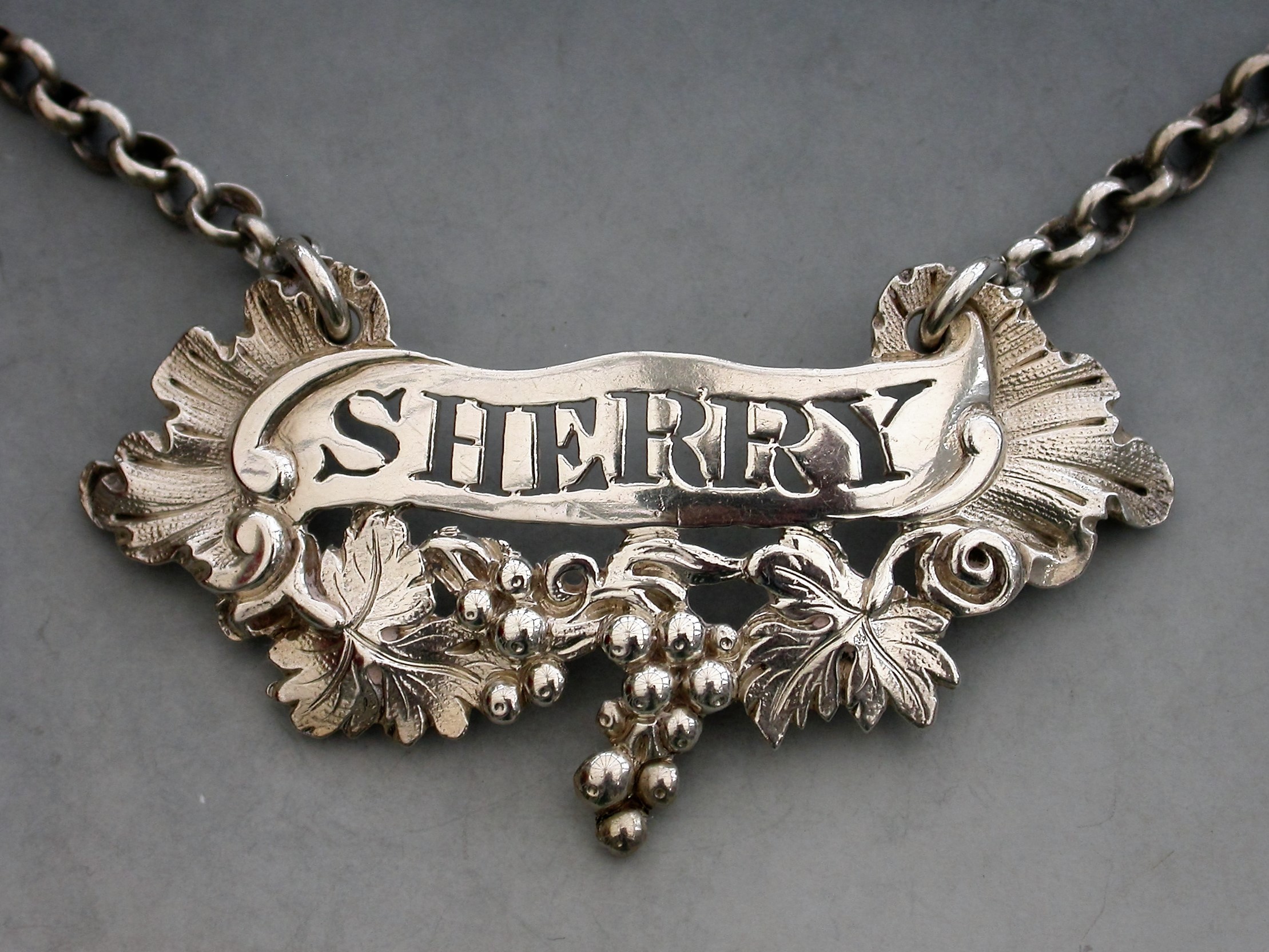 A good George IV heavy cast silver Wine Label of scroll form with vine leaves and grapes below and rocaille shells to either end, pierced for Sherry.