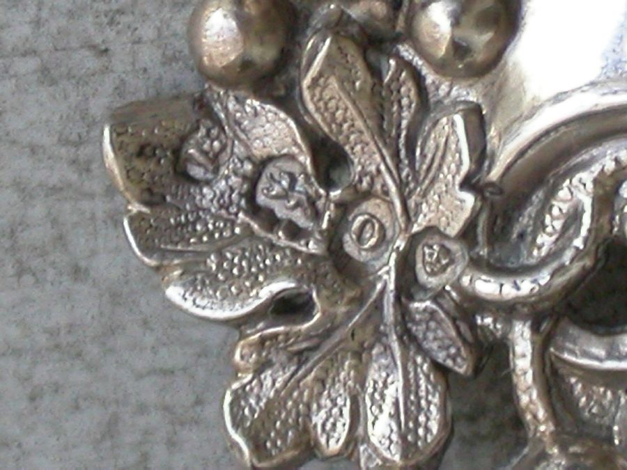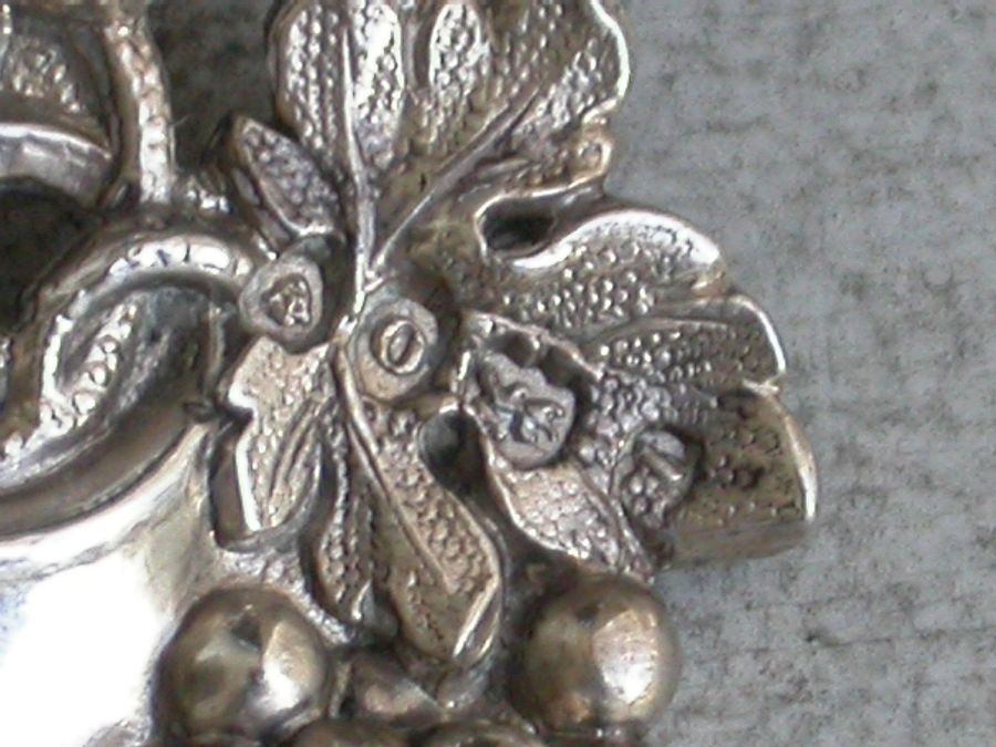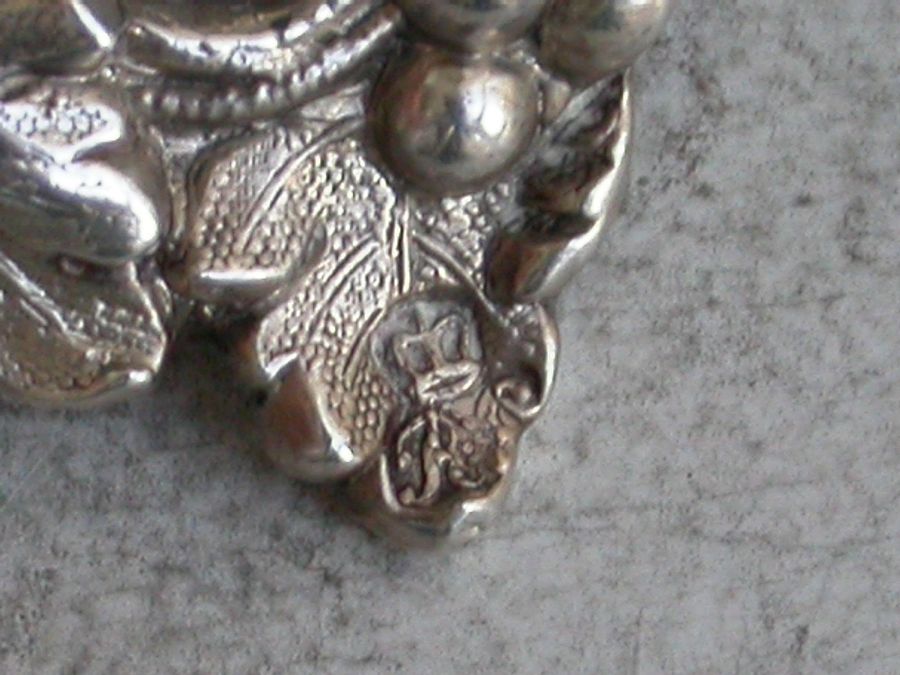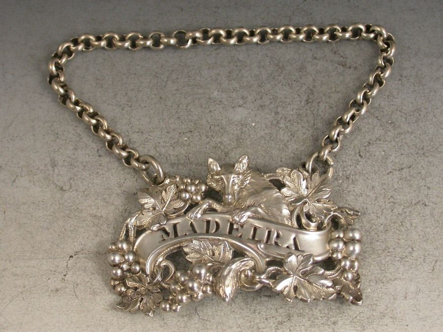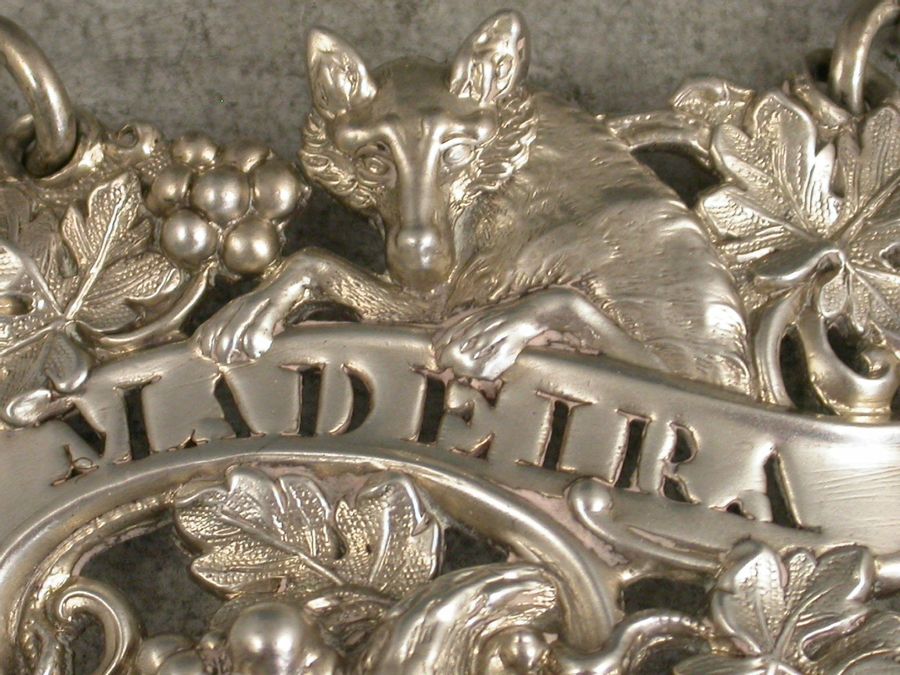 An extremely rare and fine quality George IV cast silver Wine Label depicting a curious fox amongst vine leaves and grapes, climbing over a scrolled name plate pierced for Madeira.