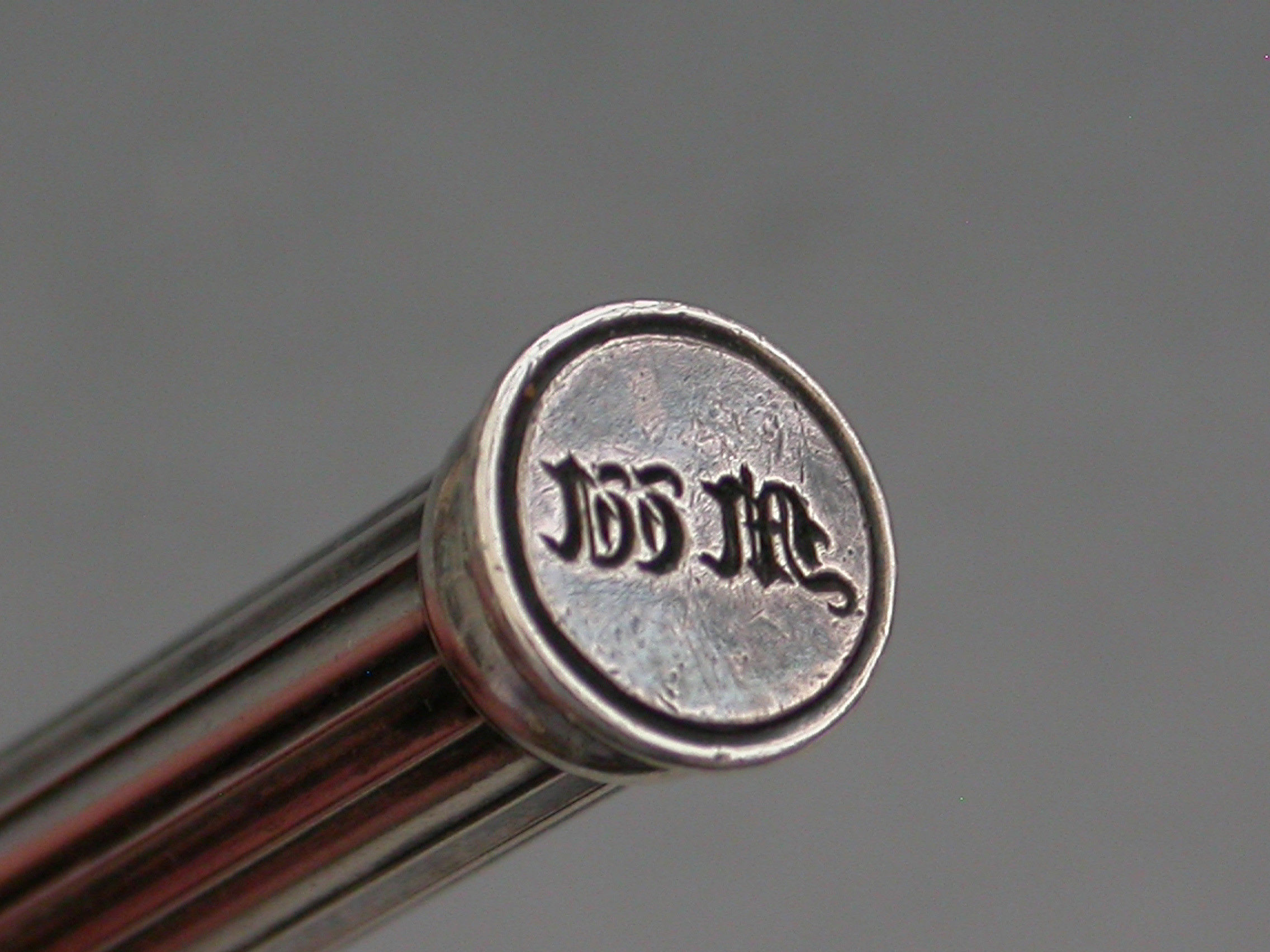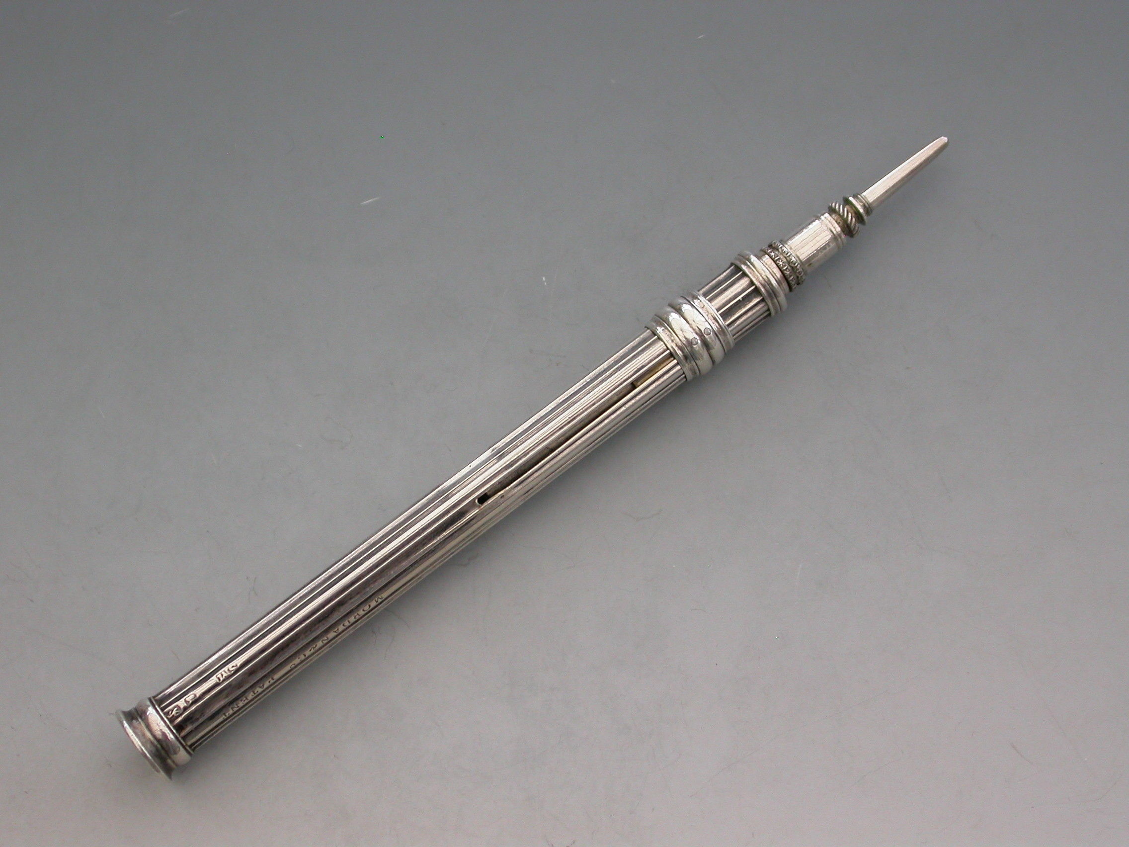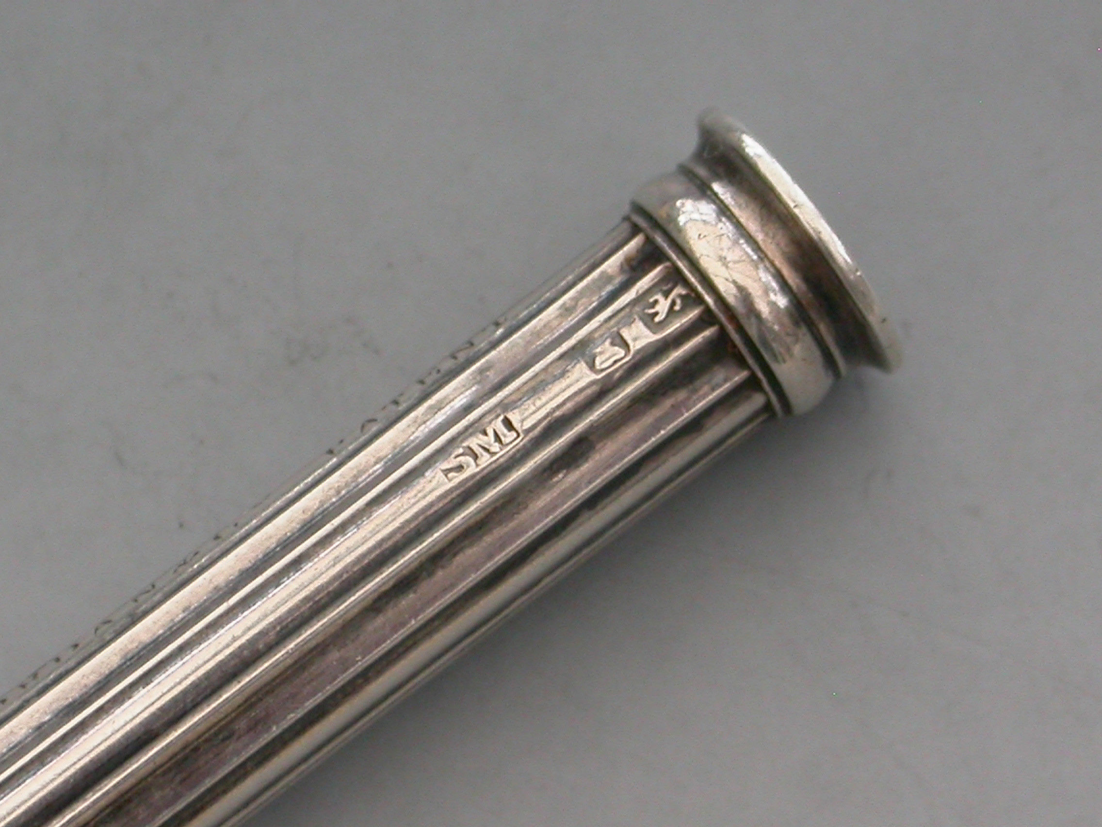 A very early Sampson Mordan Patent hallmarked silver Sliding Propelling Pencil, with reeded body and slider ring. The seal terminal engraved with initials.