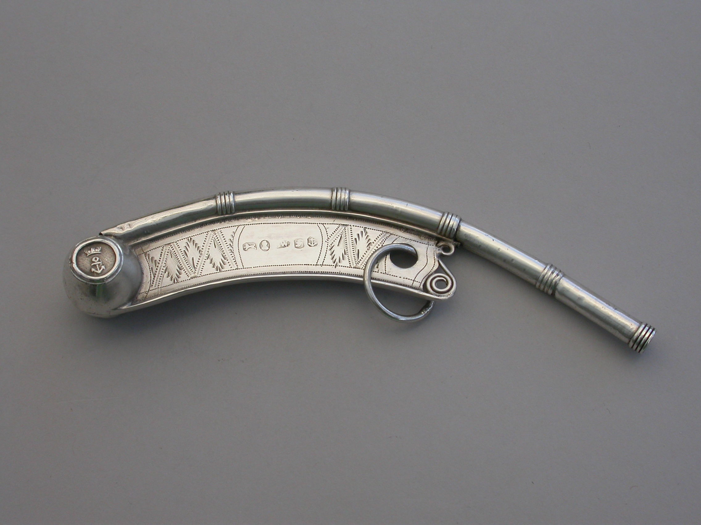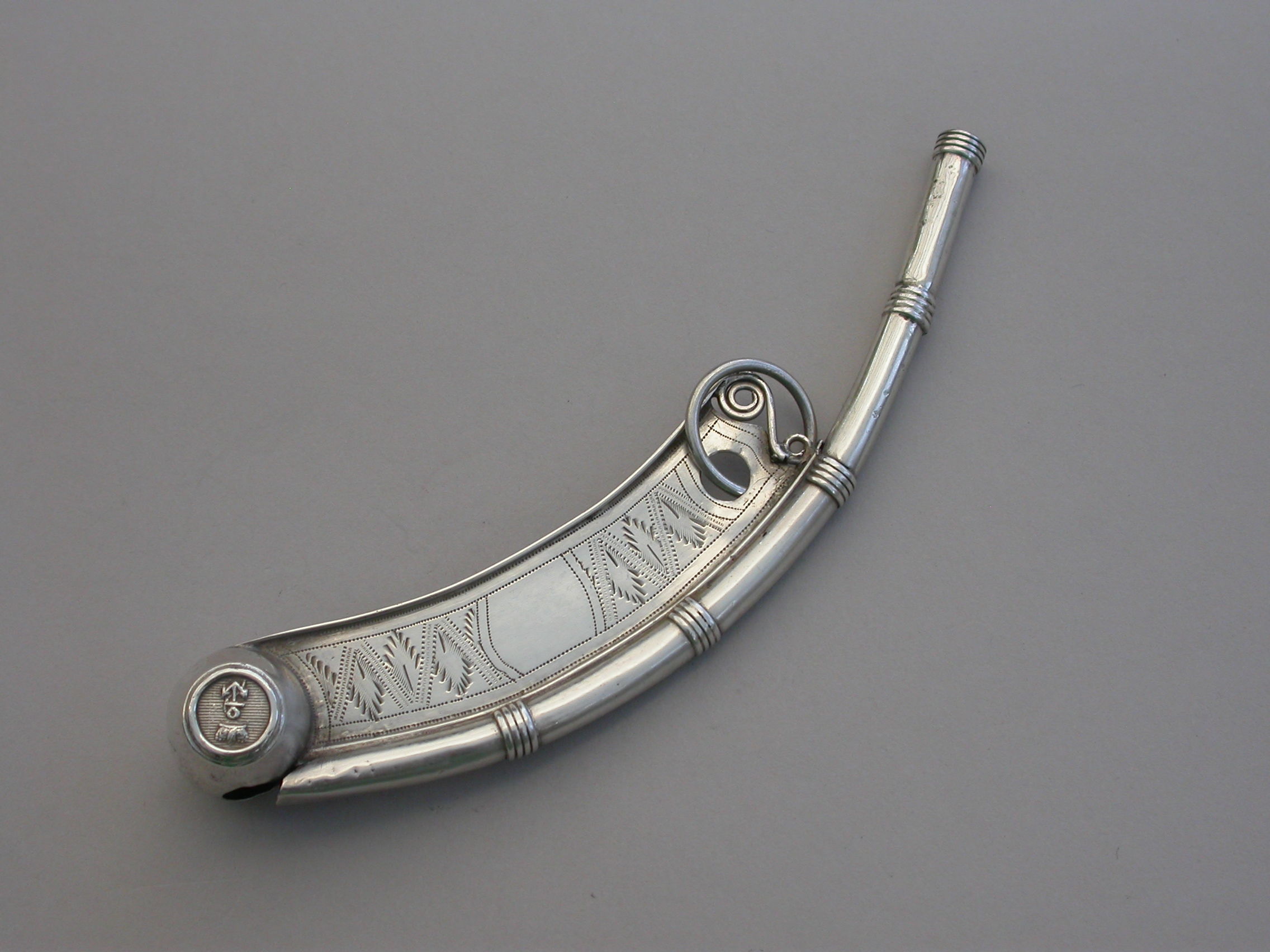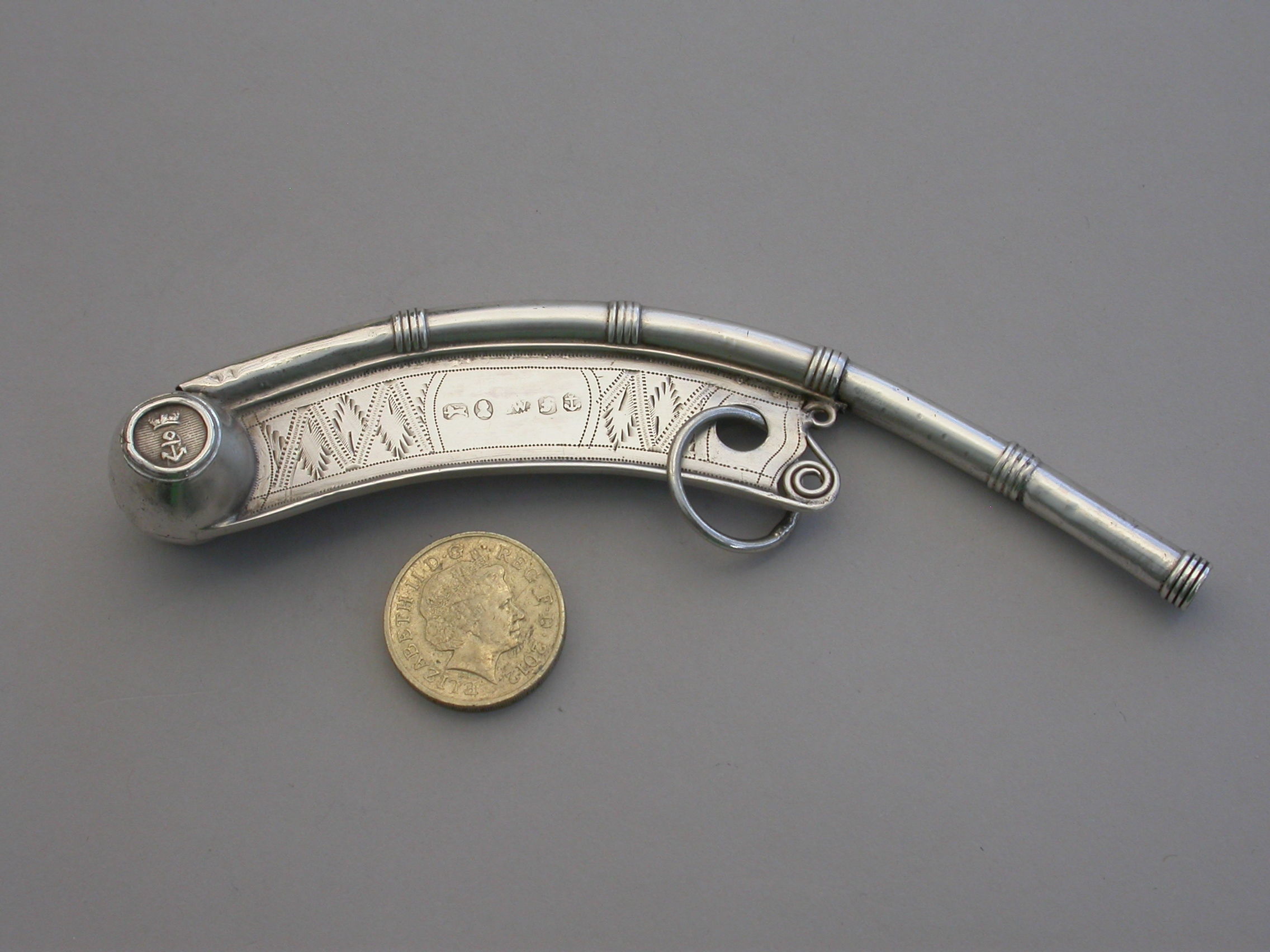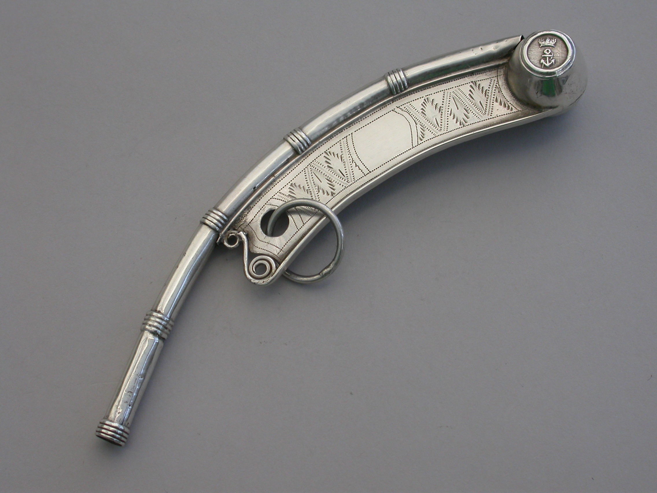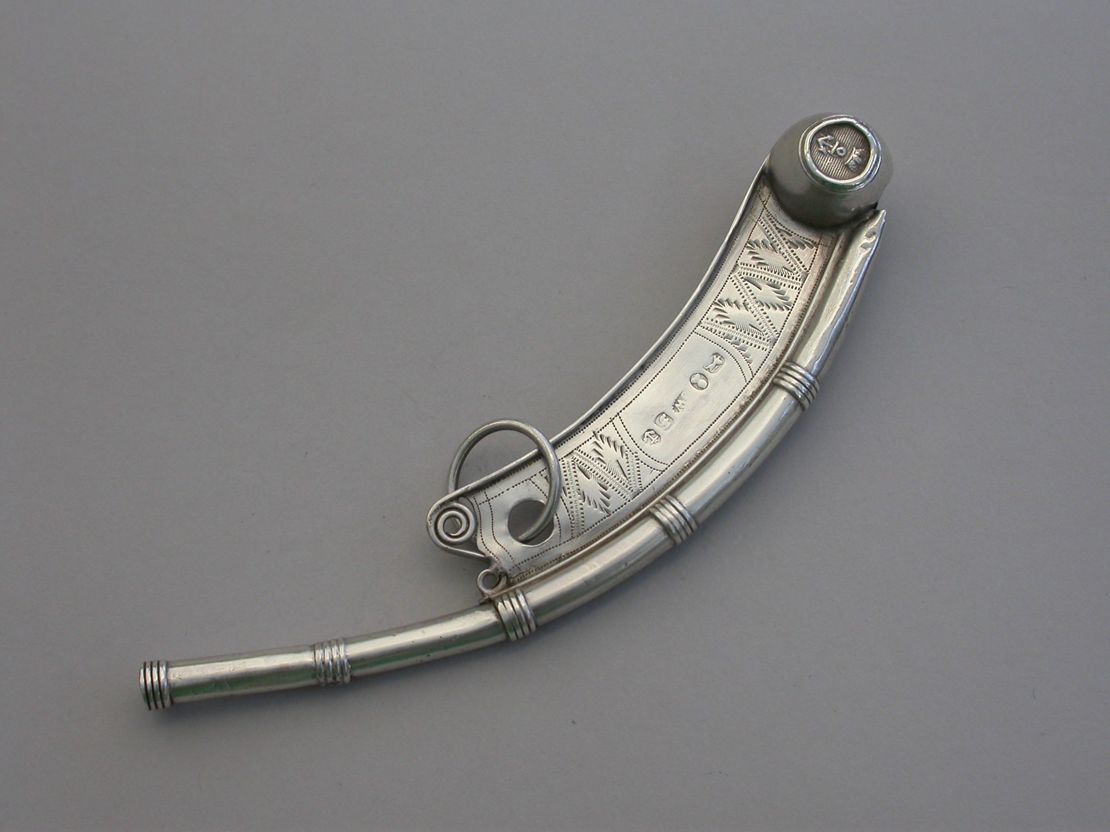 An extremely rare George IV silver Bosuns Whistle of an unusually large size, the buoy stamped on either side with the Royal Navy Crown and Anchor mark, the keel with scratch engraved decoration and a vacant cartouche, reeded bands to the pipe. Complete with suspension ring.