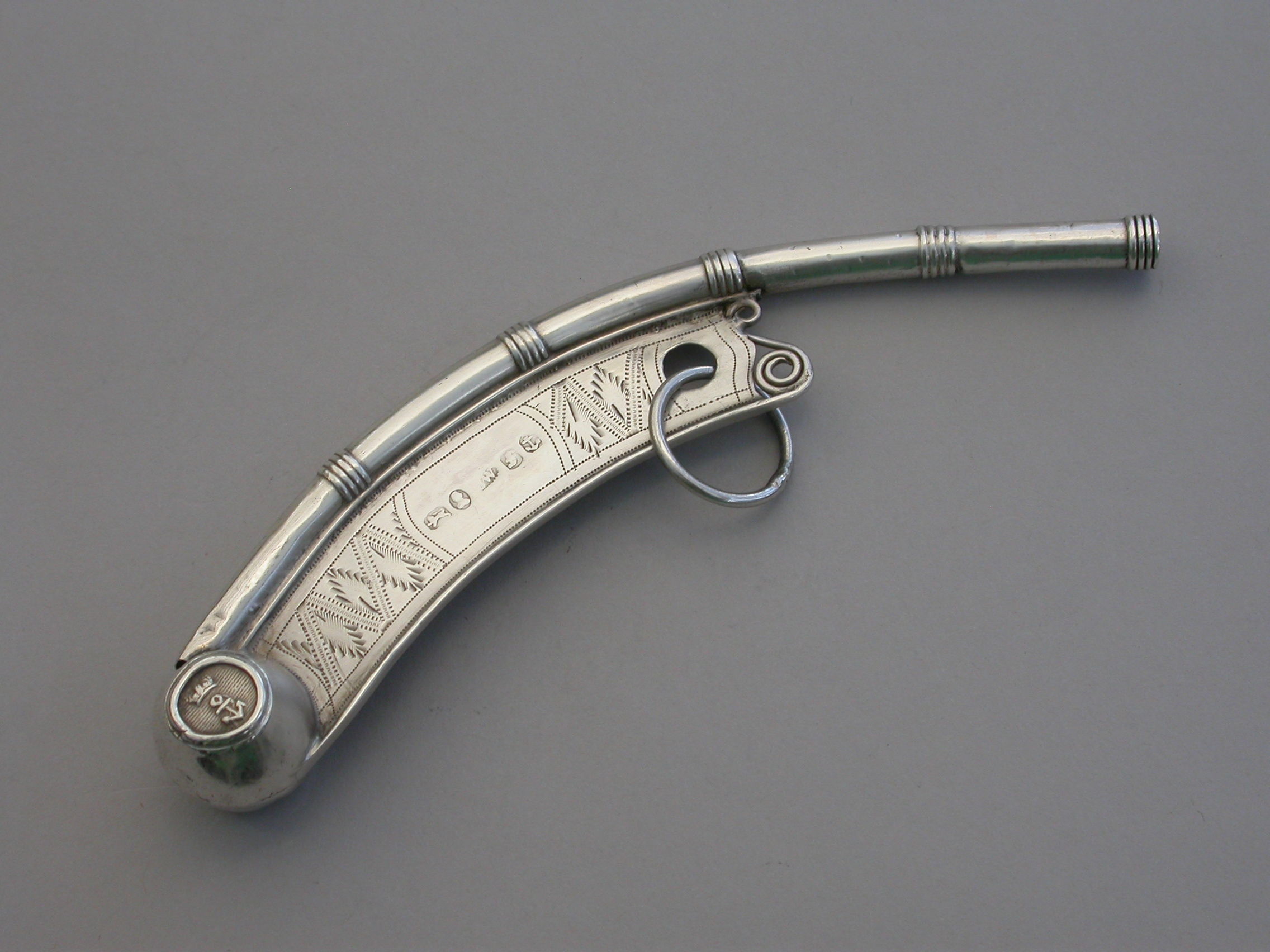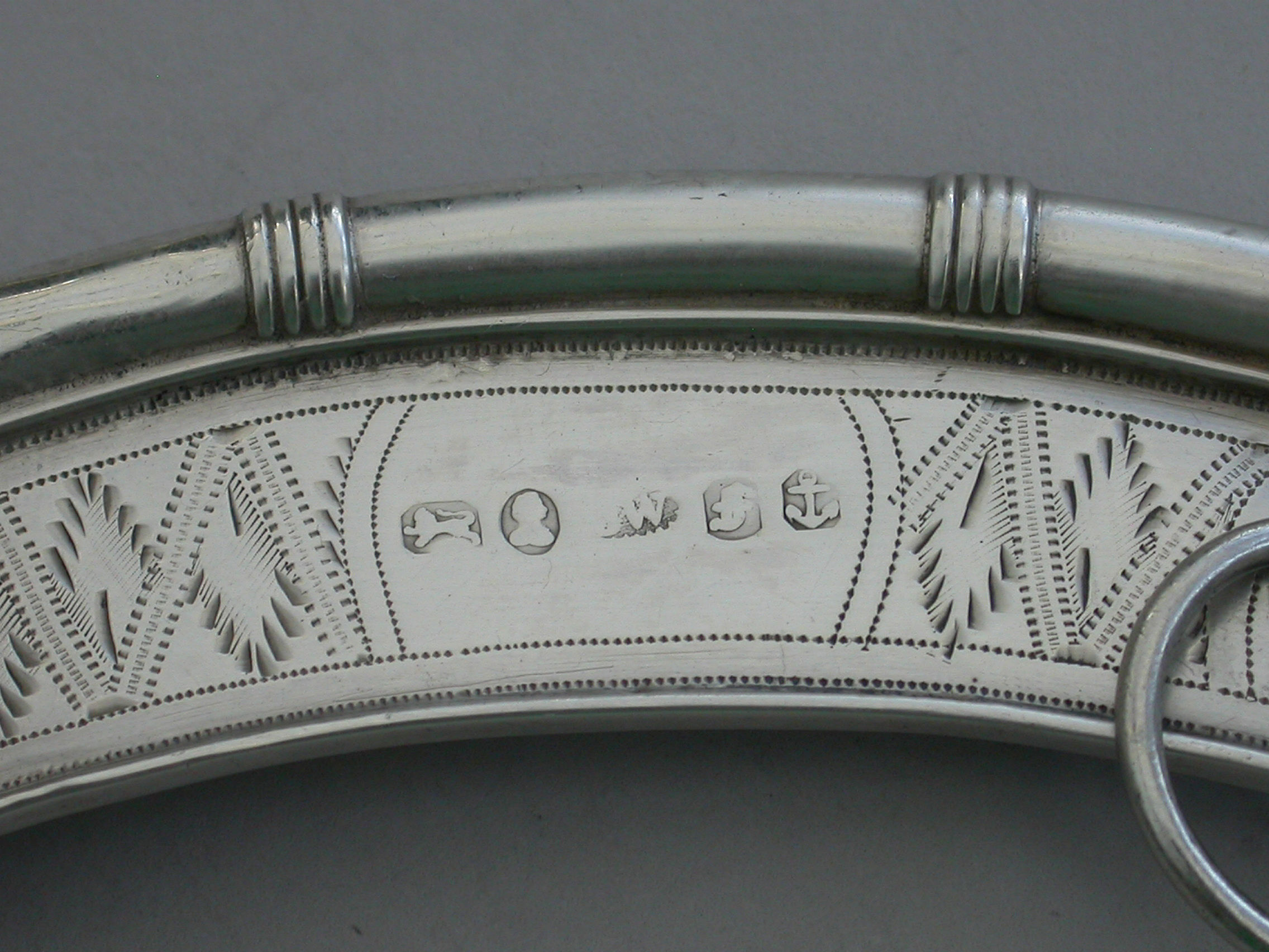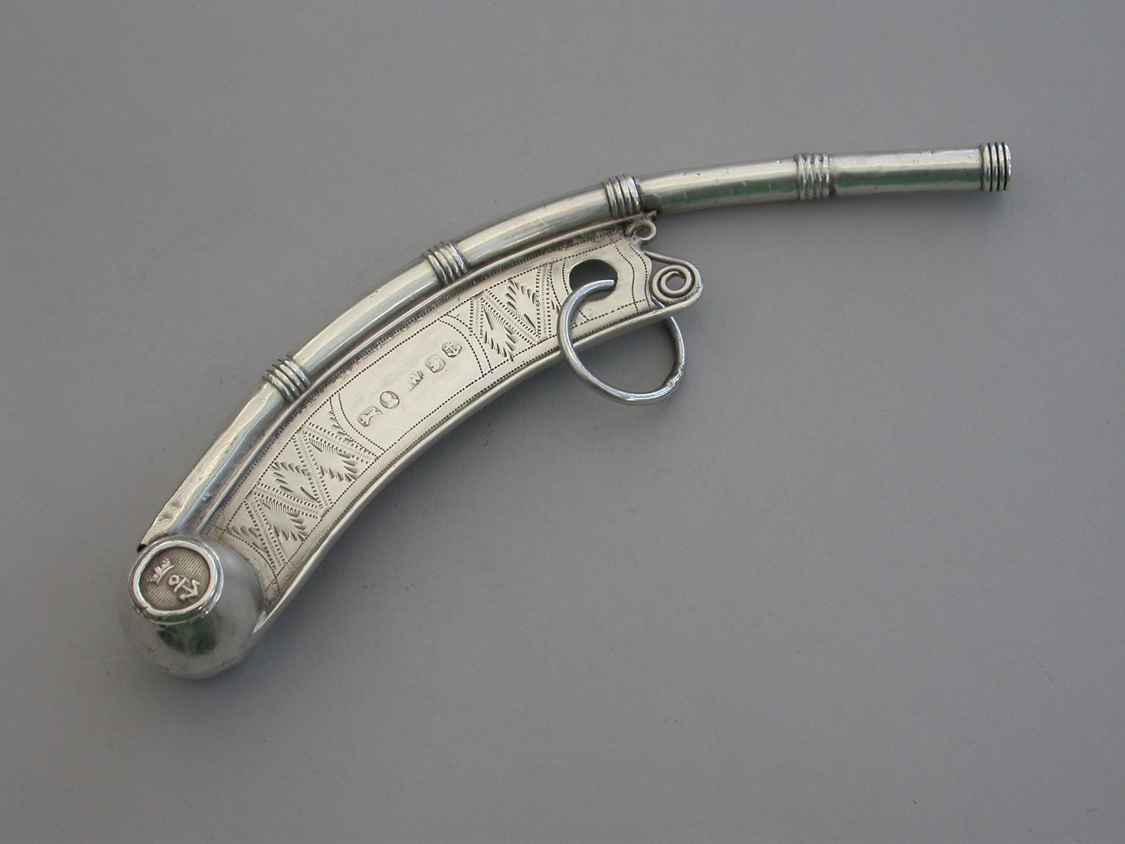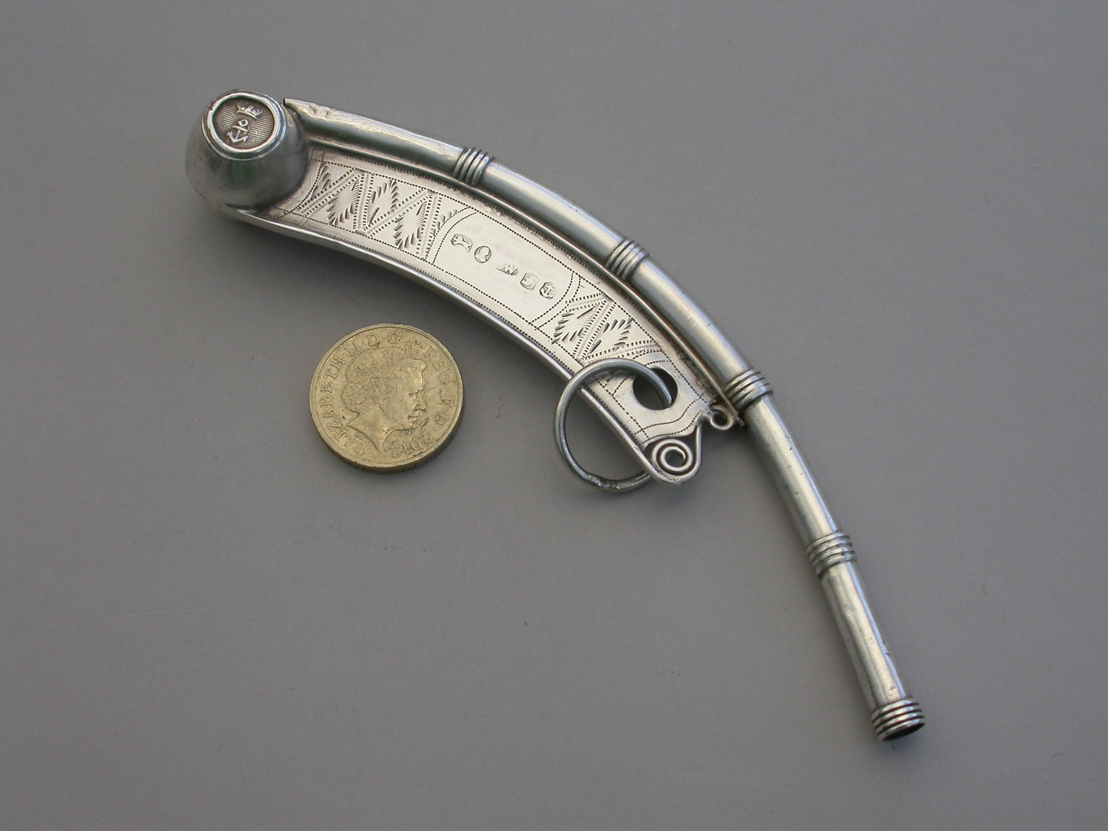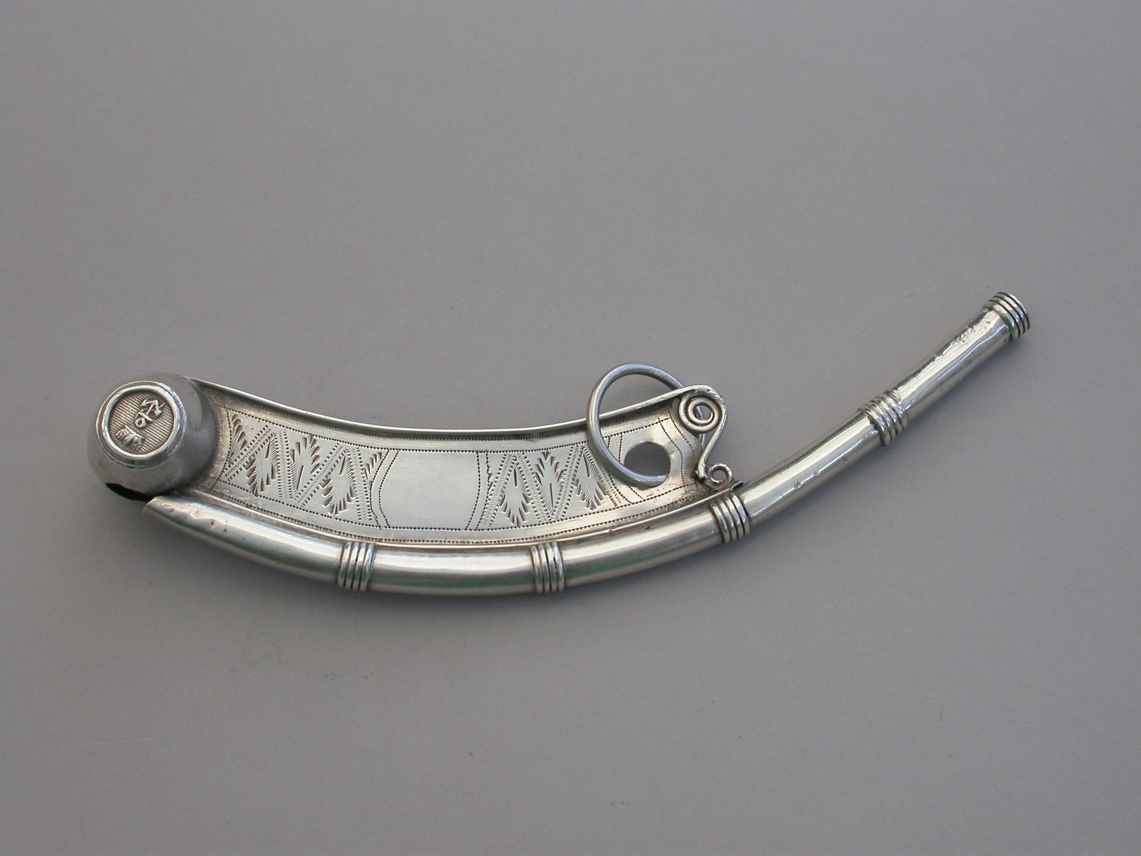 An extremely rare George IV silver Bosuns Whistle of an unusually large size, the buoy stamped on either side with the Royal Navy Crown and Anchor mark, the keel with scratch engraved decoration and a vacant cartouche, reeded bands to the pipe. Complete with suspension ring.