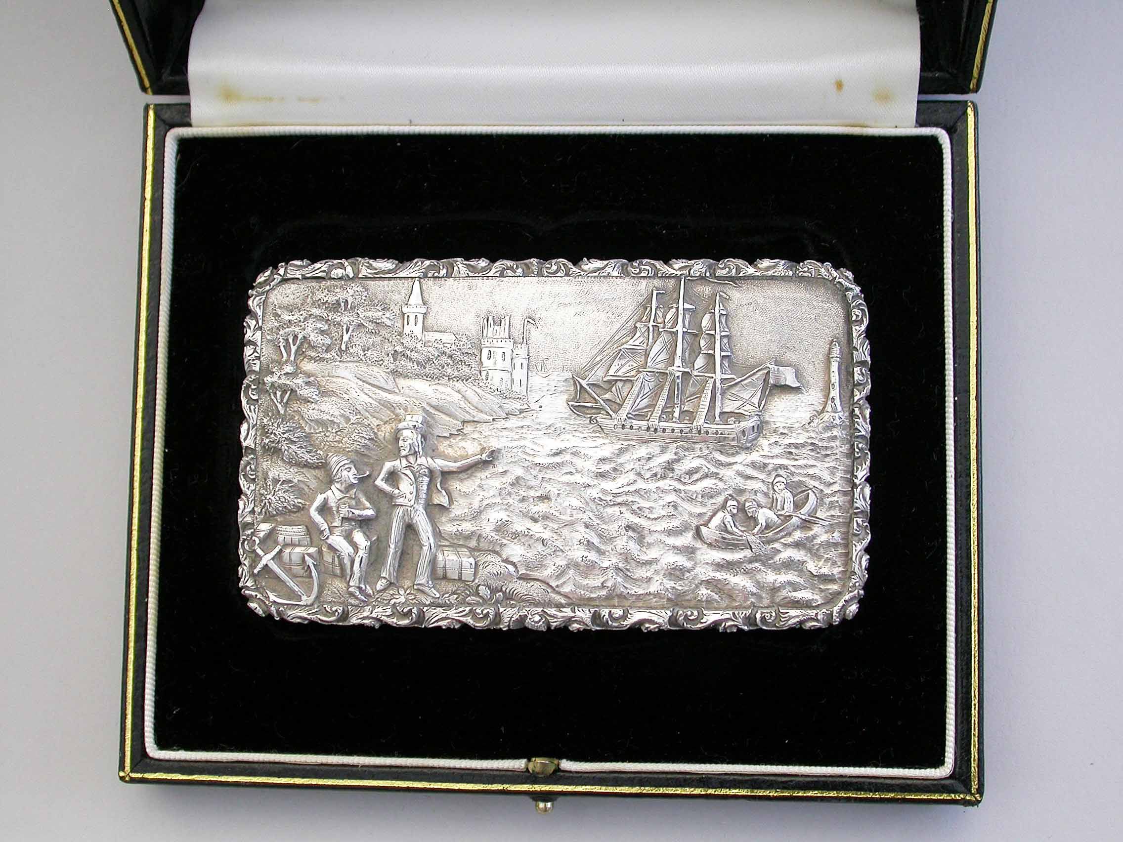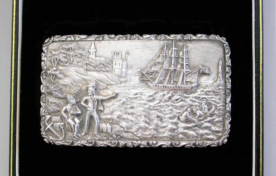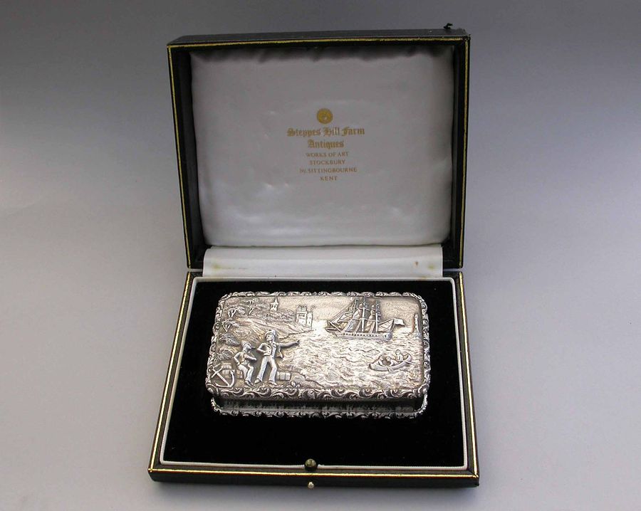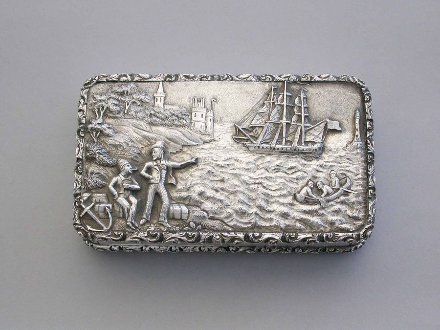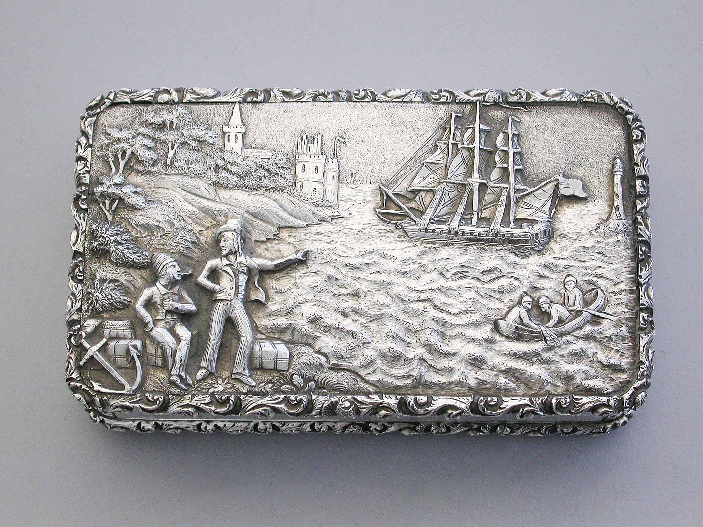 A very fine quality William IV Presentation Silver Snuff Box, with engine turned base and sides and raised foliate scroll chased borders, the lid with a high relief harbour scene, probably a capriccio of a Mediterranean port with a church and castle to one side and a lighthouse to the other, a fully rigged British Frigate and a fishing boat at sea, and two sailors on the shore with packages and an anchor. Silver gilt interior with contemporary presentation inscription. In silk and velvet lined leather case.