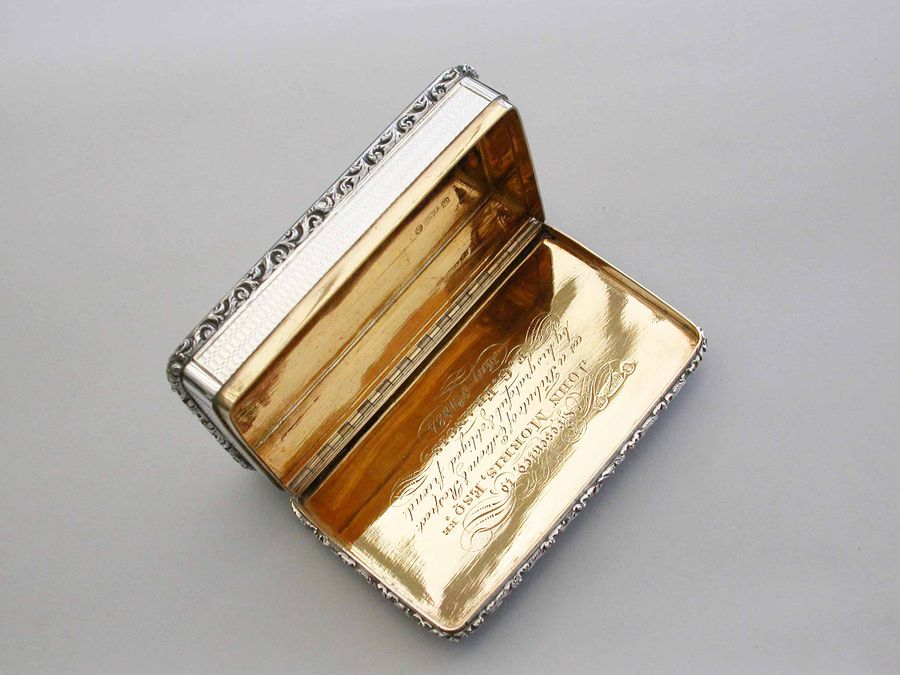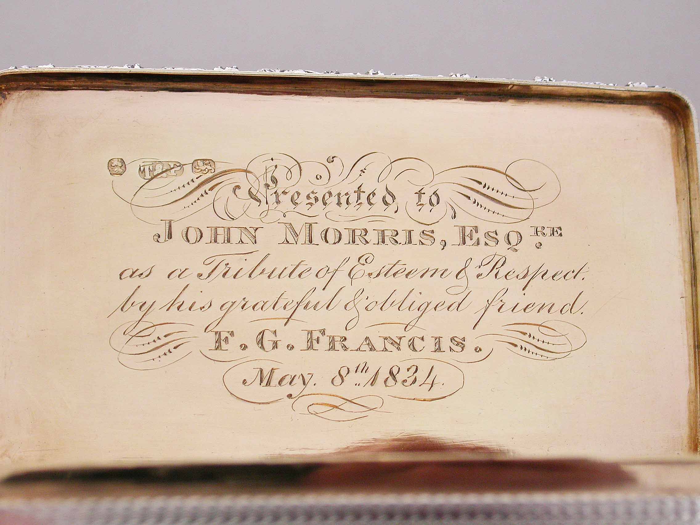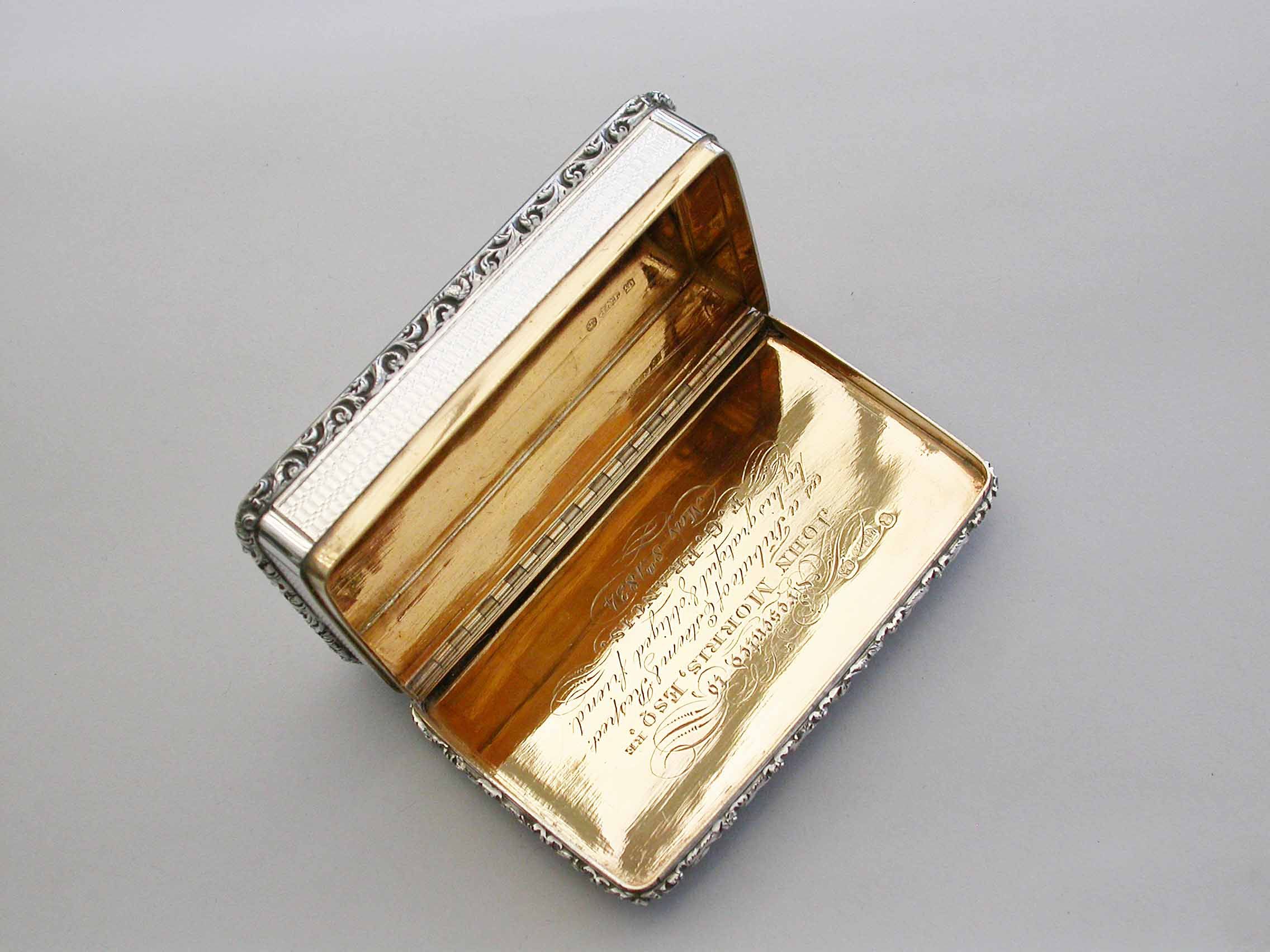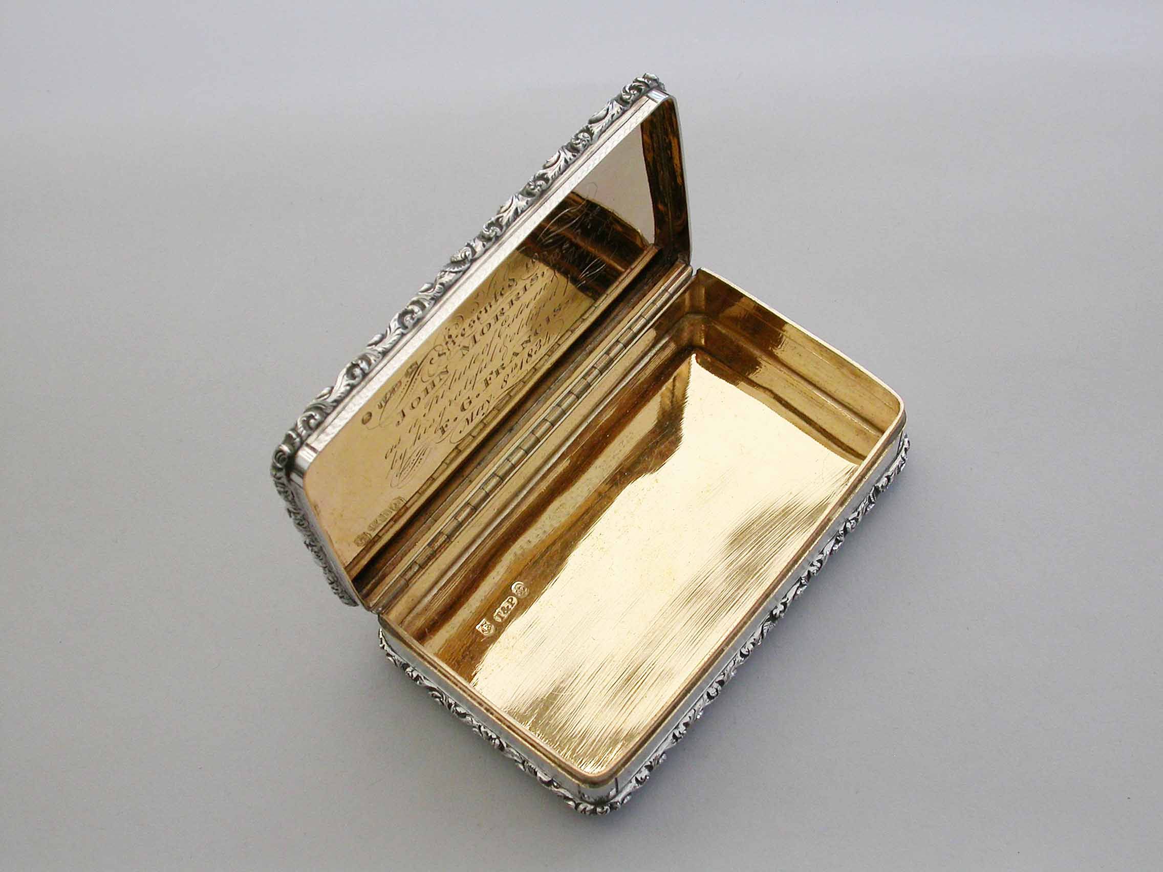A very fine quality William IV Presentation Silver Snuff Box, with engine turned base and sides and raised foliate scroll chased borders, the lid with a high relief harbour scene, probably a capriccio of a Mediterranean port with a church and castle to one side and a lighthouse to the other, a fully rigged British Frigate and a fishing boat at sea, and two sailors on the shore with packages and an anchor. Silver gilt interior with contemporary presentation inscription. In silk and velvet lined leather case.