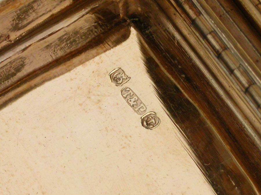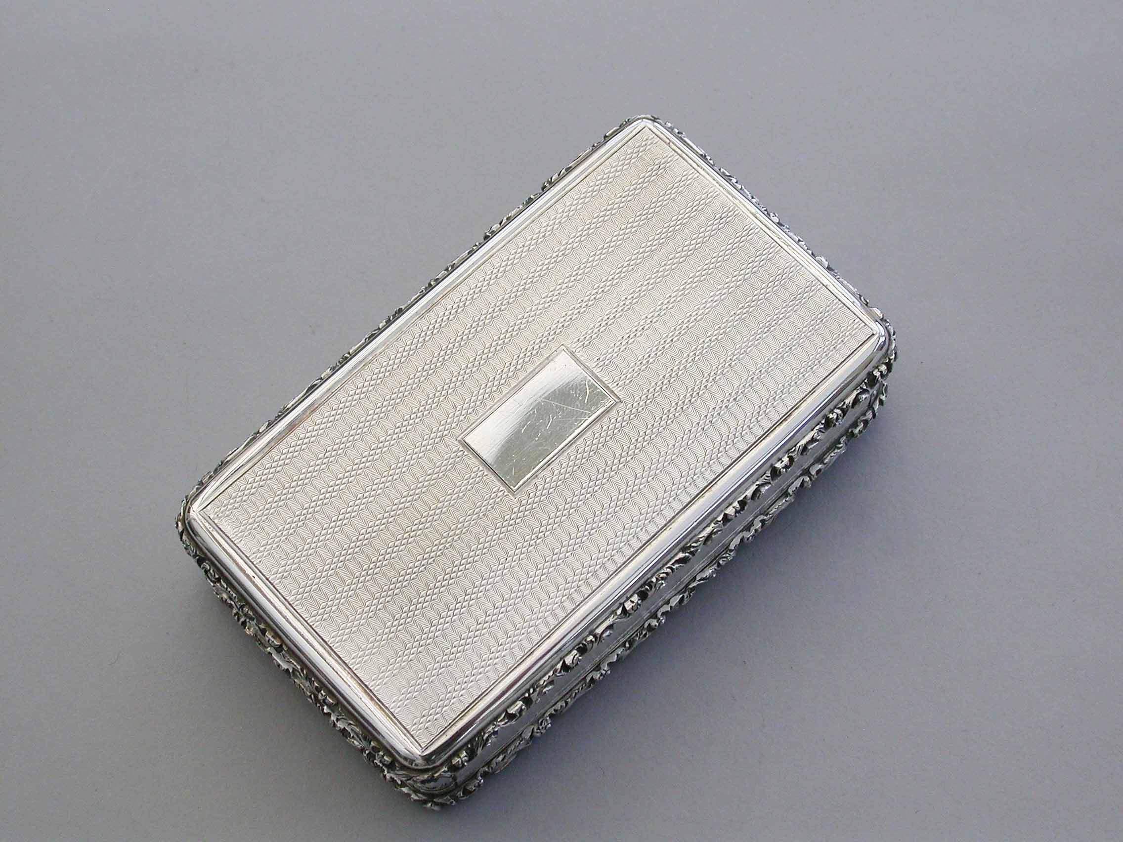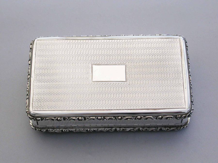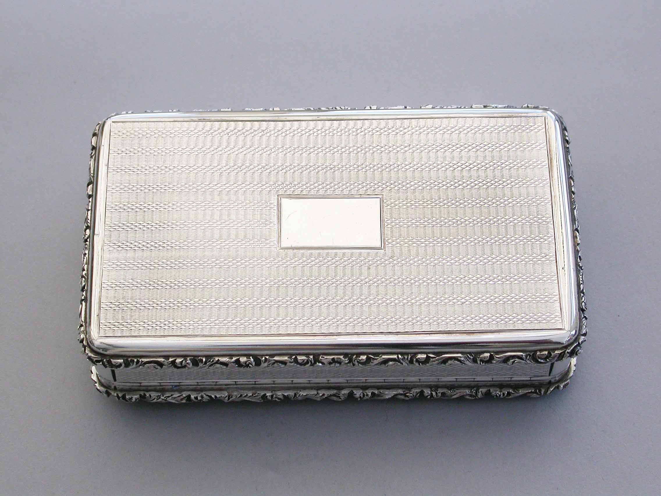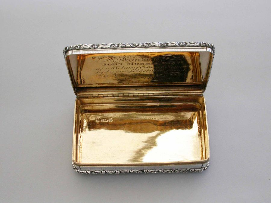 A very fine quality William IV Presentation Silver Snuff Box, with engine turned base and sides and raised foliate scroll chased borders, the lid with a high relief harbour scene, probably a capriccio of a Mediterranean port with a church and castle to one side and a lighthouse to the other, a fully rigged British Frigate and a fishing boat at sea, and two sailors on the shore with packages and an anchor. Silver gilt interior with contemporary presentation inscription. In silk and velvet lined leather case.
