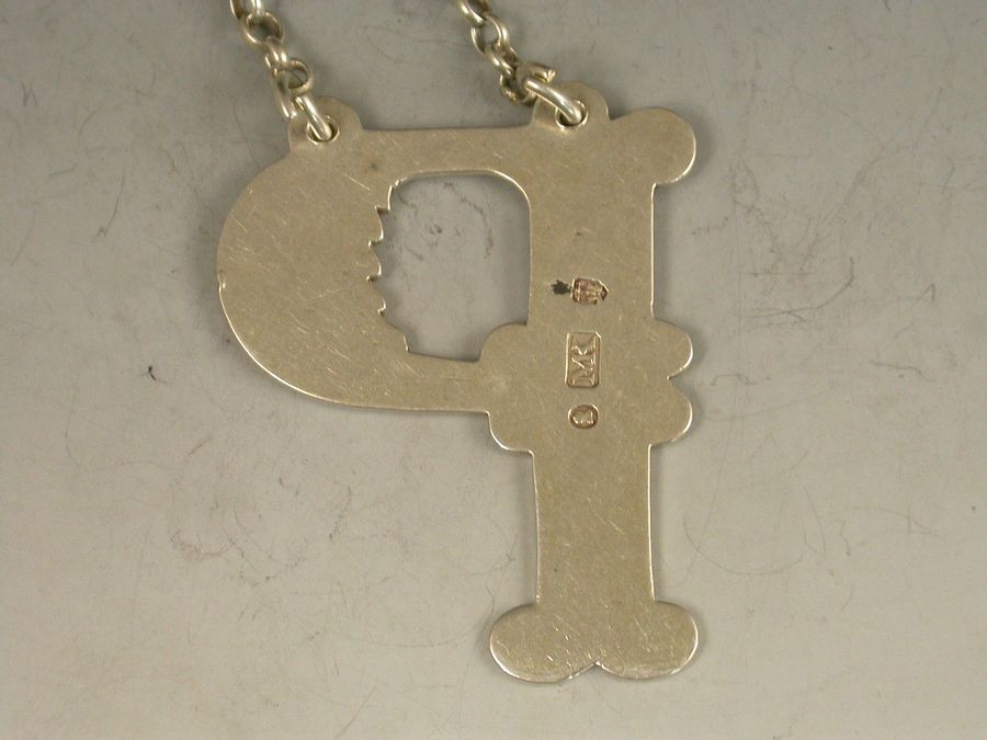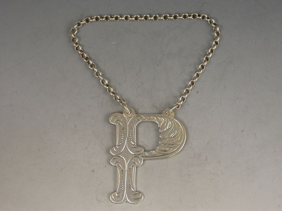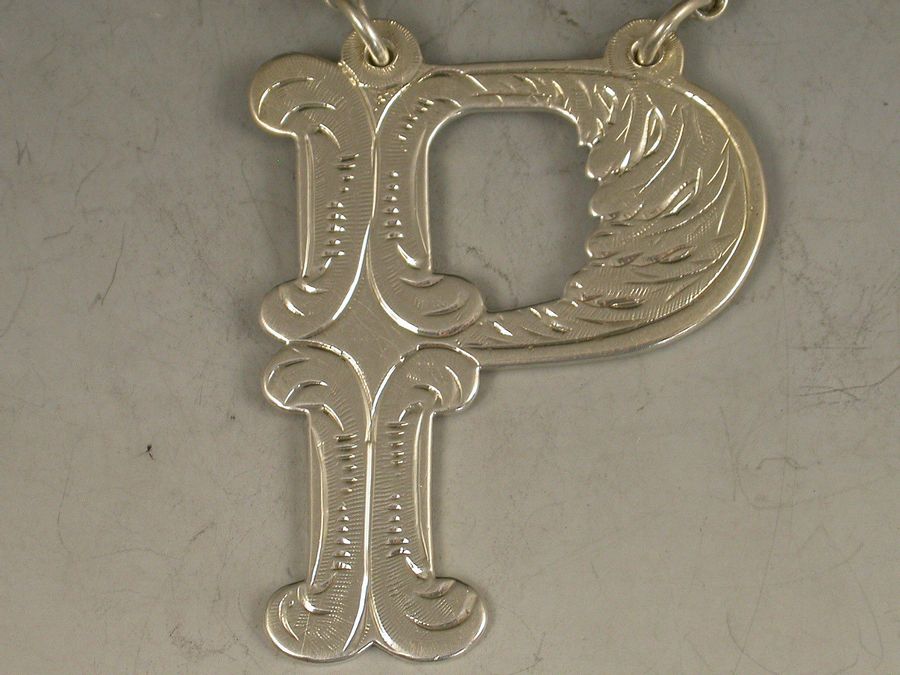 A George IV Scottish silver Wine Label made in the form of a capital letter 'P', decorated with engraved scrolls on a textured background.