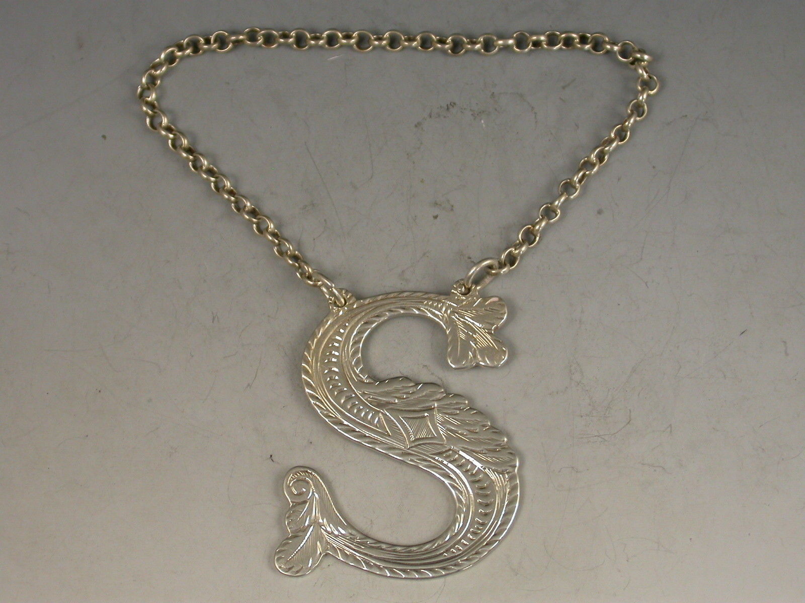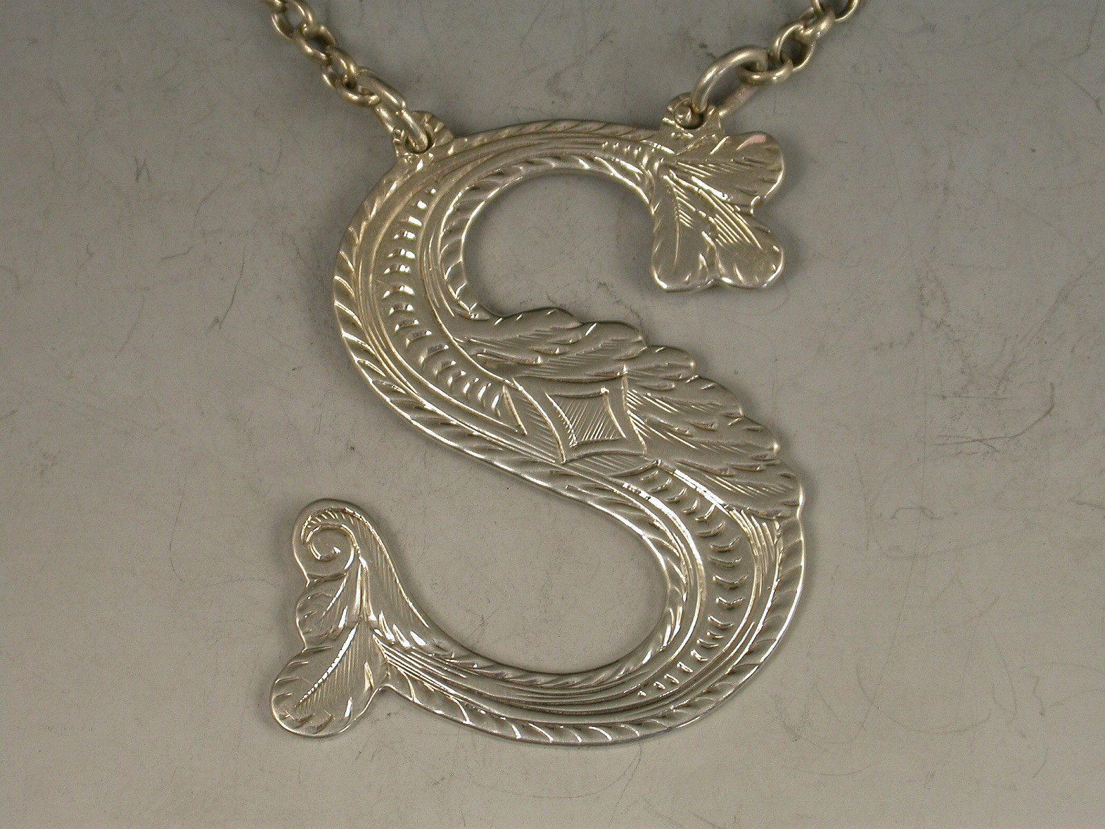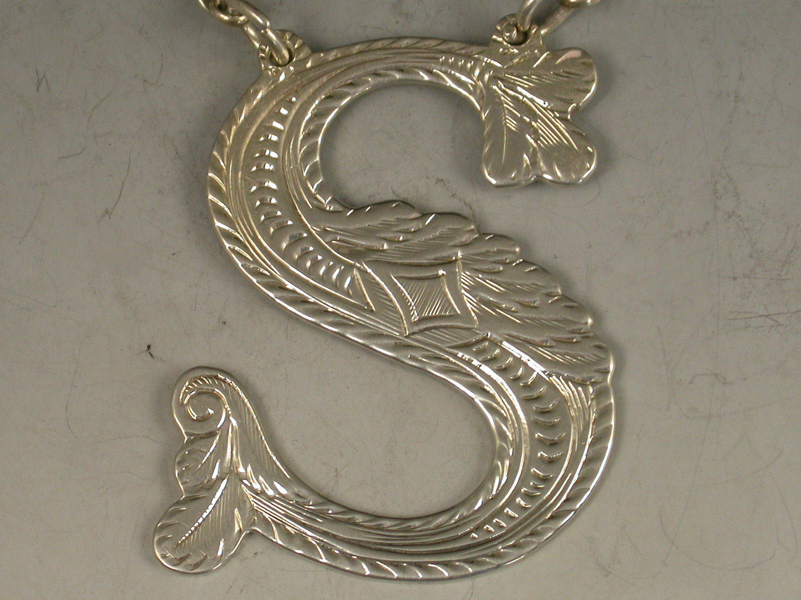 A George IV Scottish silver Wine Label made in the form of a capital letter 'S', decorated with engraved scrolls on a textured background.