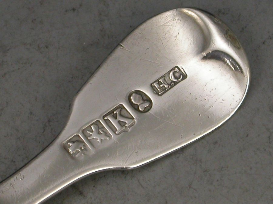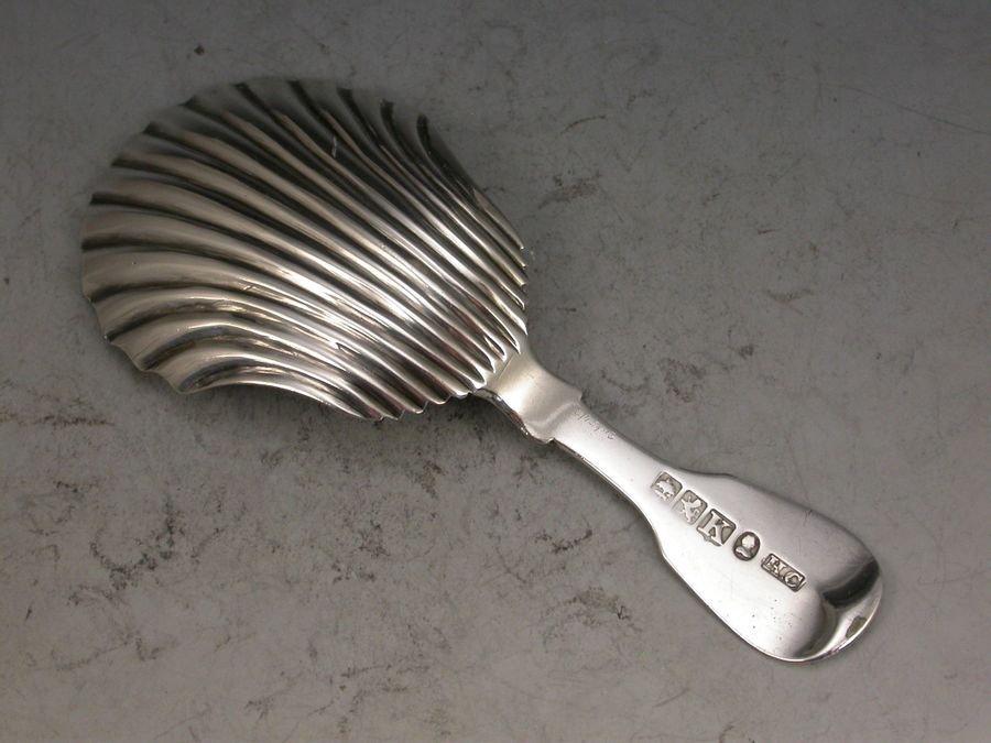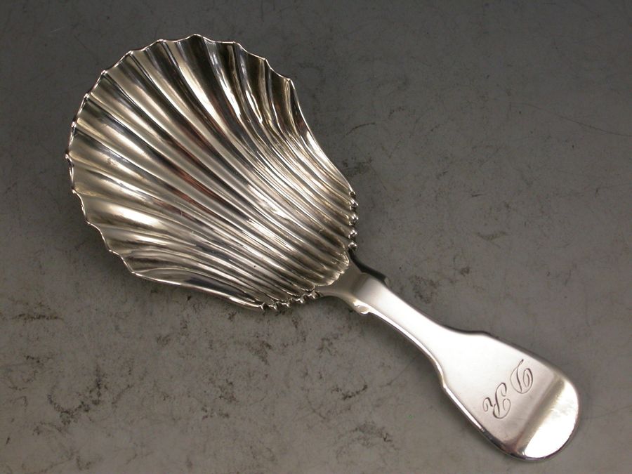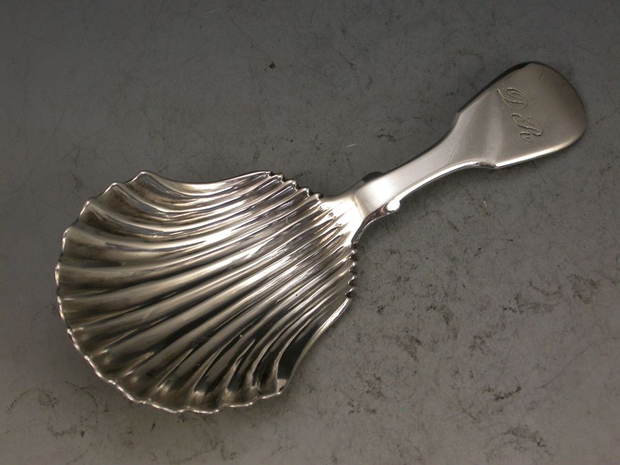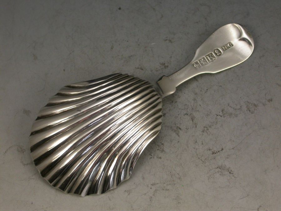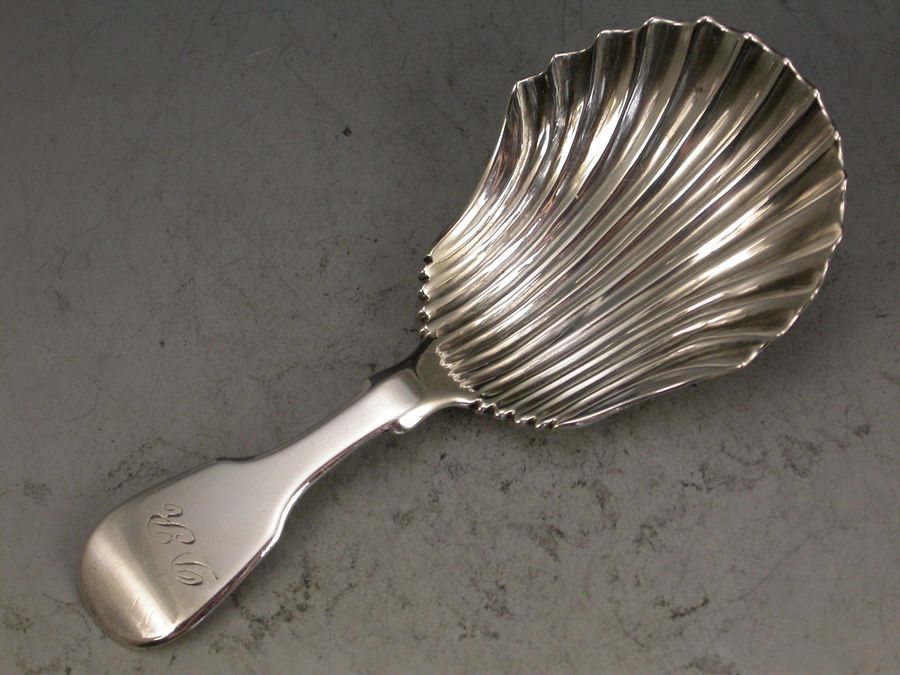 A George IV Scottish silver Caddy Spoon, the plain fiddle pattern handle engraved with contemporary initials, a fluted shell shaped bowl.