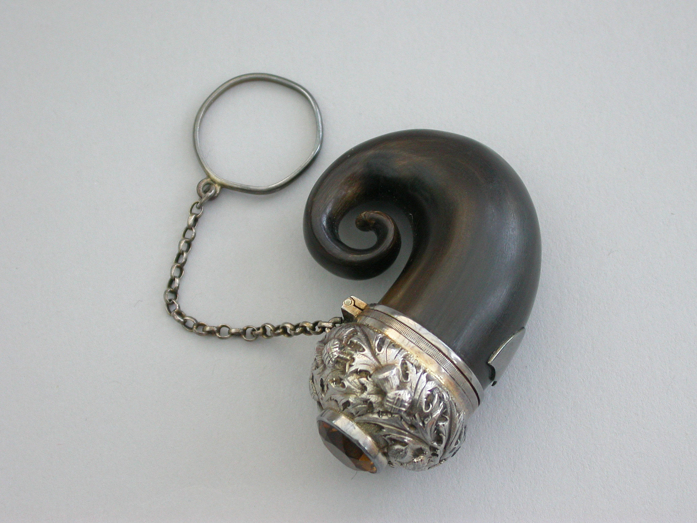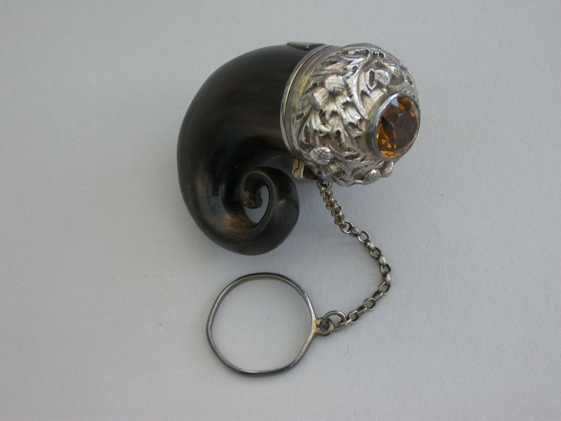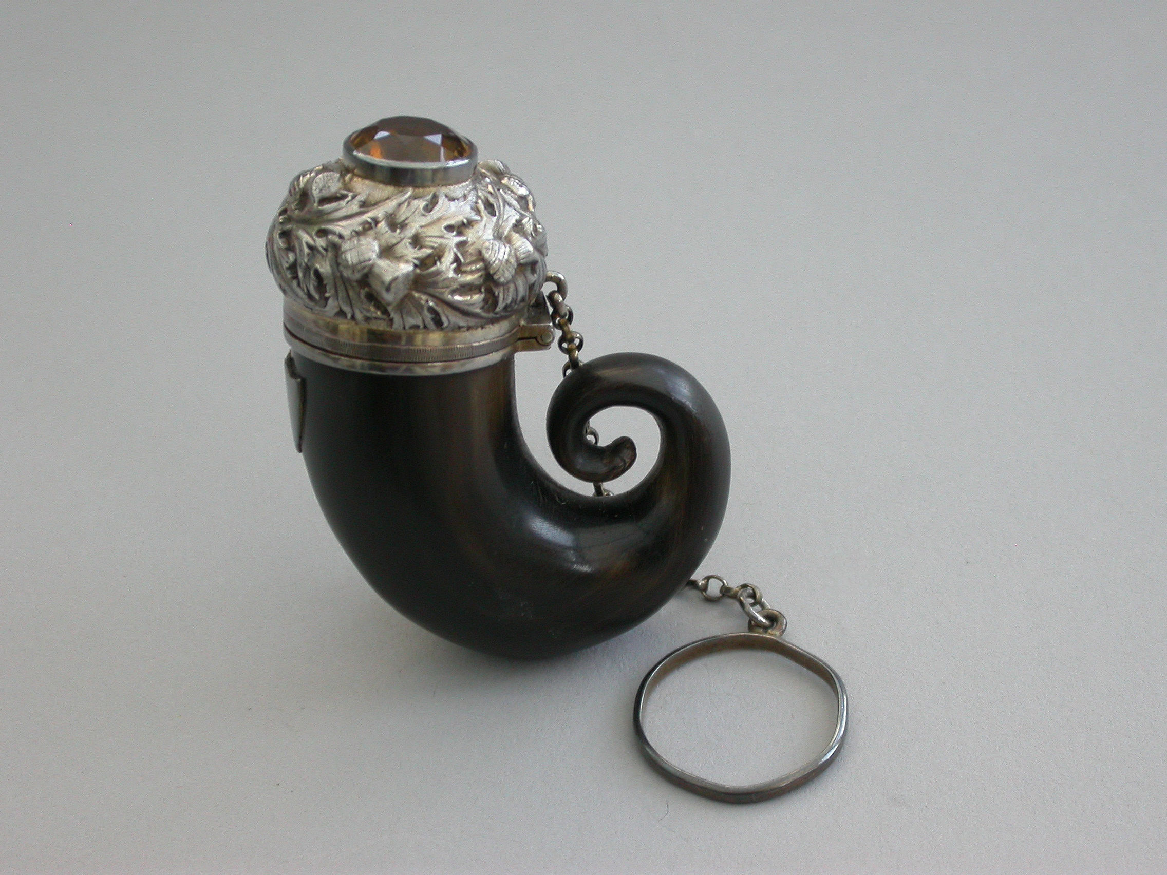 A good George IV Scottish silver mounted horn Vinaigrette formed as a Snuff Mull with chain and finger ring, the horn body with applied vacant shield shaped cartouche. The silver cover set with a central cairngorn stone surrounded by embossed thistles. The interior hinged silver gilt grille engraved with scrolls within a dot pierced border.