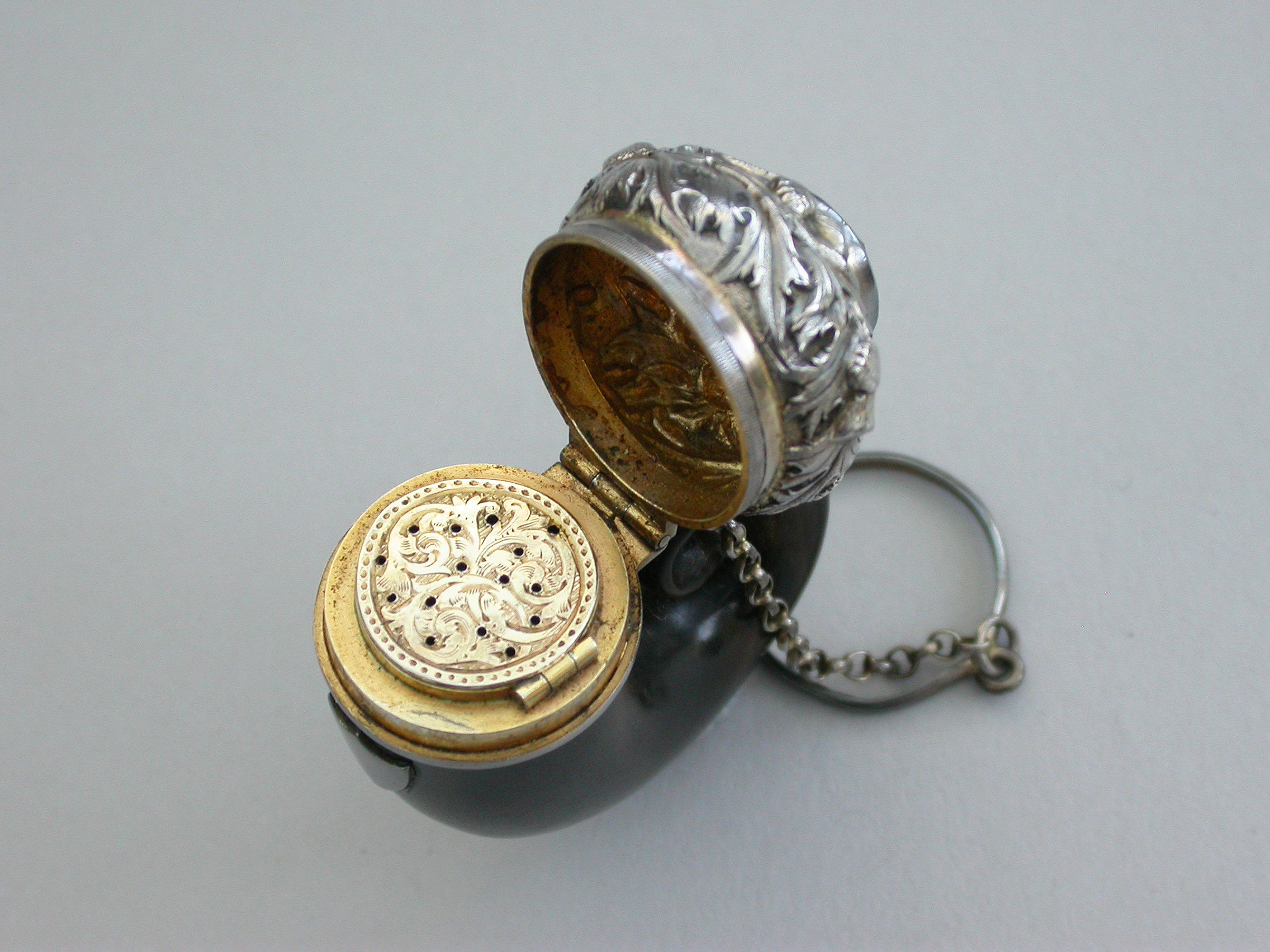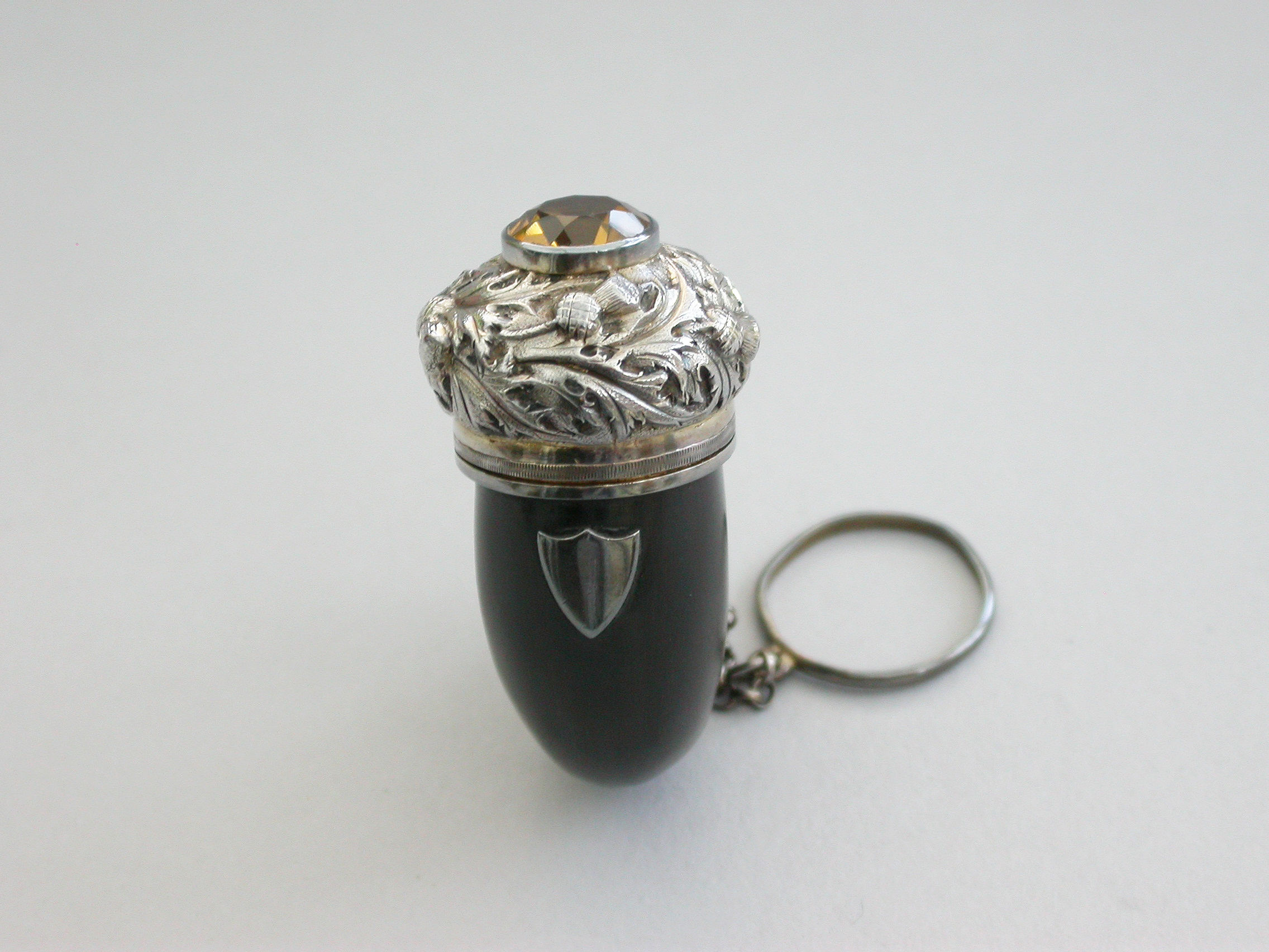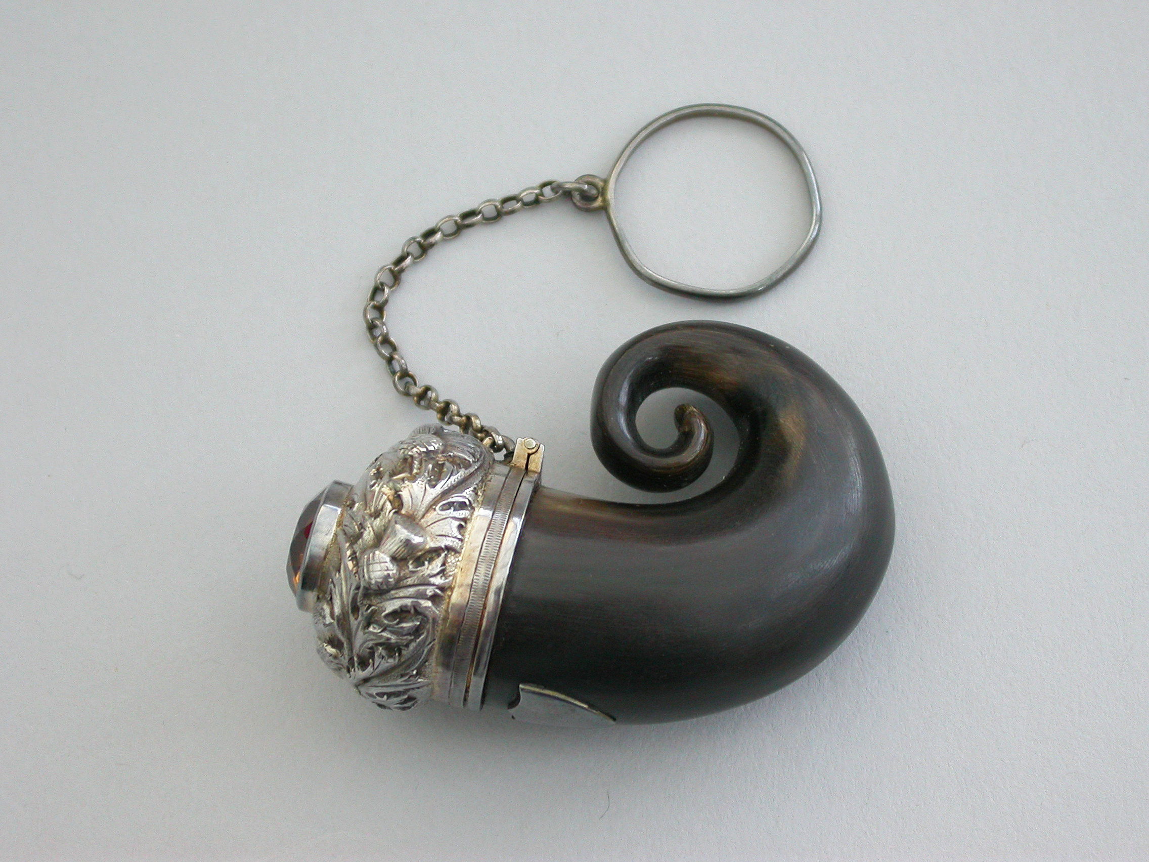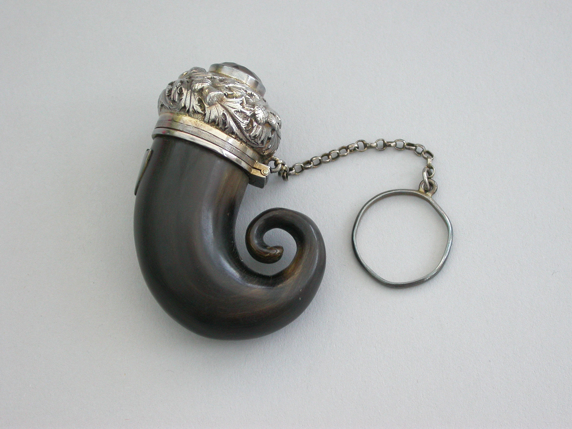 A good George IV Scottish silver mounted horn Vinaigrette formed as a Snuff Mull with chain and finger ring, the horn body with applied vacant shield shaped cartouche. The silver cover set with a central cairngorn stone surrounded by embossed thistles. The interior hinged silver gilt grille engraved with scrolls within a dot pierced border.
