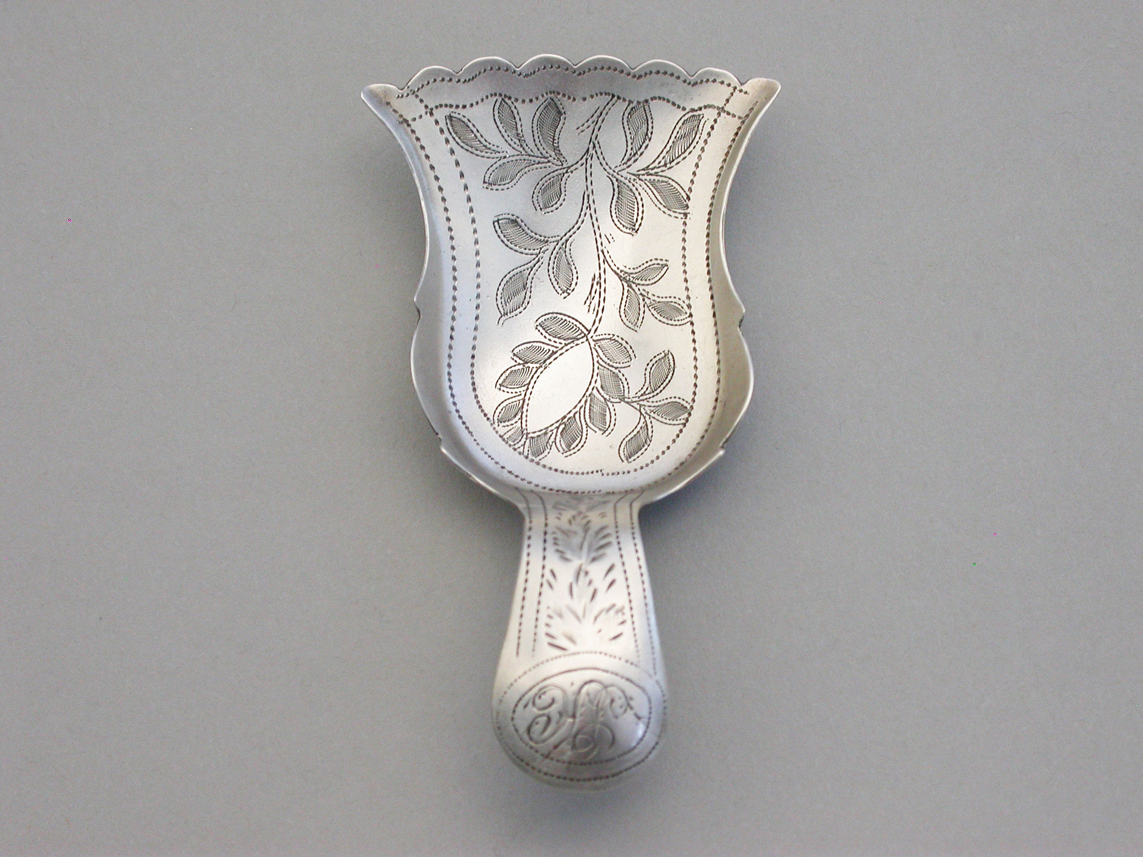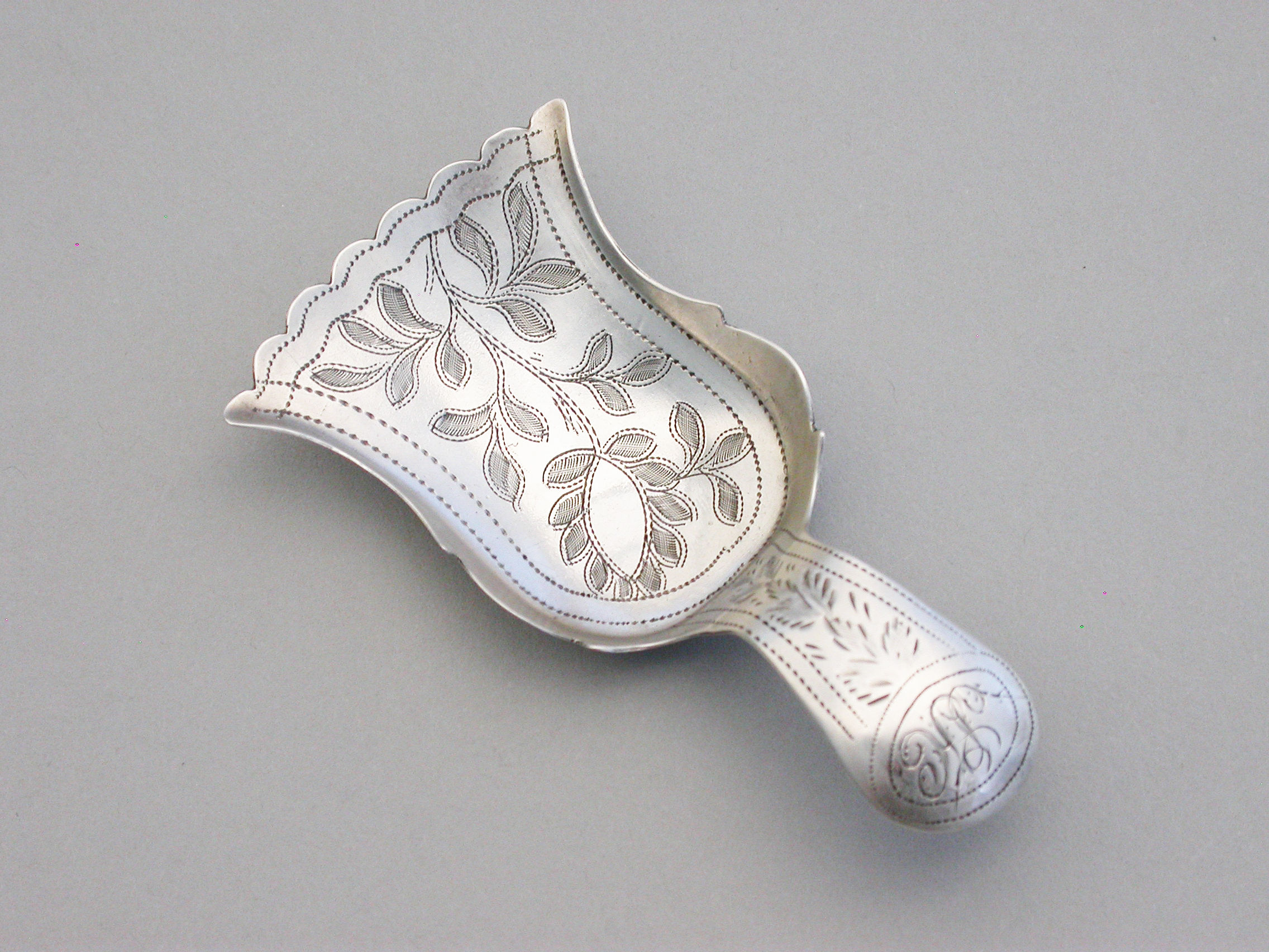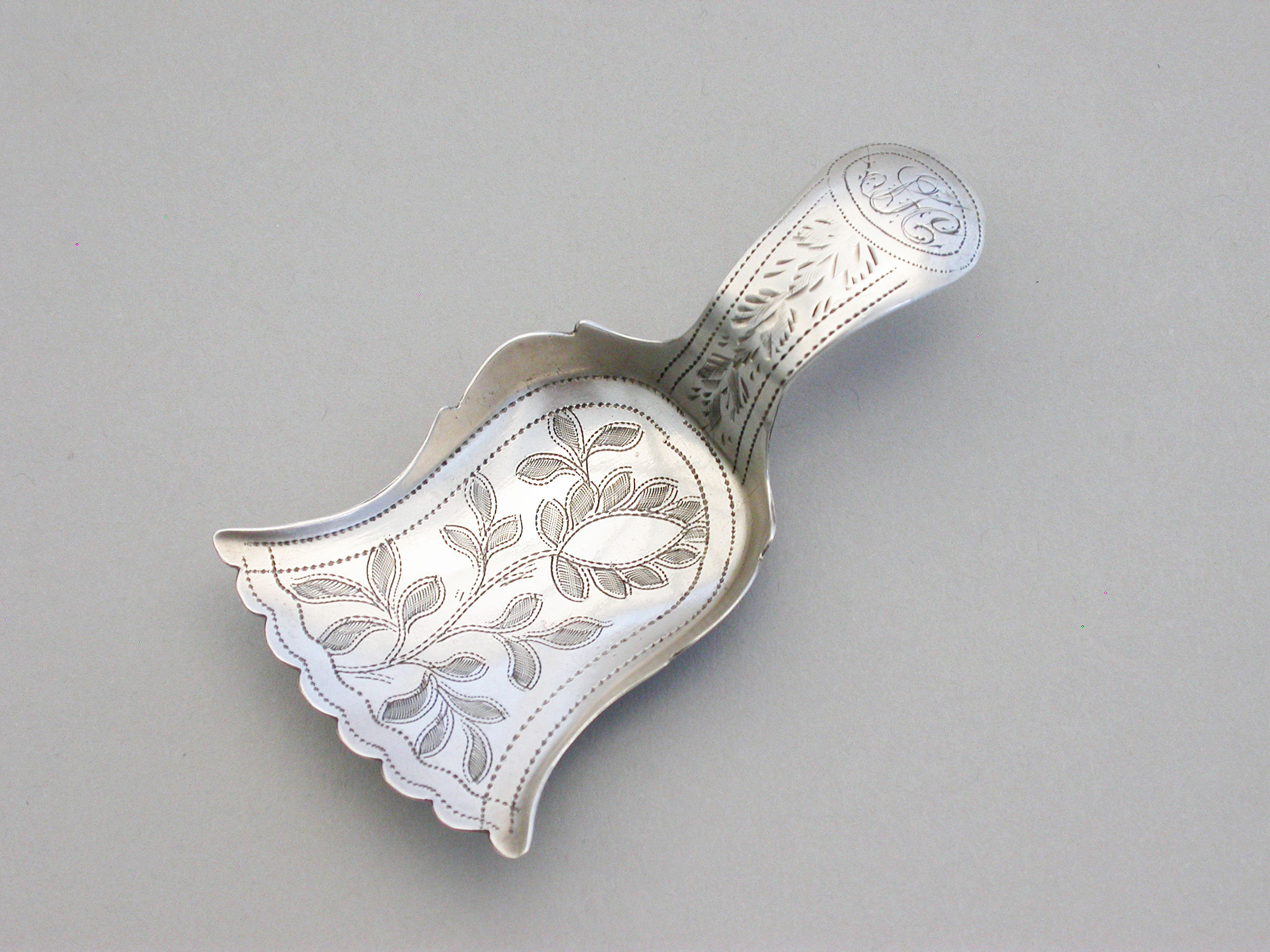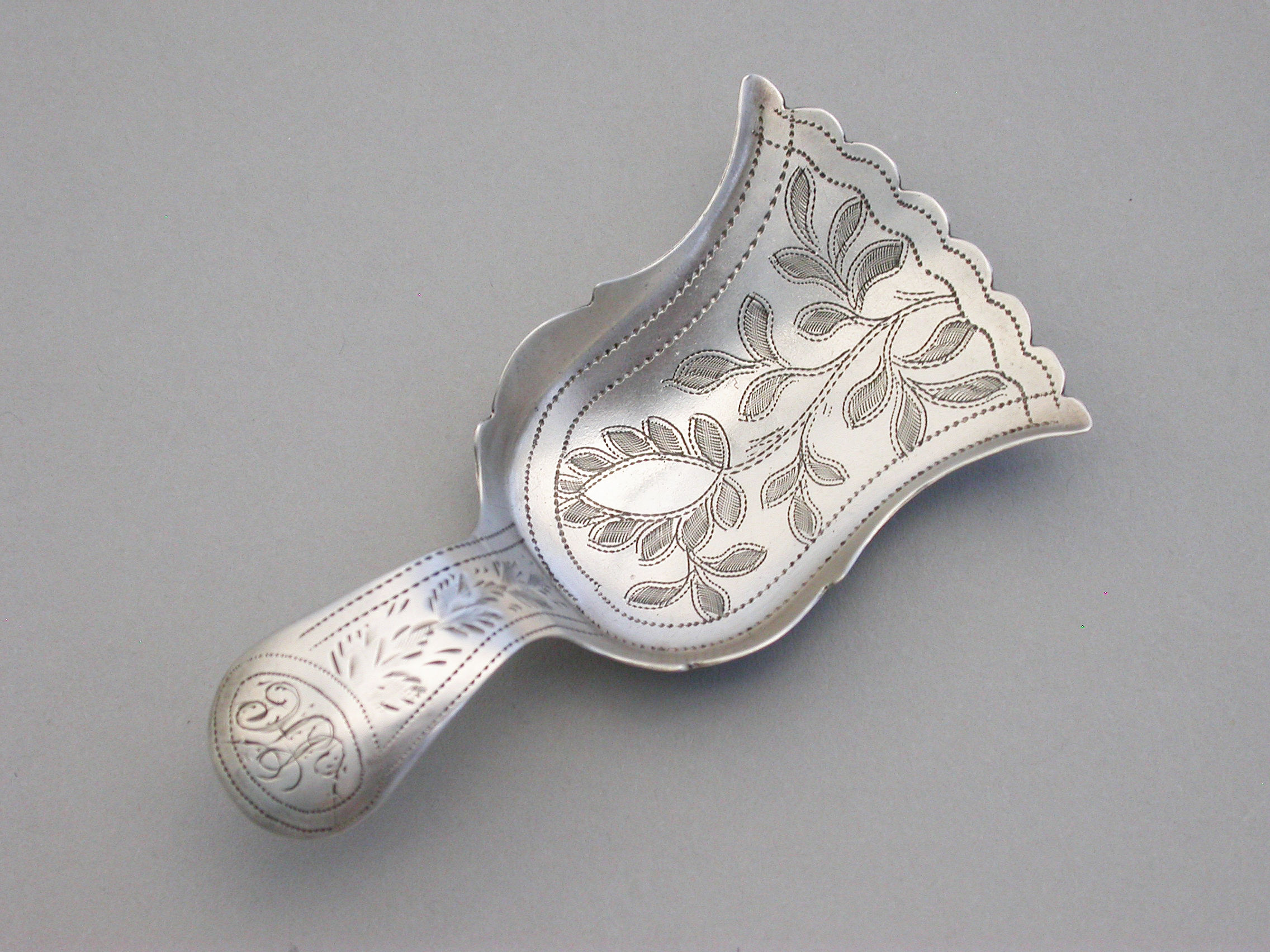 A good George IV silver Caddy Spoon, the bell shaped bowl bright-cut engraved with flowers and a bright-cut engraved Old English handle.
