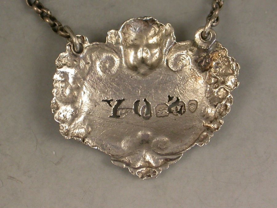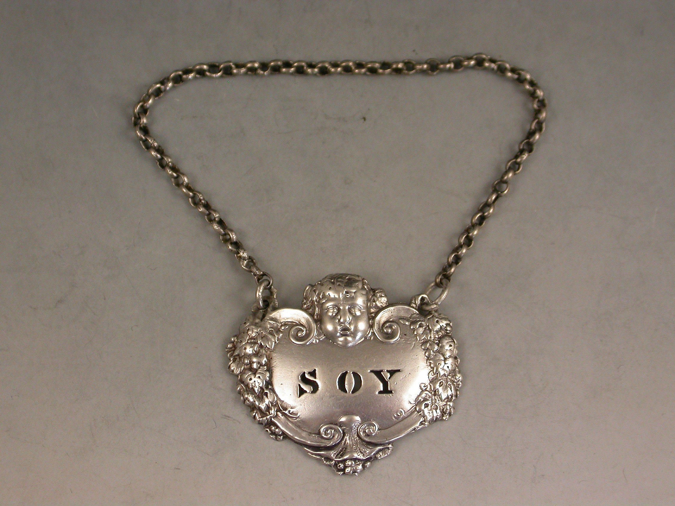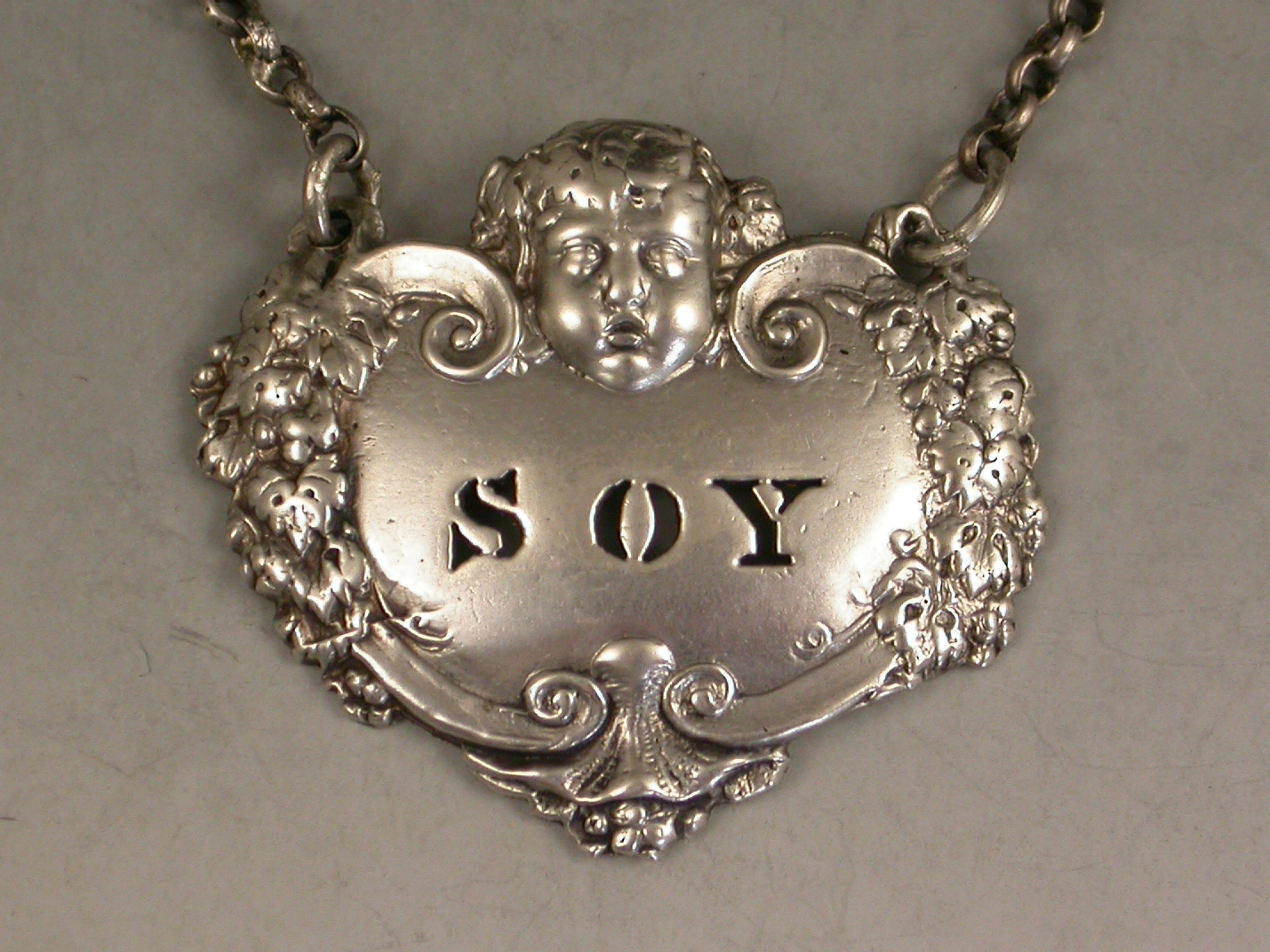 A rare George IV cast silver Sauce Label of cartouche form with cherub's head surmount and vine leaf and grape border, a shell to the base, pierced for Soy.