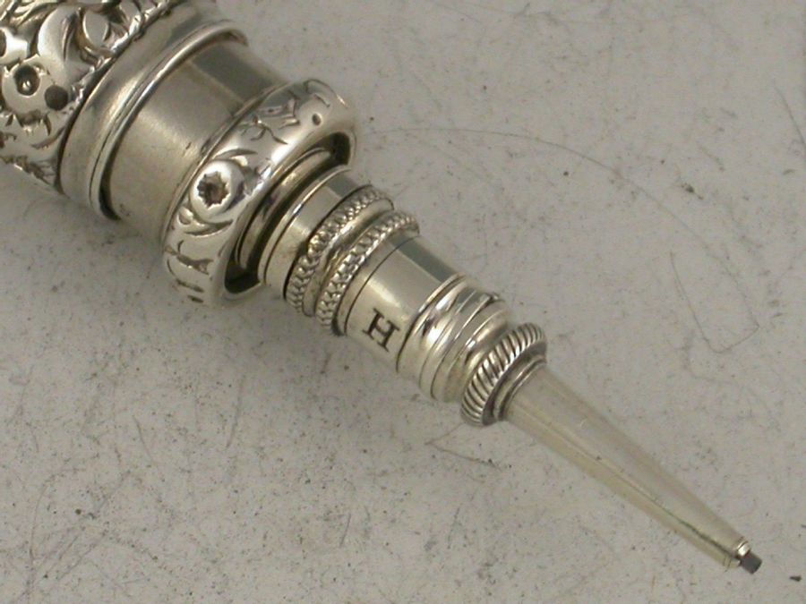 A rare George IV silver Sliding Propelling Pencil and Quill Holder of early date and fine quality, with cast foliate sliding bands and end collars, the quill holder with 'Bramah-type' swivel action.