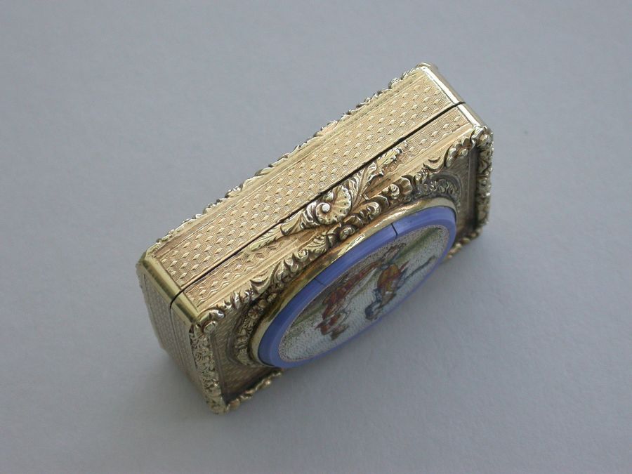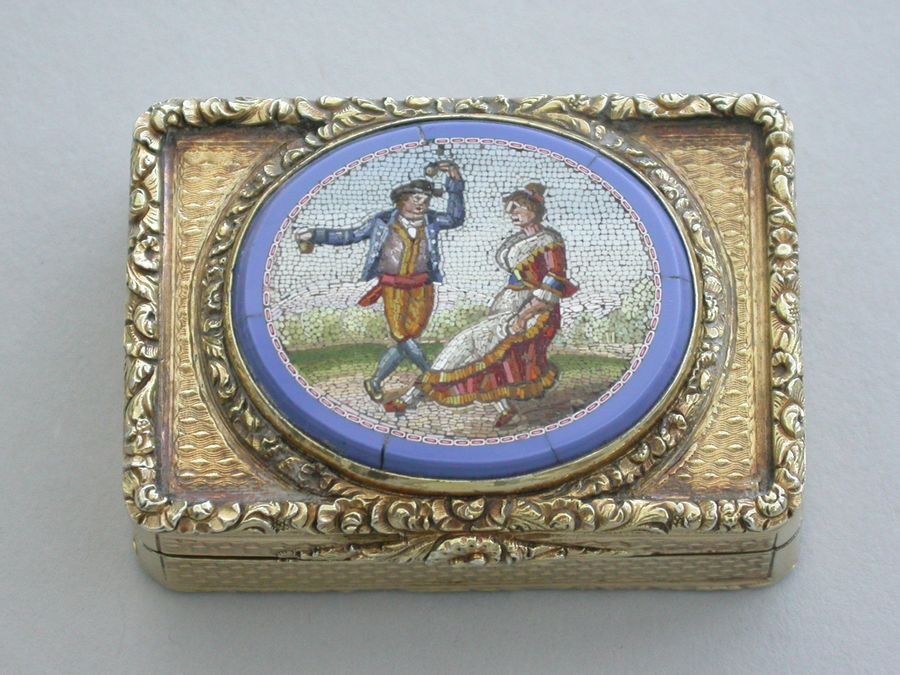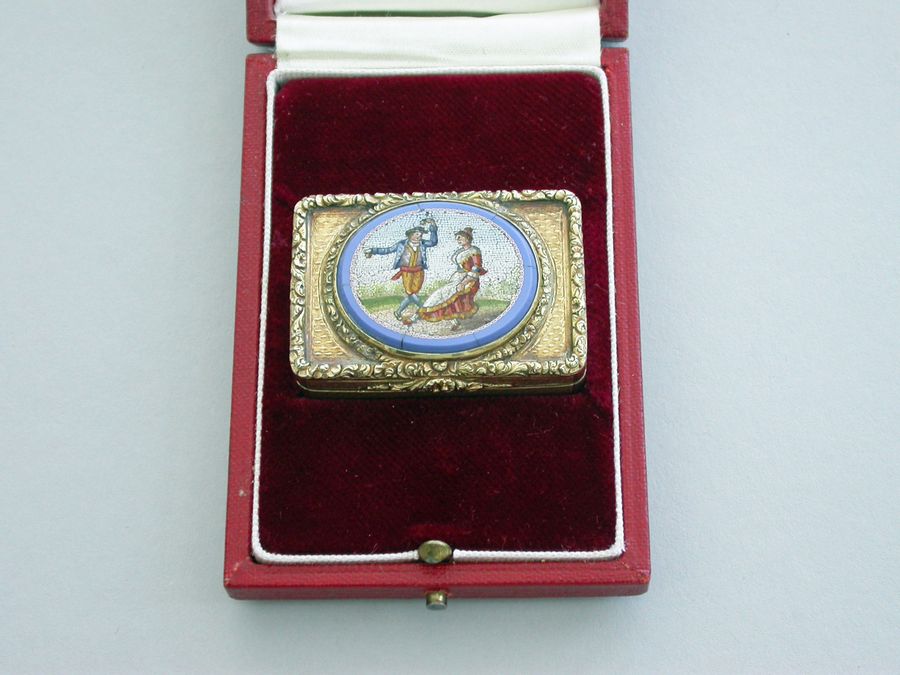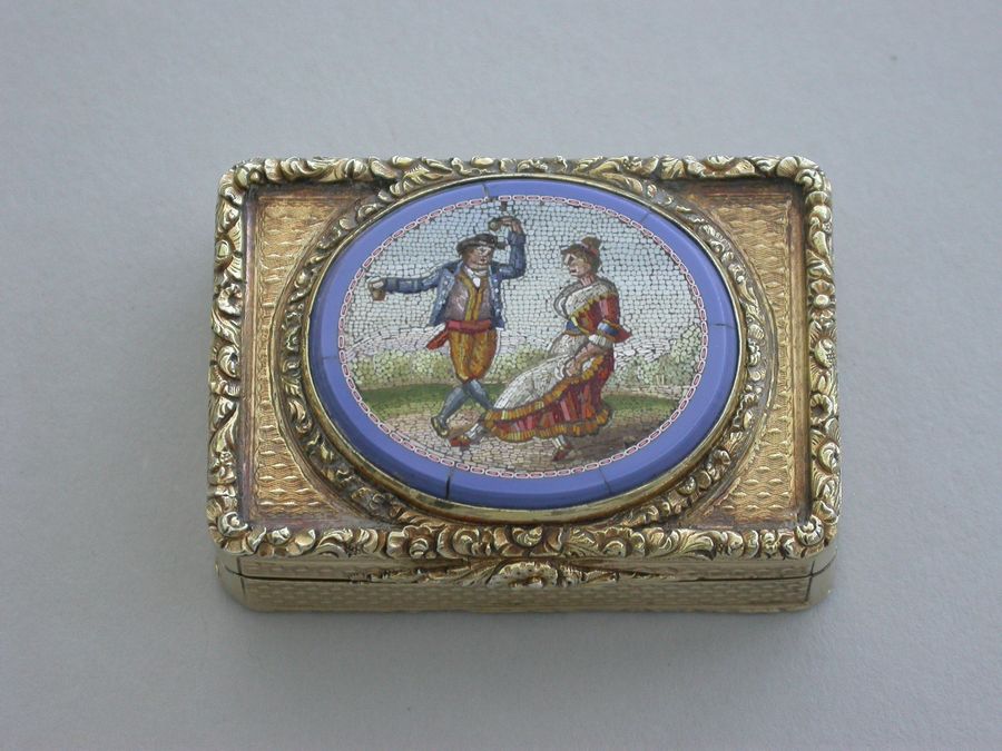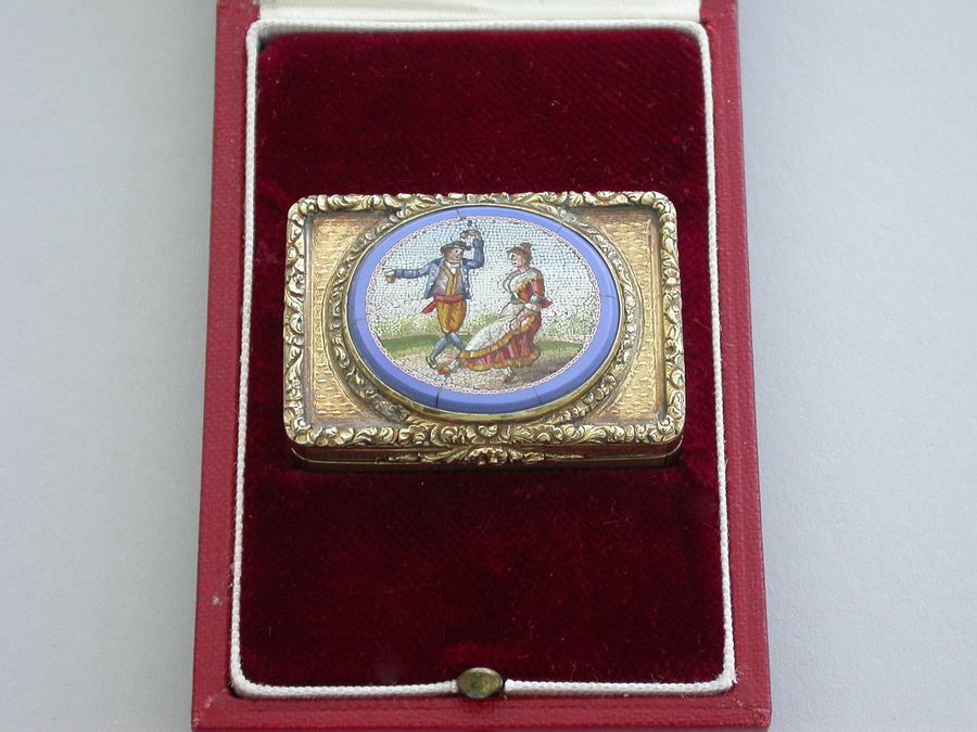 An extremely fine quality George IV silver gilt Vinaigrette of rectangular form with engine turned base and sides, cast raised foliate scroll borders and thumb-piece, the lid set with an early 19th century Italian oval micromosaic panel depicting a dancing couple. Complete with modern Asprey & Co silk and velvet lined leather retailers case.