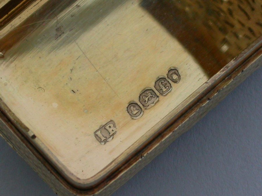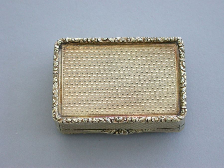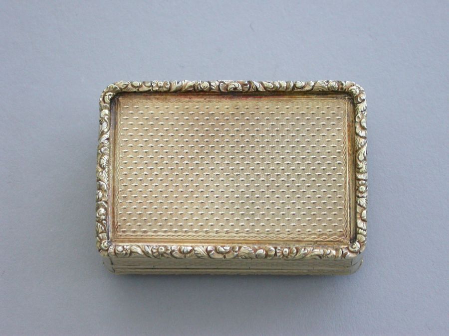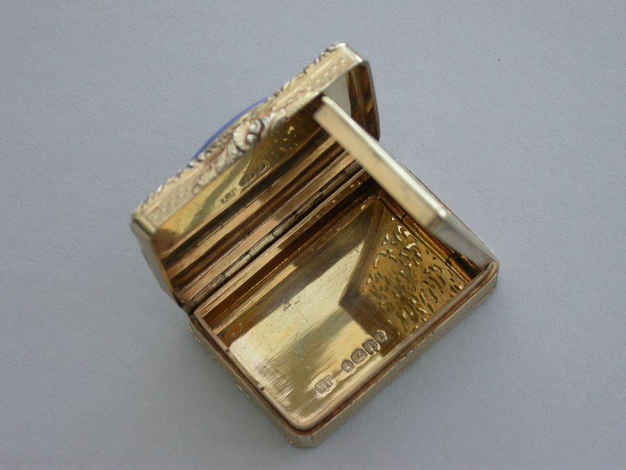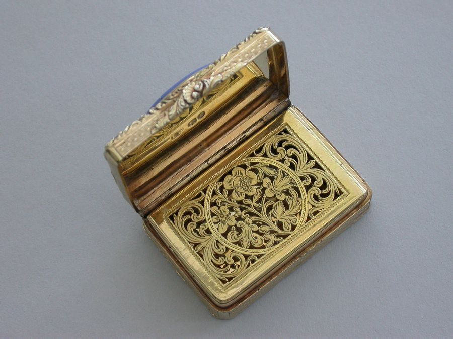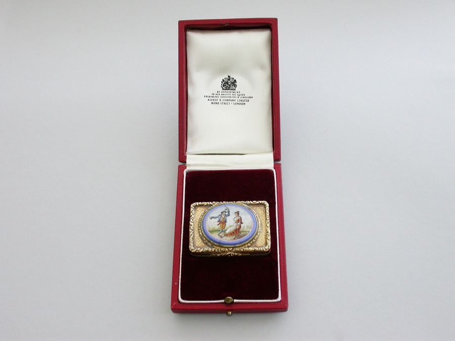 An extremely fine quality George IV silver gilt Vinaigrette of rectangular form with engine turned base and sides, cast raised foliate scroll borders and thumb-piece, the lid set with an early 19th century Italian oval micromosaic panel depicting a dancing couple. Complete with modern Asprey & Co silk and velvet lined leather retailers case.
