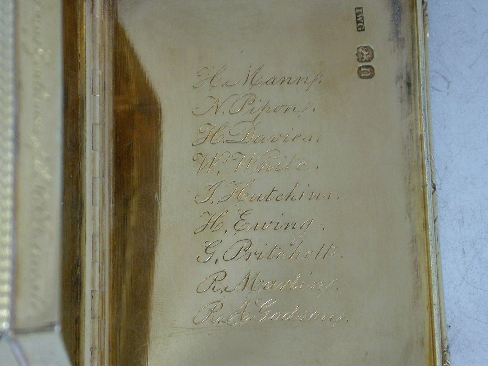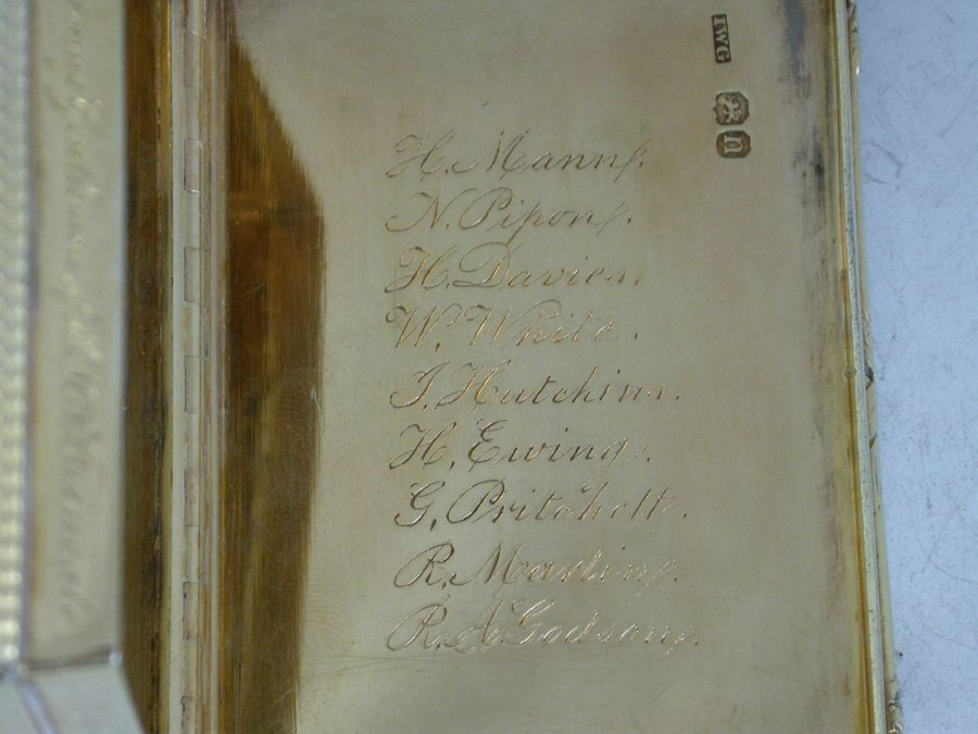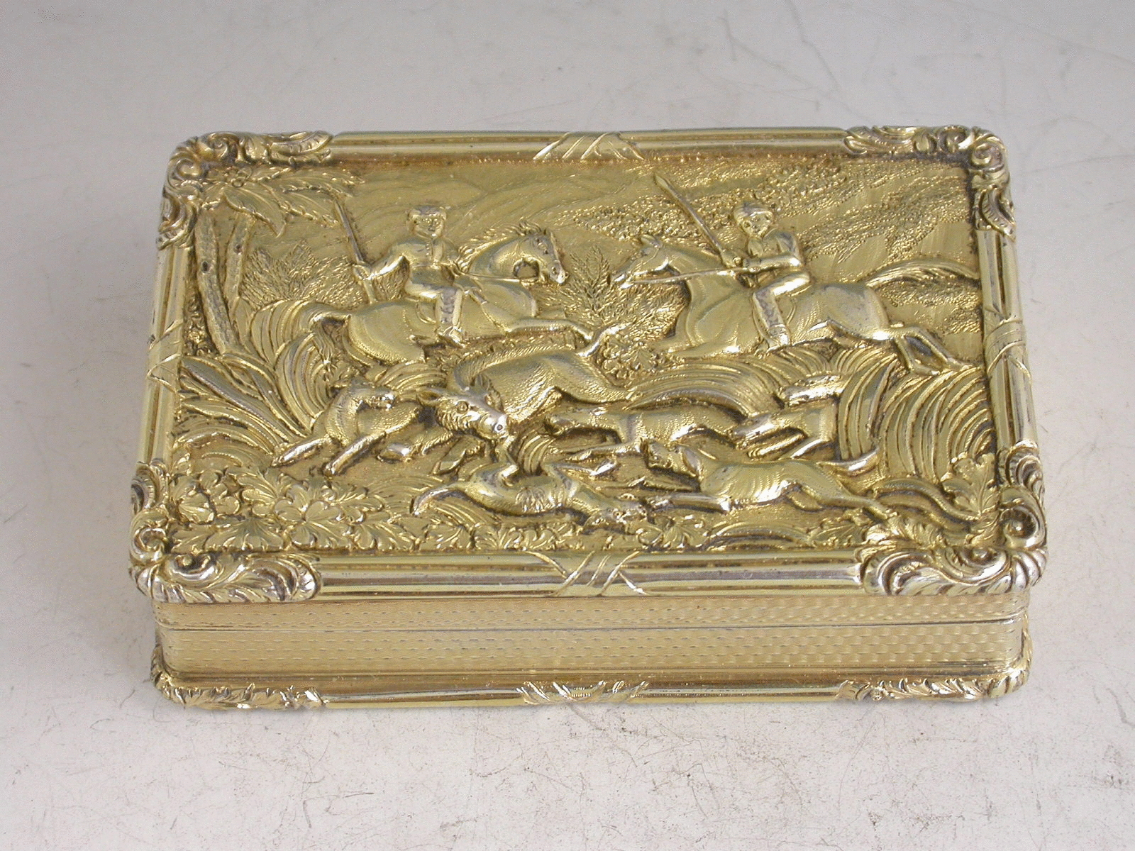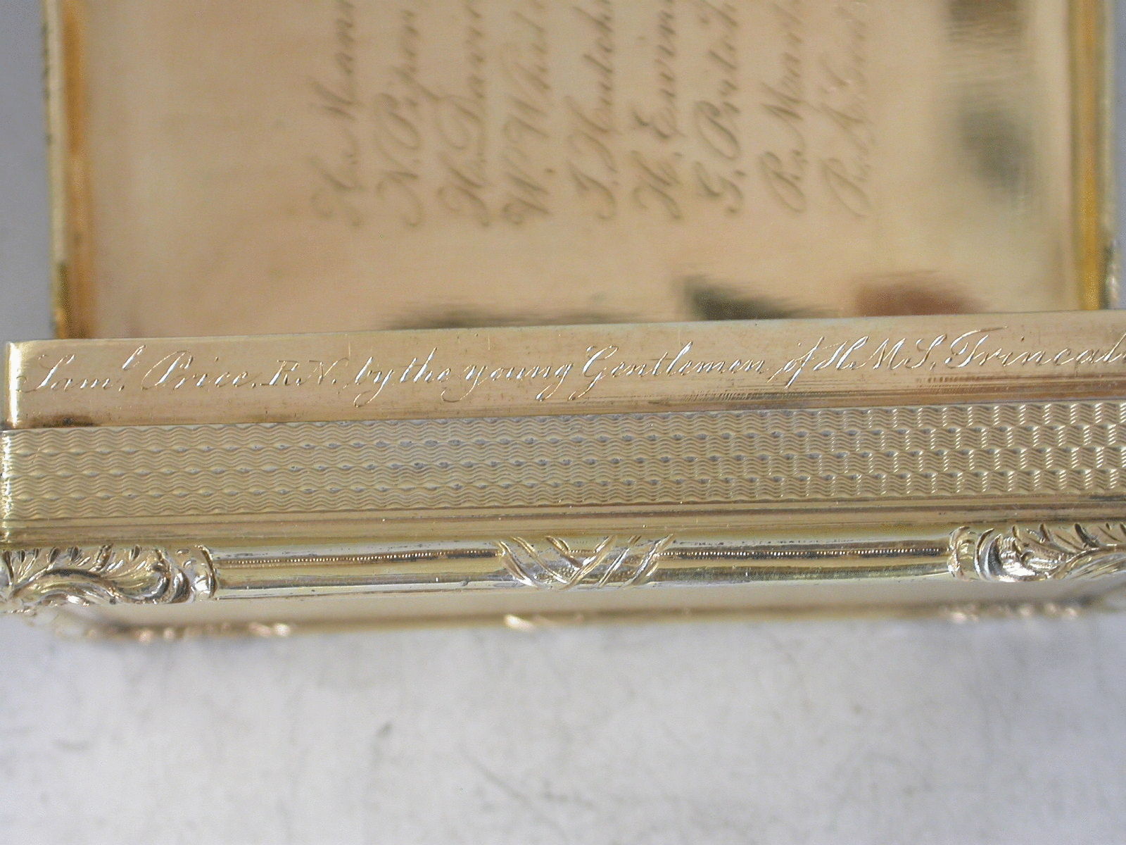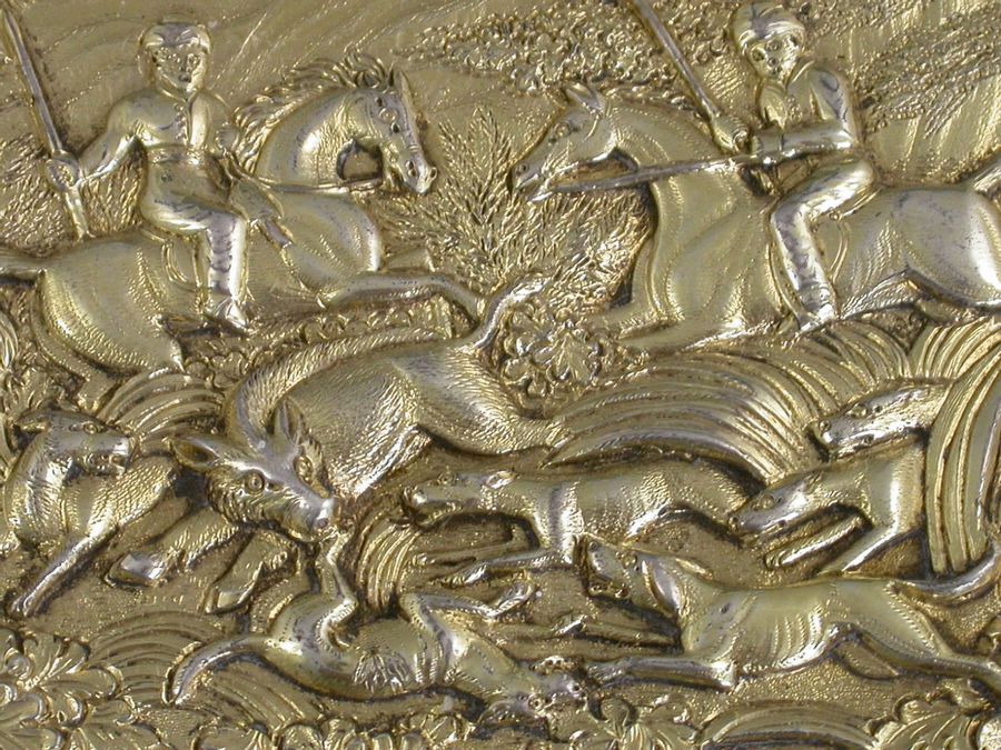 A very fine quality George IV silver gilt Table Snuff Box, the lid depicting an Indian boar hunting scene in high relief, the base and sides with engine turned decoration. The box engraved around the rim: ""Presented June 23rd 1829 to Capt. Saml Price, R.N., by the young Gentlemen of H.M.S. Trincalo as a testimony of their high regard"" and inside the lid the presenters' names are engraved: ""H. Mann, N. Pipon, H. Davies, W. White, I. Hutchins, G. Pritchett, R.Martin, R.A. Godson"". Trincalo would seem to be an engraver's misspelling for H.M.S. Trinculo, a 16 gun sloop launched in 1809. A Naval General Service Medal with clasp for Basque Roads 1809 named to Midshipman Samuel Price was sold in London by Spink in 2005 and he (1793-1852) appears to have been the same officer as the recipient of this box. Price was not promoted to Captain until 1831 but, although only a Commander at the time of the presentation he may have been an acting captain or referred to as Captain by his midshipmen as he was commanding their ship.