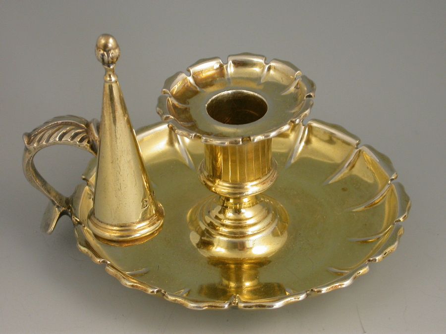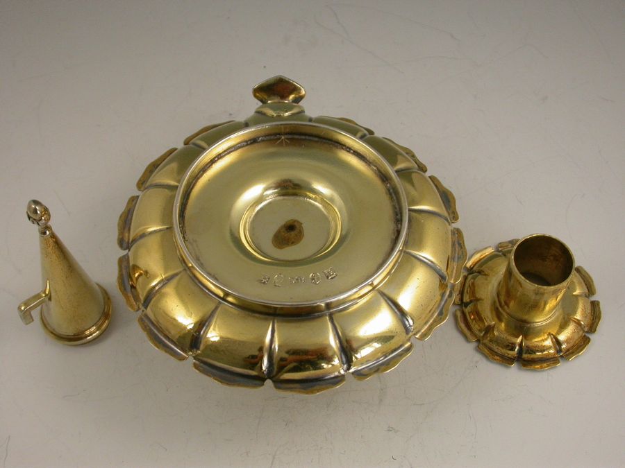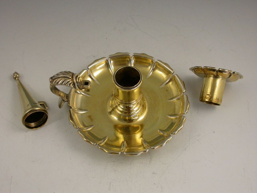 A good George IV silver gilt Chamberstick and Snuffer of circular form with shaped fluted borders and leaf capped scroll handle, plain conical snuffer.
