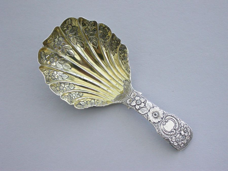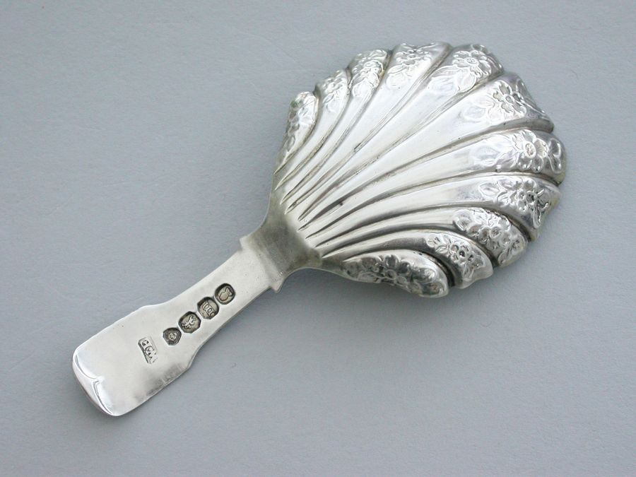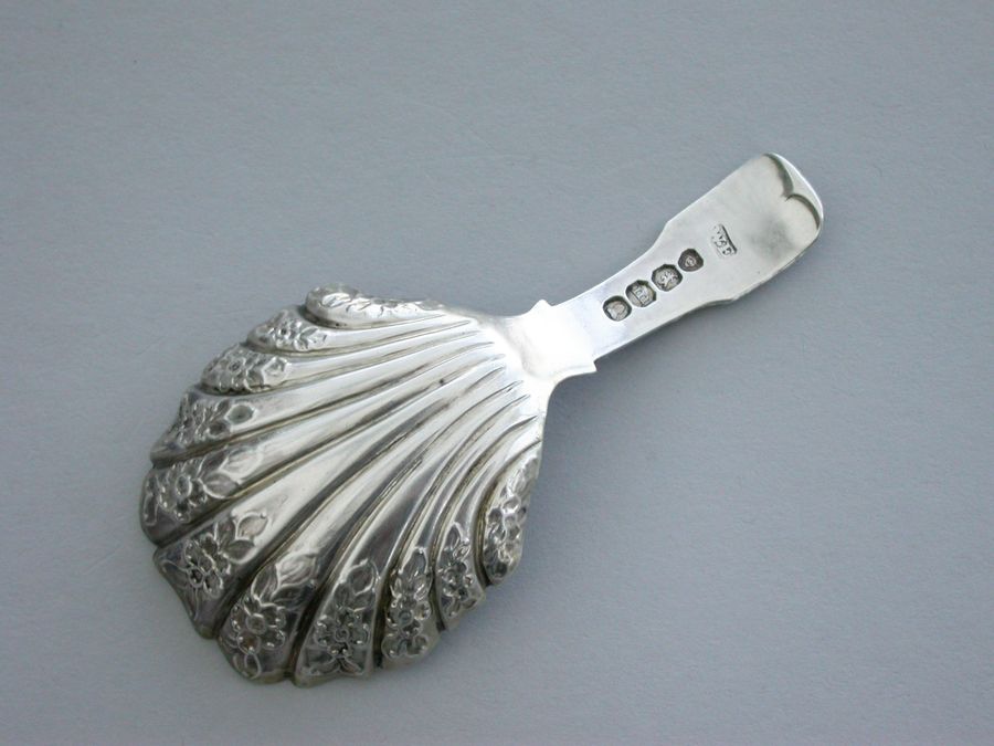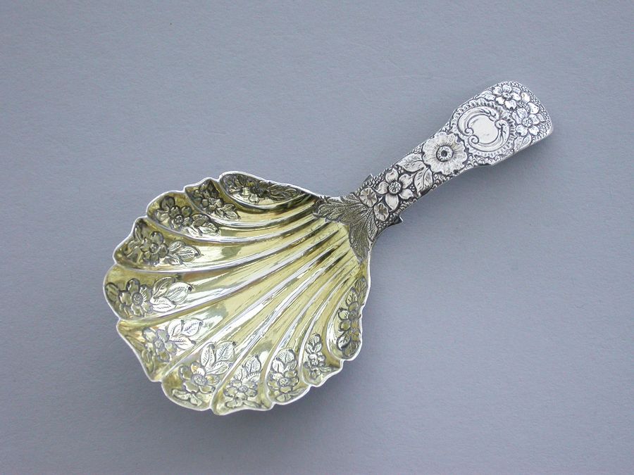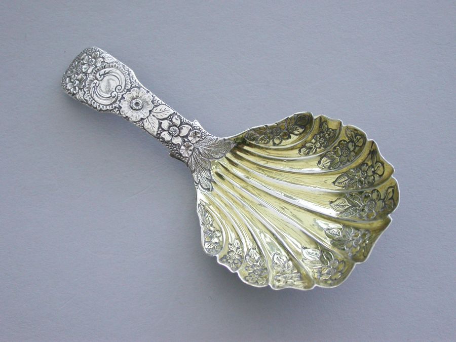 A good quality George IV London made silver Caddy Spoon, the large fluted shell shaped bowl stamped with flower heads and gilded, the fiddle pattern handle chased with flower heads on a stippled background.