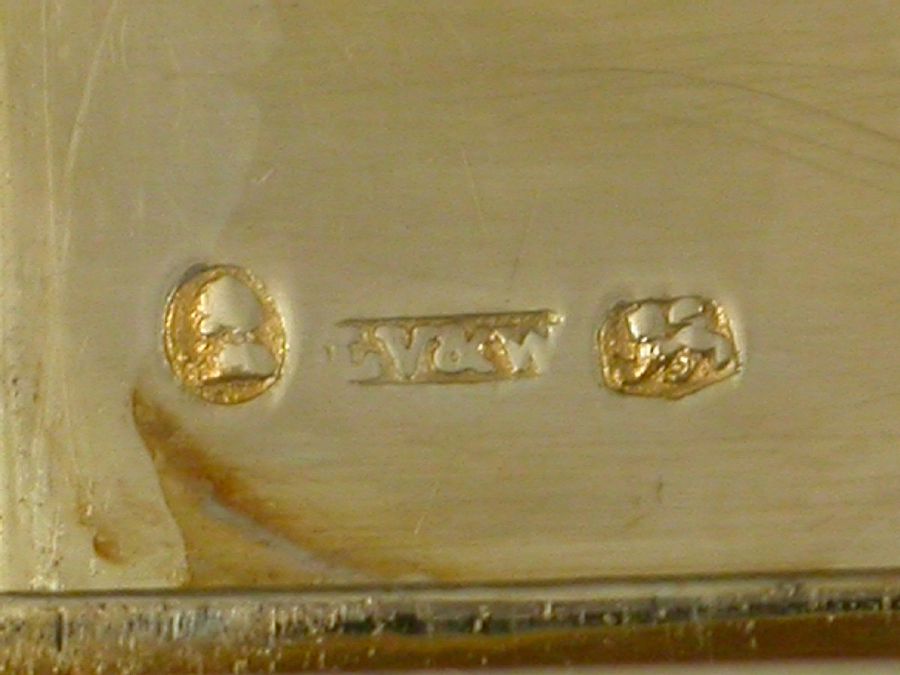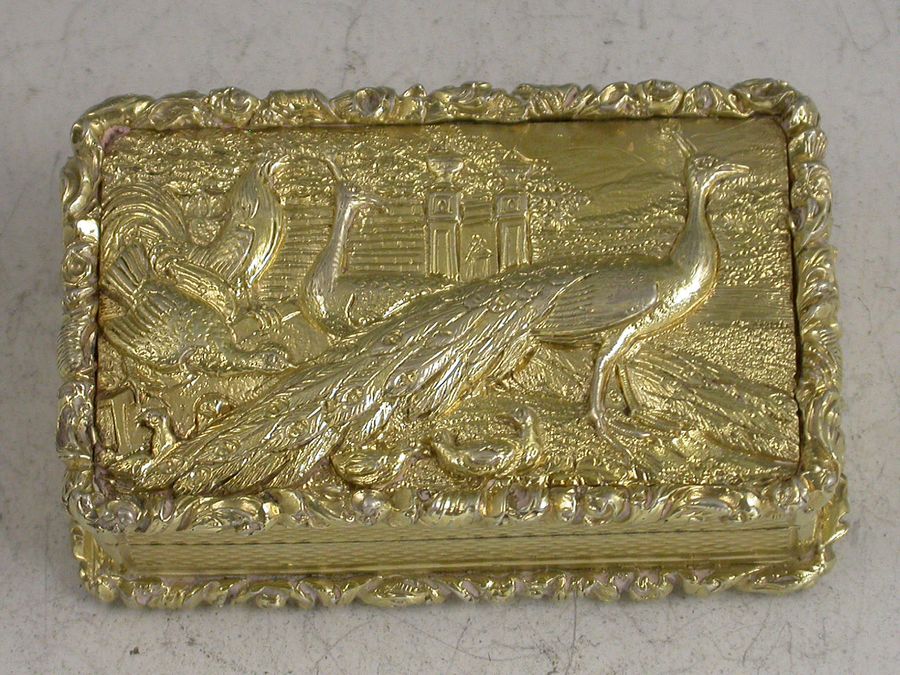 A very fine quality large and heavy silver gilt Vinaigrette of rectangular form with engine turned decoration to the base and sides, raised shell and foliate borders, the lid with a classical scene depicting peacocks and other birds in a parkland setting, a walled garden in the background. Possibly after an original 17th century oil painting by Marmaduke Craddock.